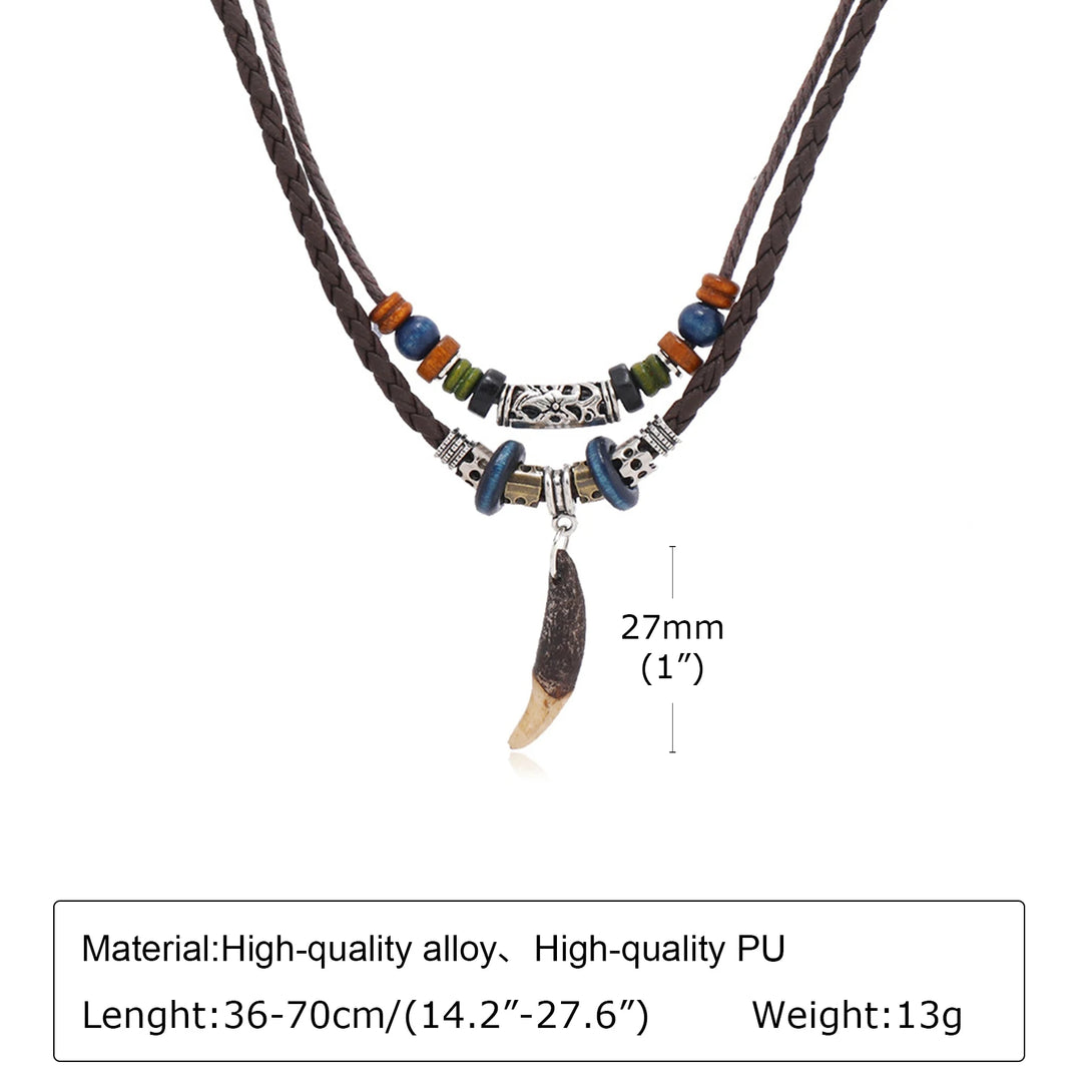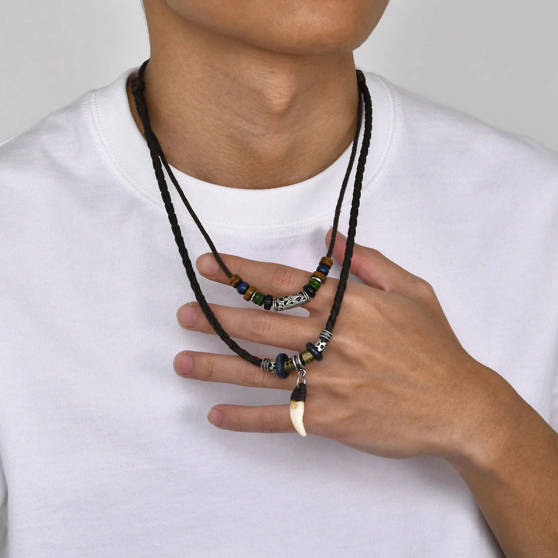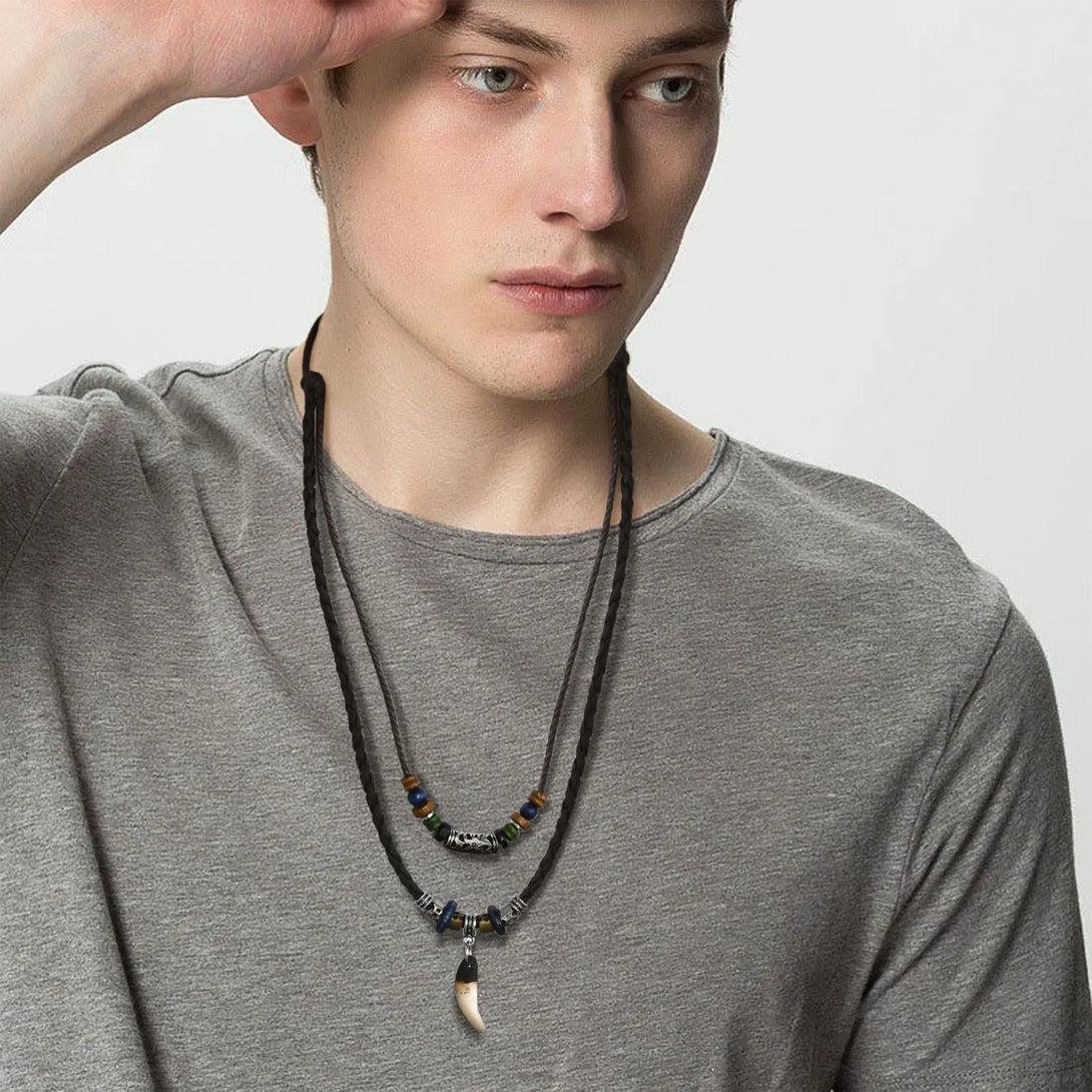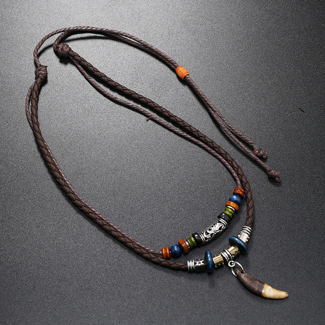 Collar con colgante de diente de perro para hombre, cadena de cuero con cuentas de madera de doble capa, joyería étnica.