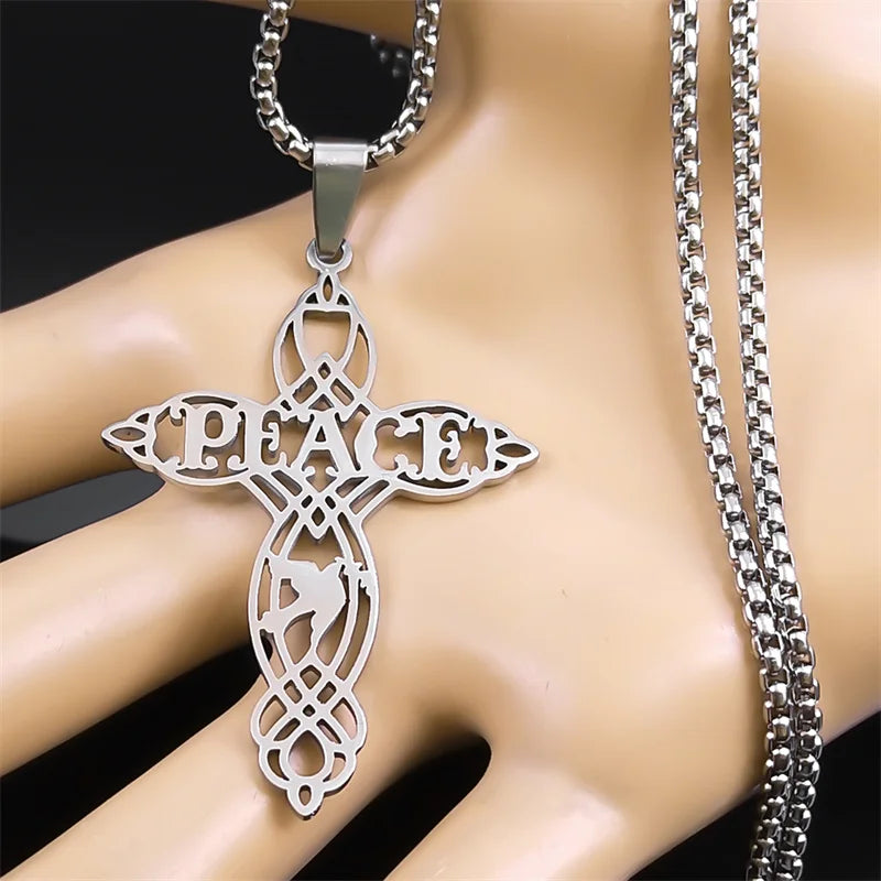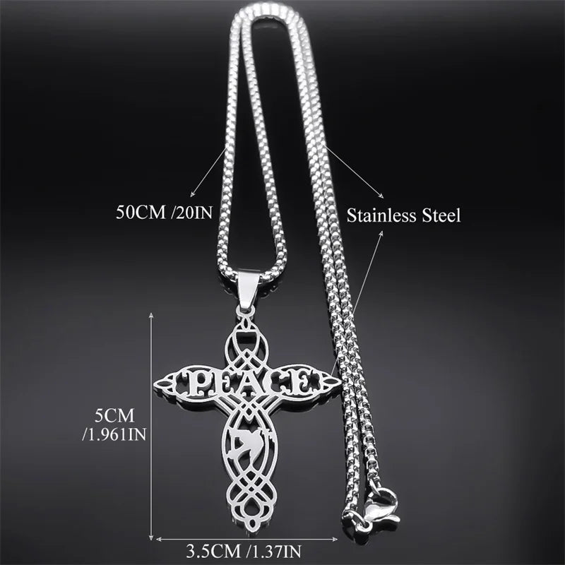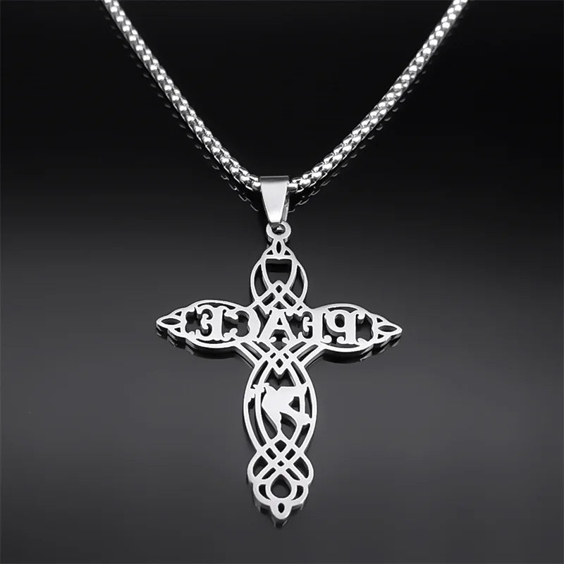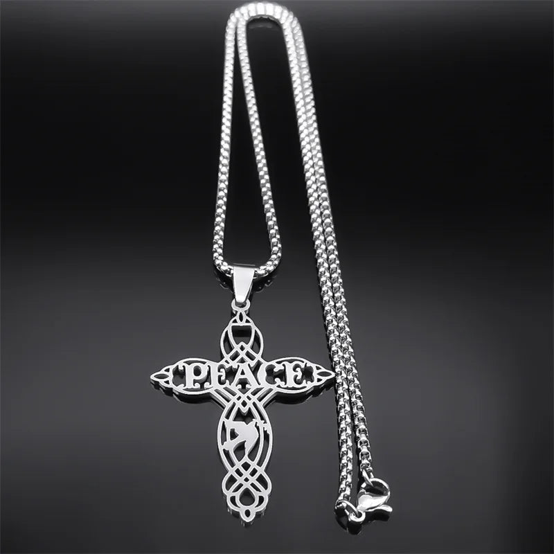 Collar con cruz y letra de paloma de la paz para mujer y hombre, de acero inoxidable, color plata, exquisita cadena de paloma, joyería