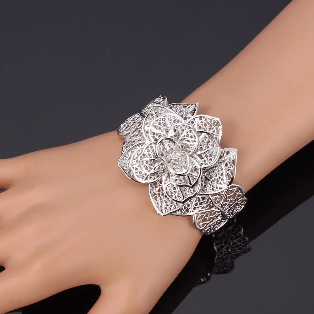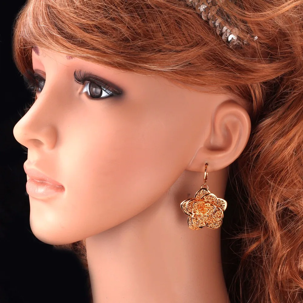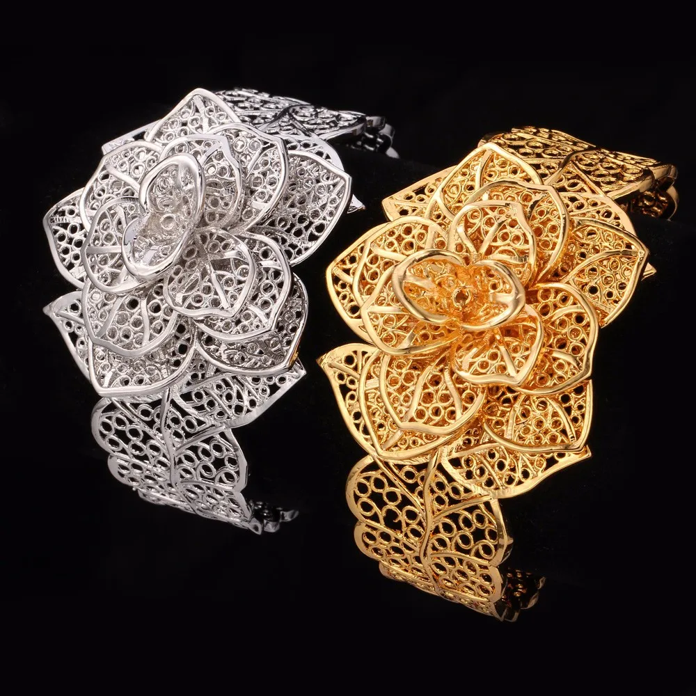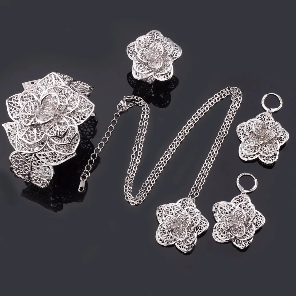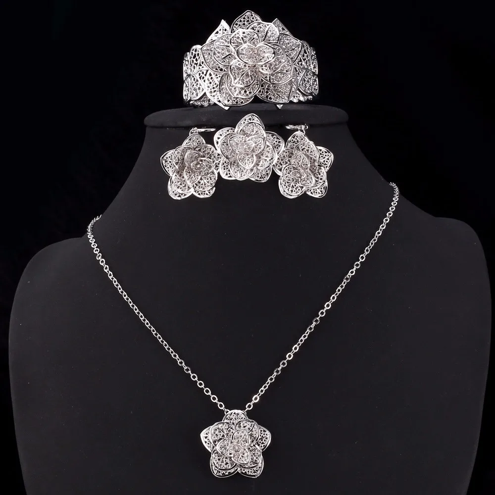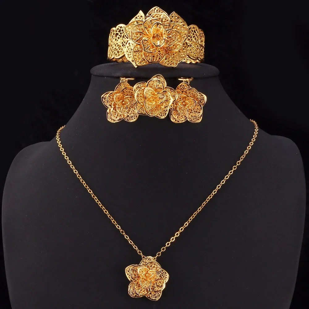 Conjuntos de joyas - Conjuntos de joyas con flores de Dubái, collar, brazalete, pendientes y anillo de oro, conjunto de joyas nupciales para mujer, regalo S56