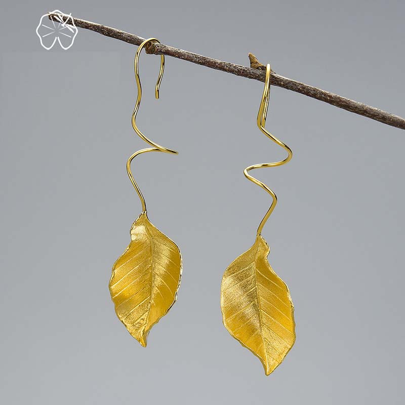 Pendientes de moda: elegantes pendientes colgantes de hojas de otoño, plata de ley 925 auténtica y oro de 18 quilates, regalo para mujer, joyería fina hecha a mano.