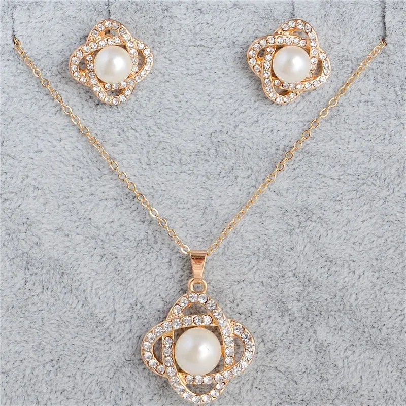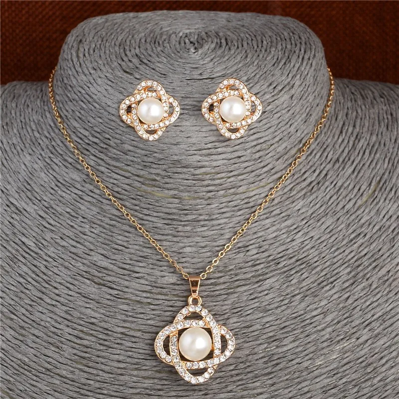 Conjuntos de joyería nupcial: elegantes conjuntos de pendientes y collar para mujer, conjuntos de joyería de color dorado, joyería de perlas de imitación de alta calidad.