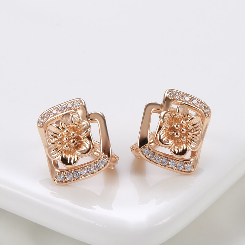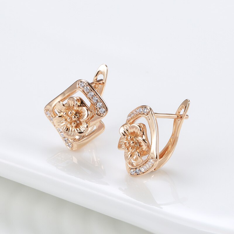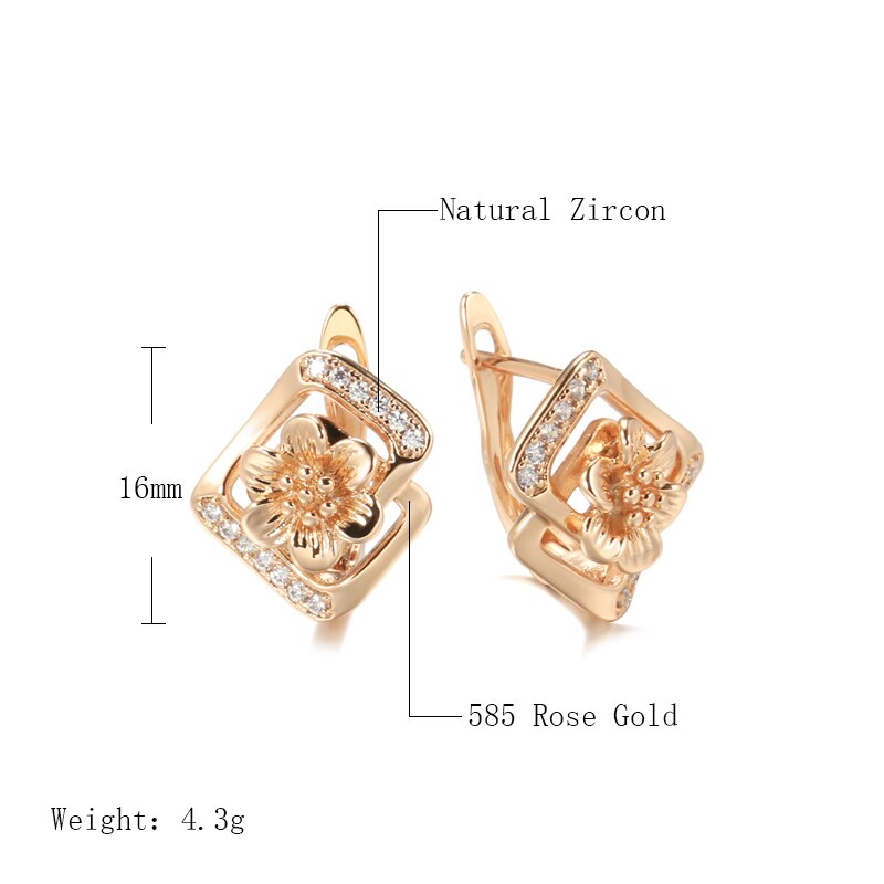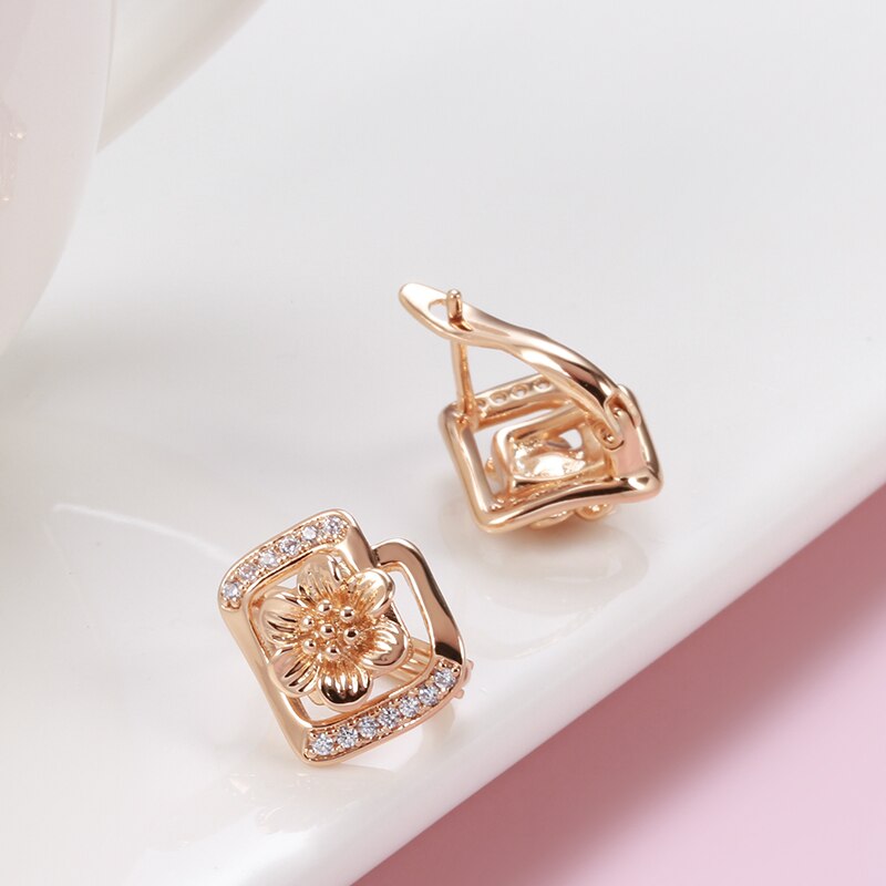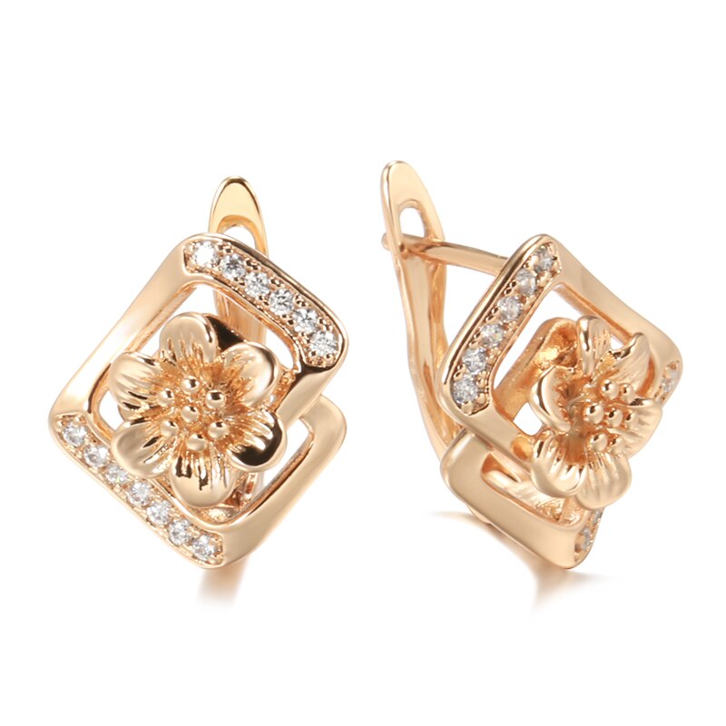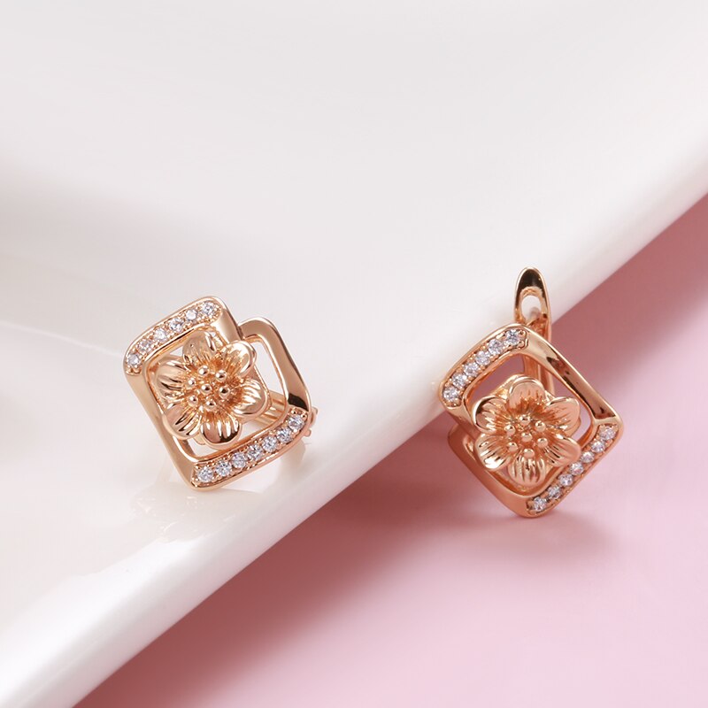 Elegantes pendientes geométricos rectangulares con flores huecas de oro 585 para mujer