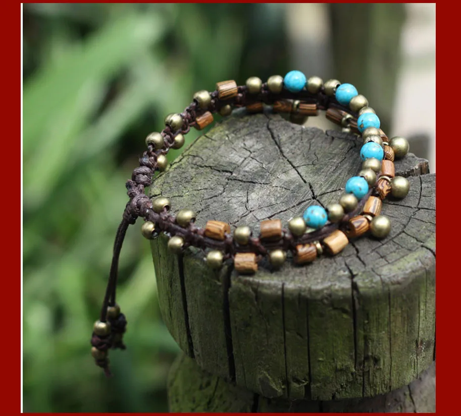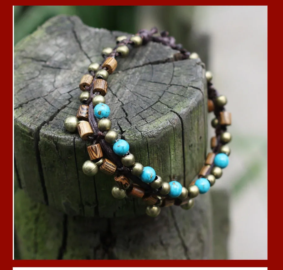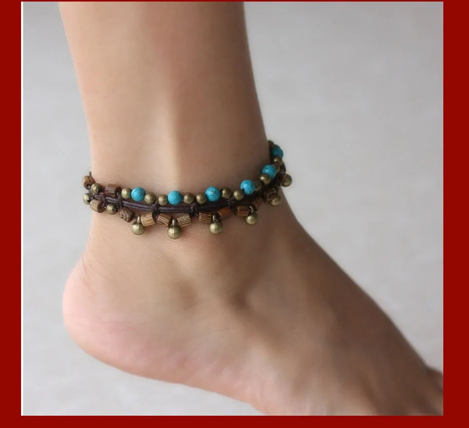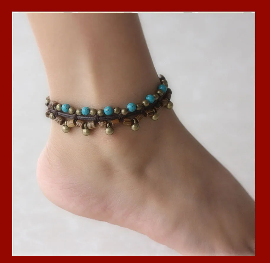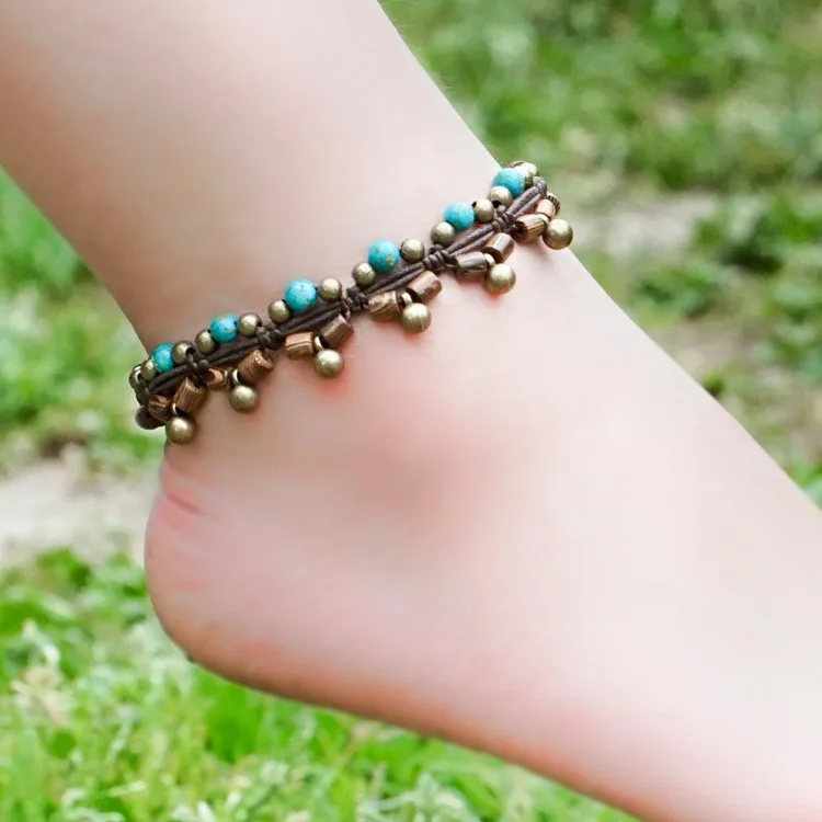 Tobilleras - Tobilleras étnicas de pavo real para mujer con piedras verdes étnicas, nuevas cadenas para pies trenzadas hechas a mano, tobilleras vintage con campana de latón de moda