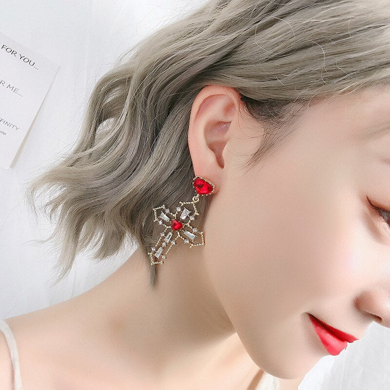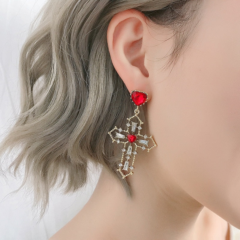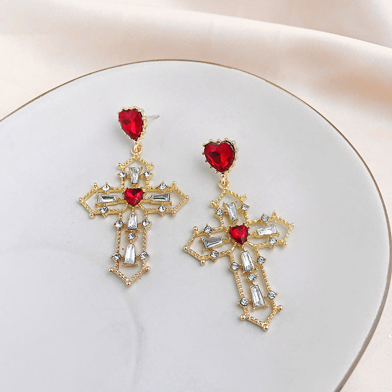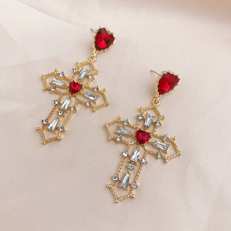 Pendientes de moda - Pendientes de clip con colgante de cruz hueca estilo barroco vintage europeo, pendientes llamativos con forma de corazón rojo y diamantes de imitación, sin perforar para mujer