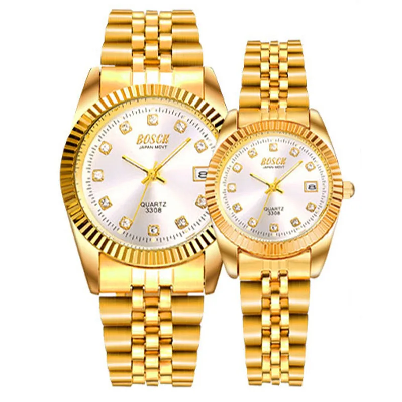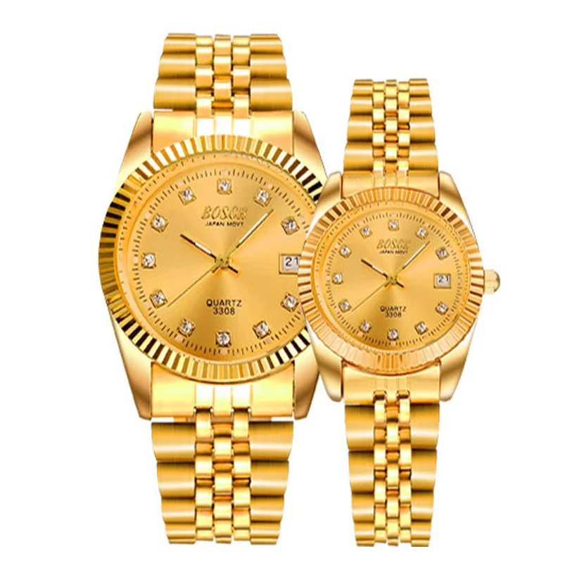 Relojes de pulsera de moda para parejas, reloj de vestir de lujo dorado para mujer
