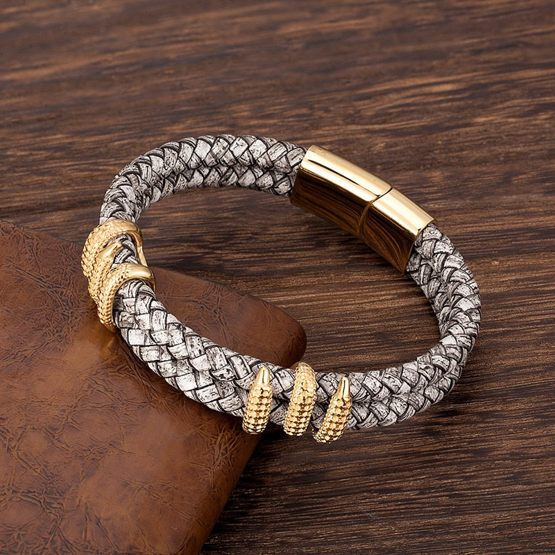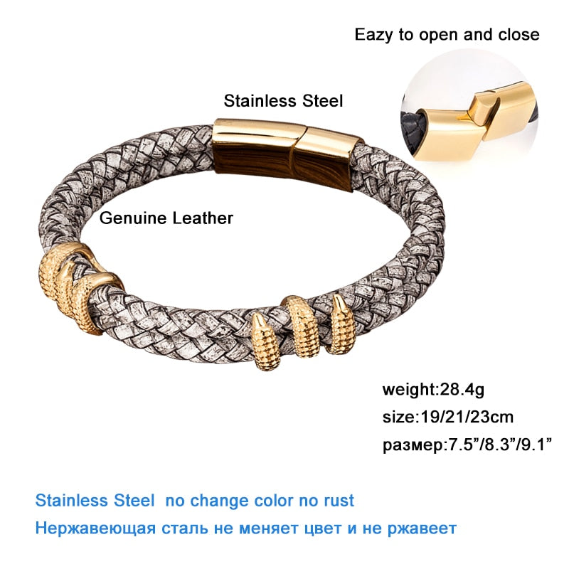 Pulsera de moda para hombre, de acero inoxidable, hecha a mano, de cuerda, de cuero gris vintage, con garra de dragón dorada, joyería punk, accesorios de regalo