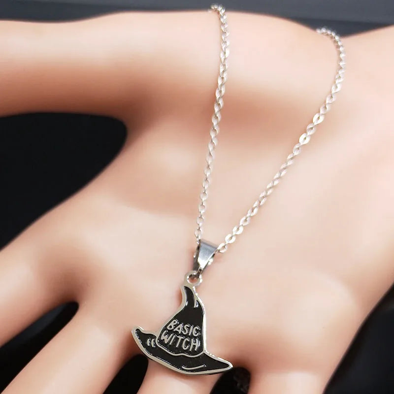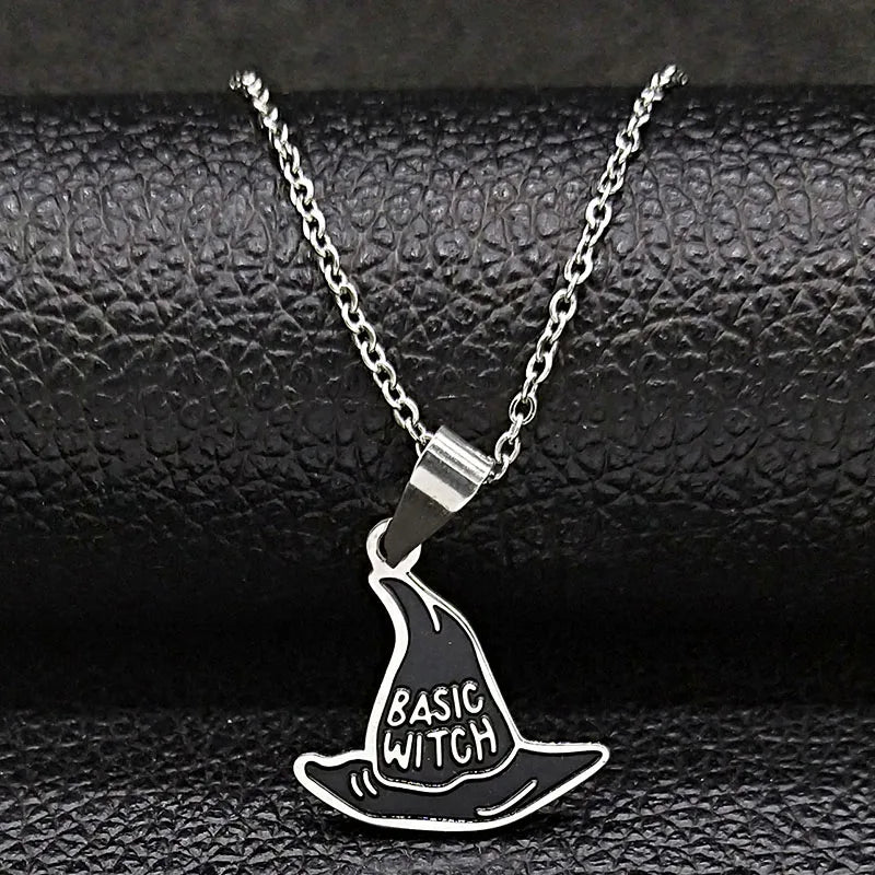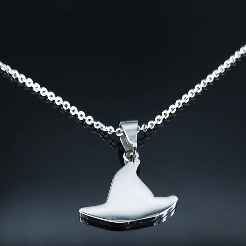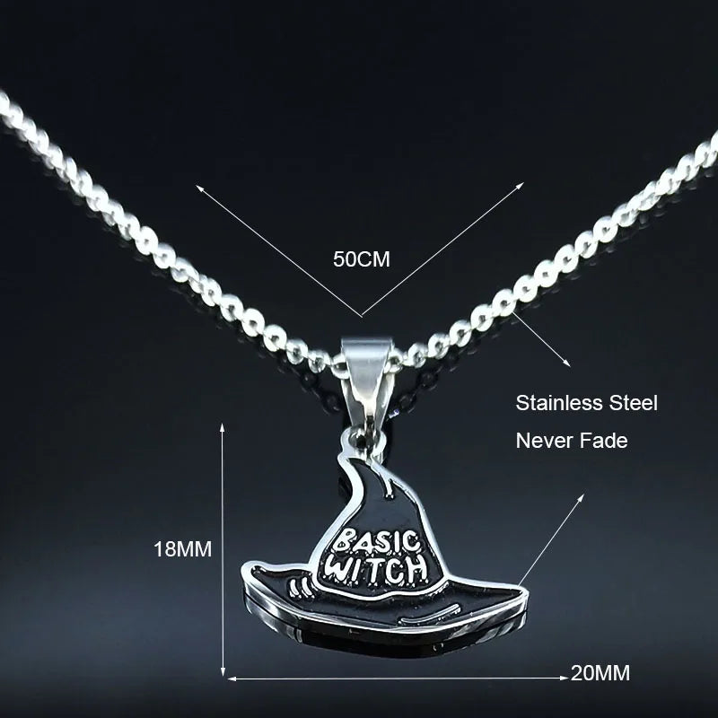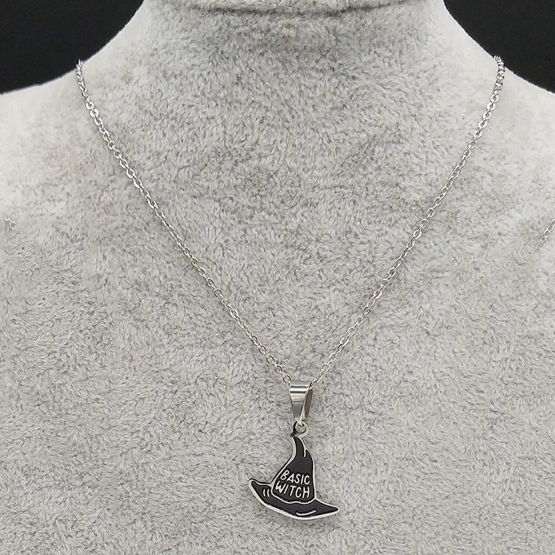 Collar básico de bruja de acero inoxidable de moda para mujeres y hombres, collar con colgante de sombrero de brujería.