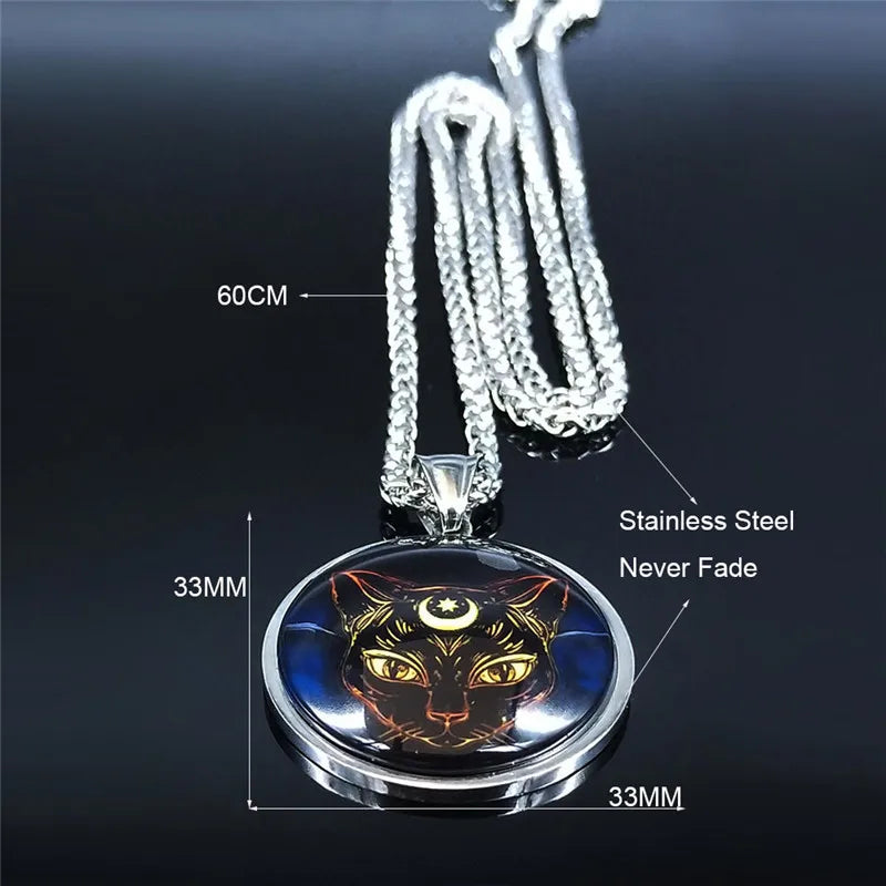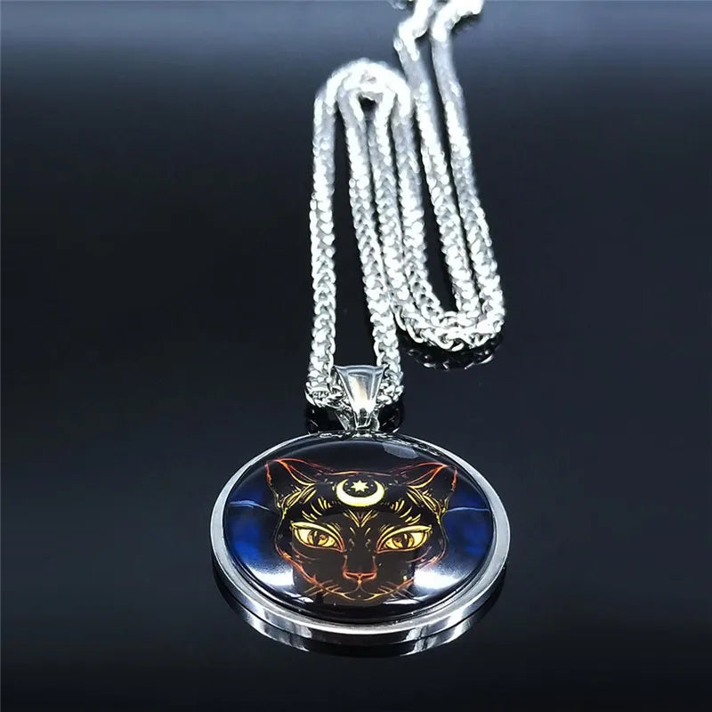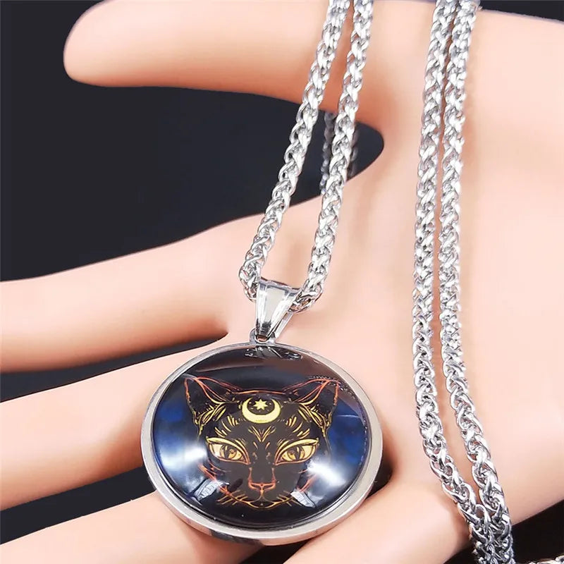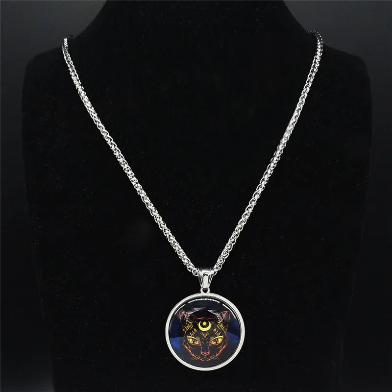 Collar de cadena de acero inoxidable con diseño de gato brujo para mujer, colgante largo de color plateado, joyería para hombre