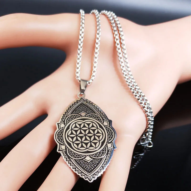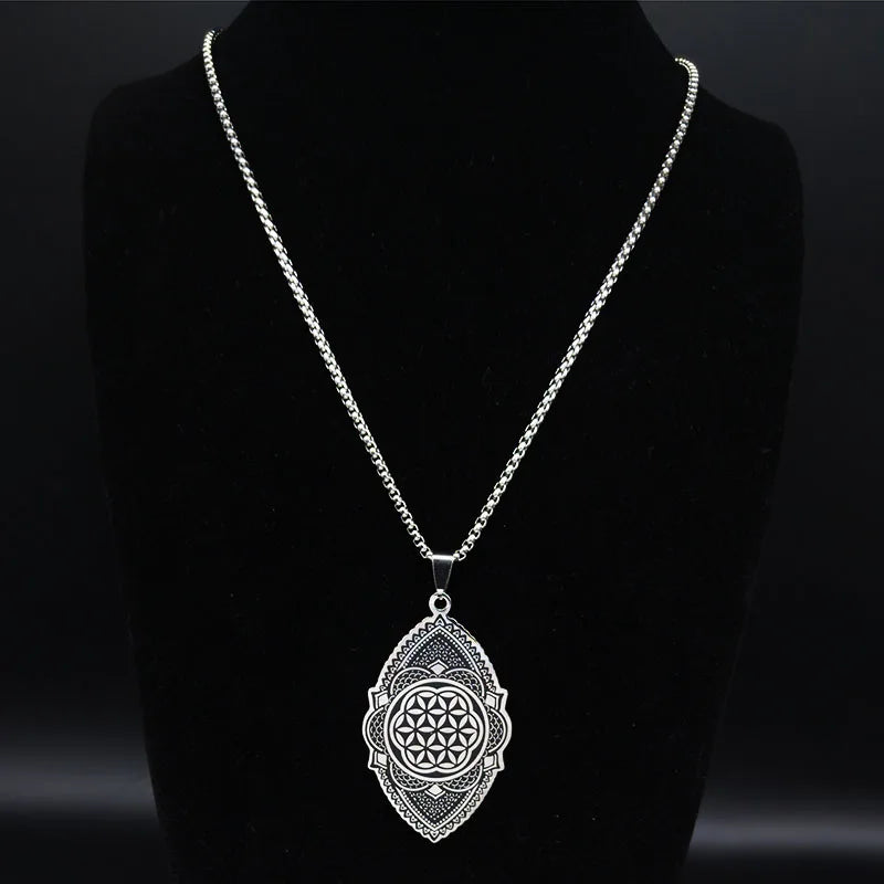 Estilo: Collar budista de chakras de acero inoxidable con la flor de la vida