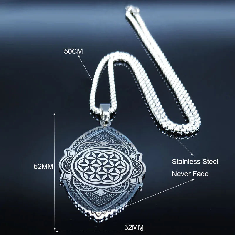 Collar de chakras budistas de acero inoxidable con flor de la vida para mujer, color plata, esmalte negro, cadena larga grande, joyería, flores de vida