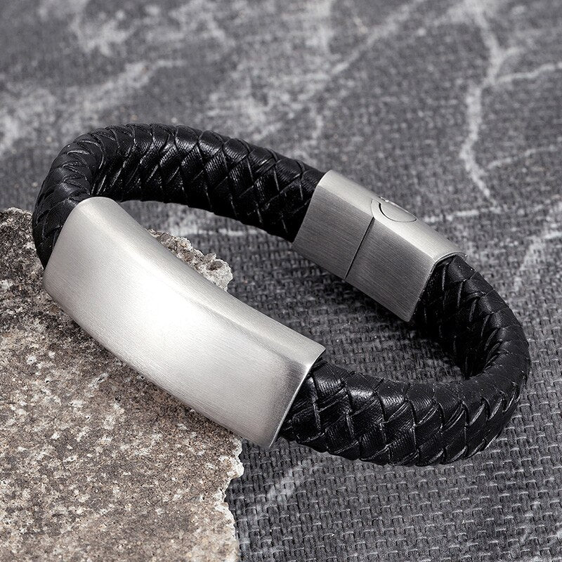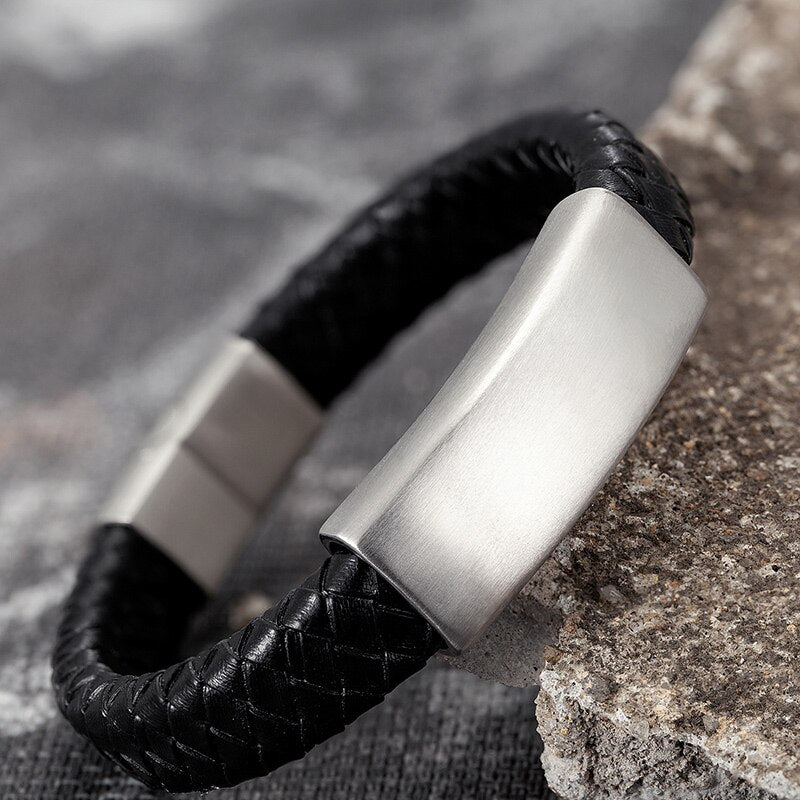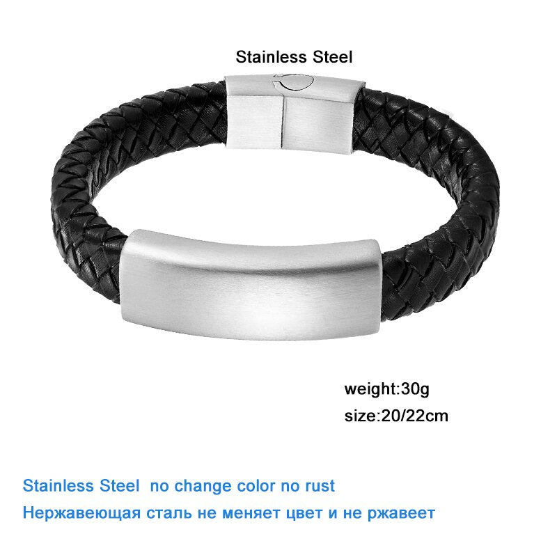 Pulseras de cuero negro genuino para hombre, acero inoxidable, accesorios de lujo hechos a mano para niños, regalo de cumpleaños, joyería de moda.