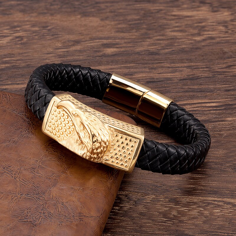 Pulsera de cuero genuino color dorado, joyería de acero inoxidable de lujo para hombres, pulsera de cuerda de mano punk, abalorio, accesorios al por mayor, regalo