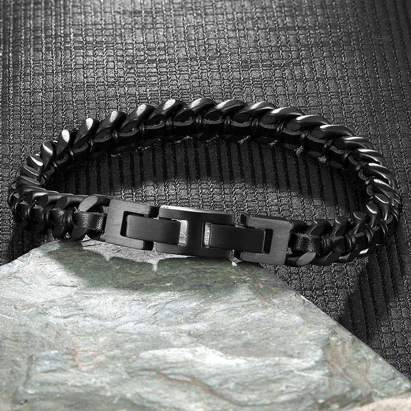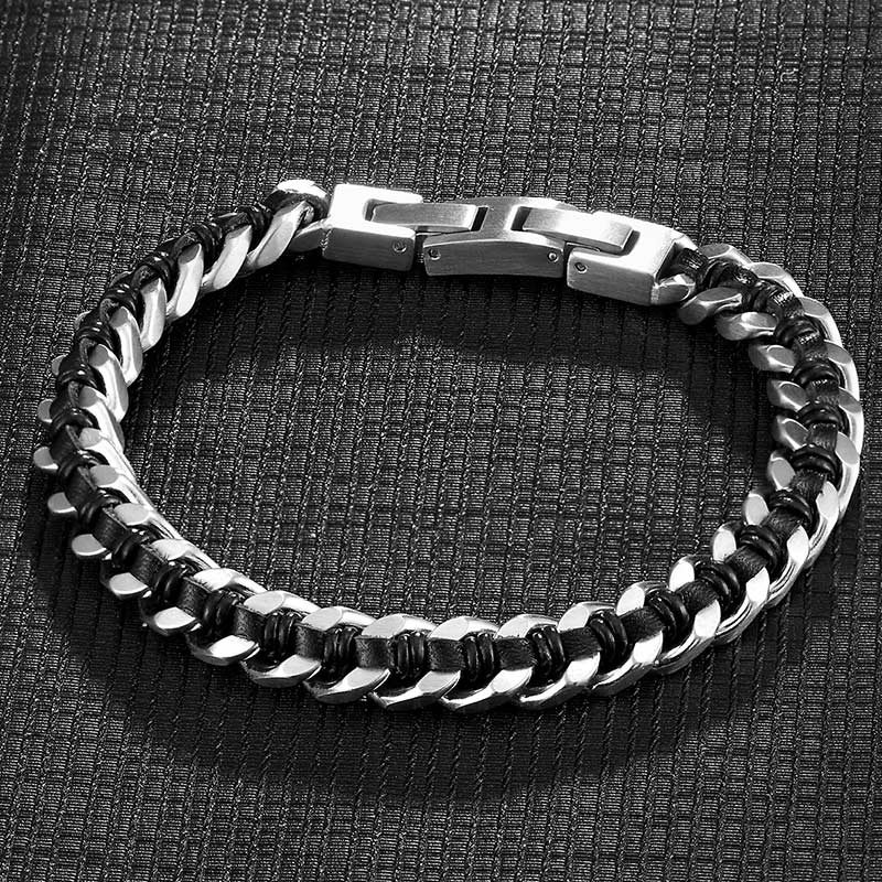Pulsera de cuero genuino para hombre, cadena de eslabones de acero inoxidable