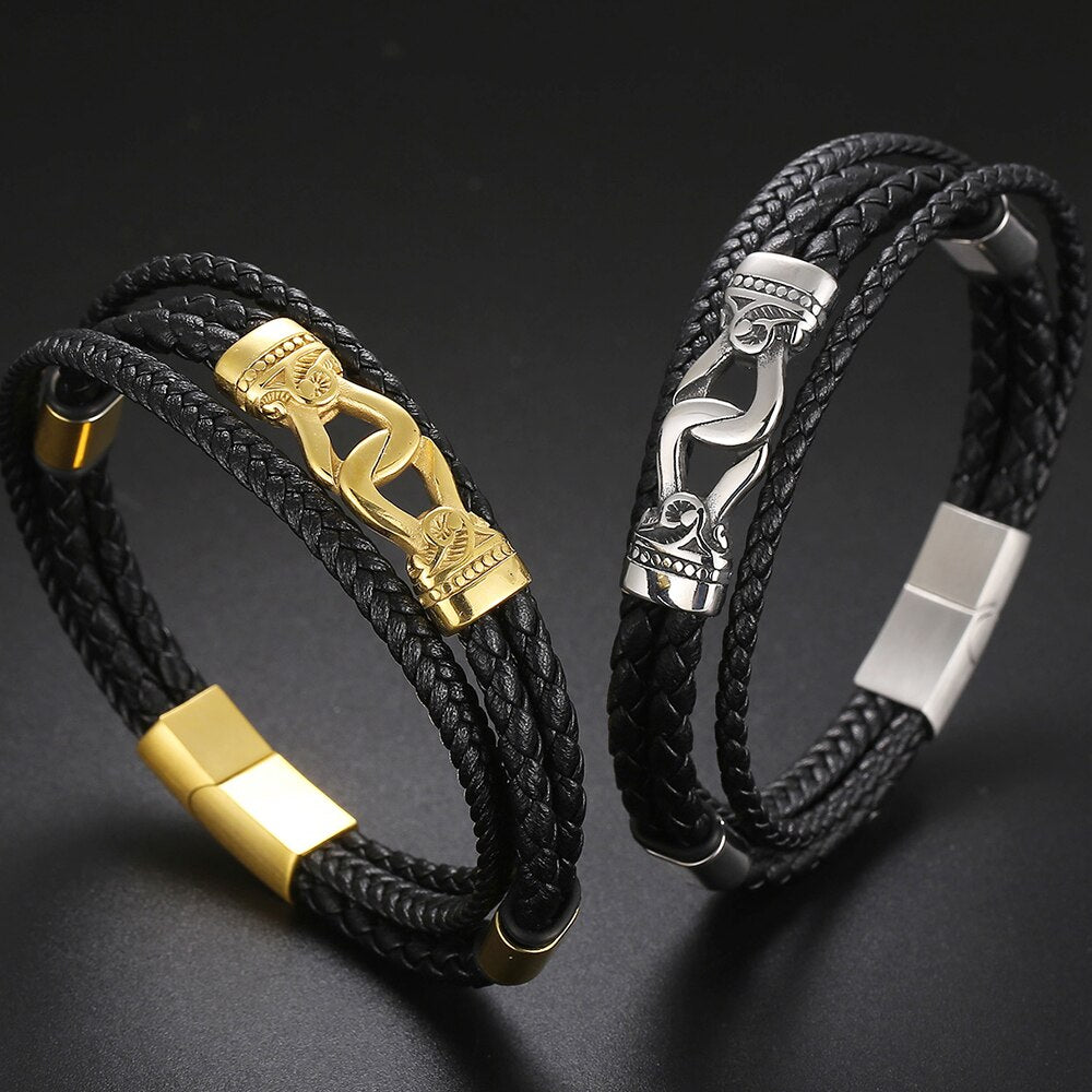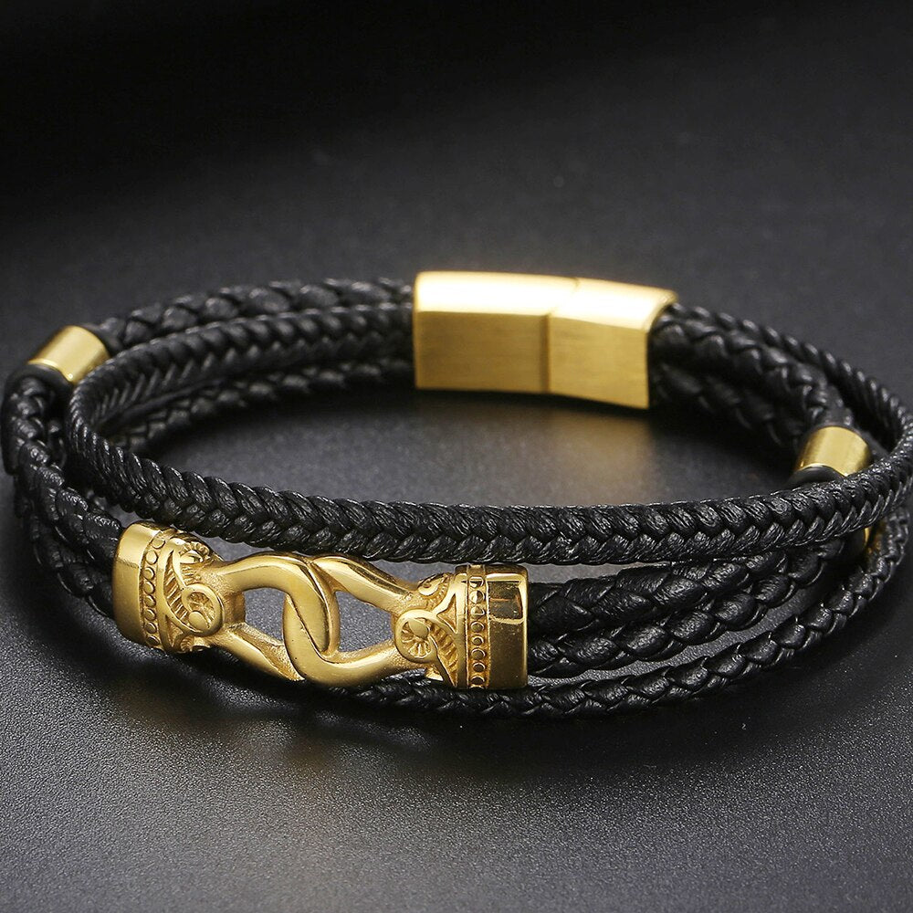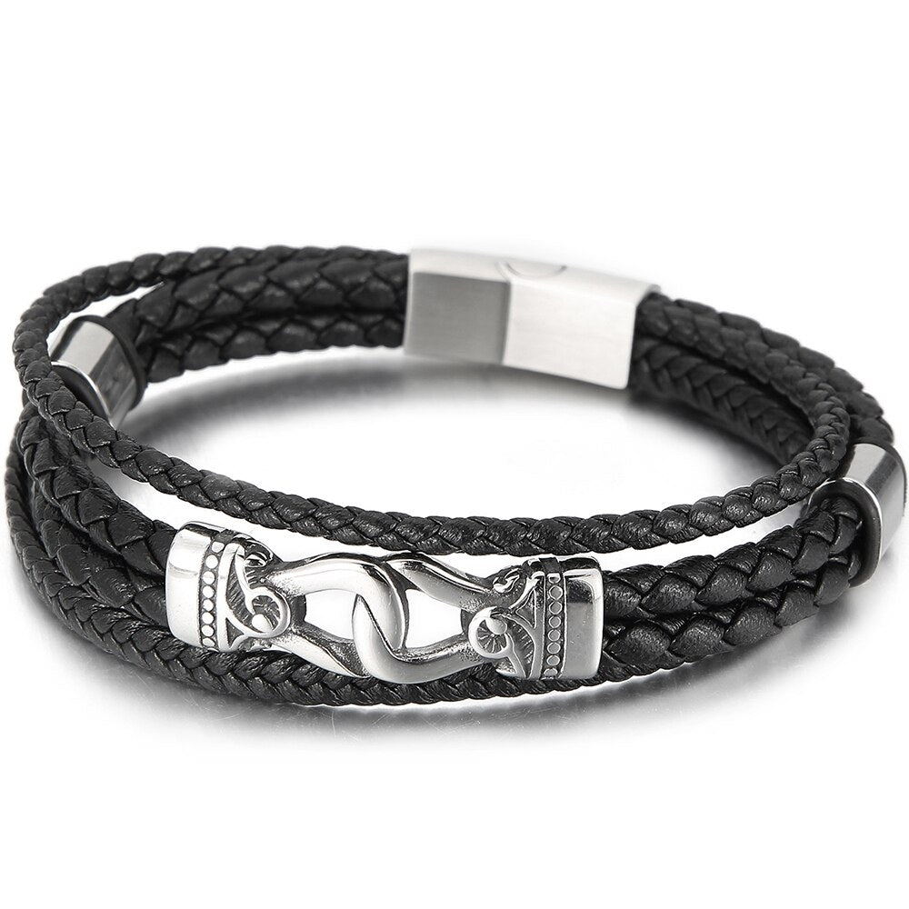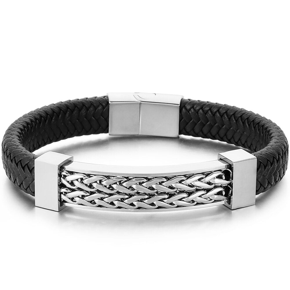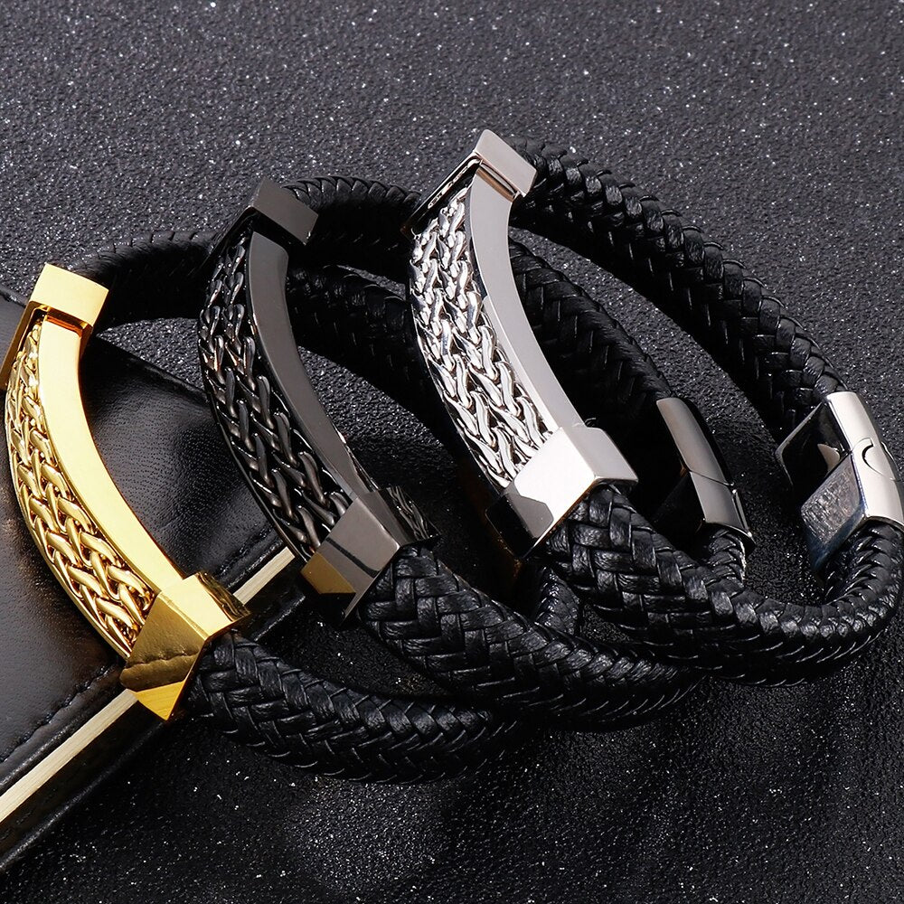 Pulsera de cuero genuino para hombre, pulsera de cuerda trenzada de acero inoxidable negro para hombre.