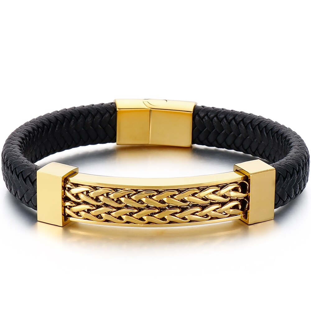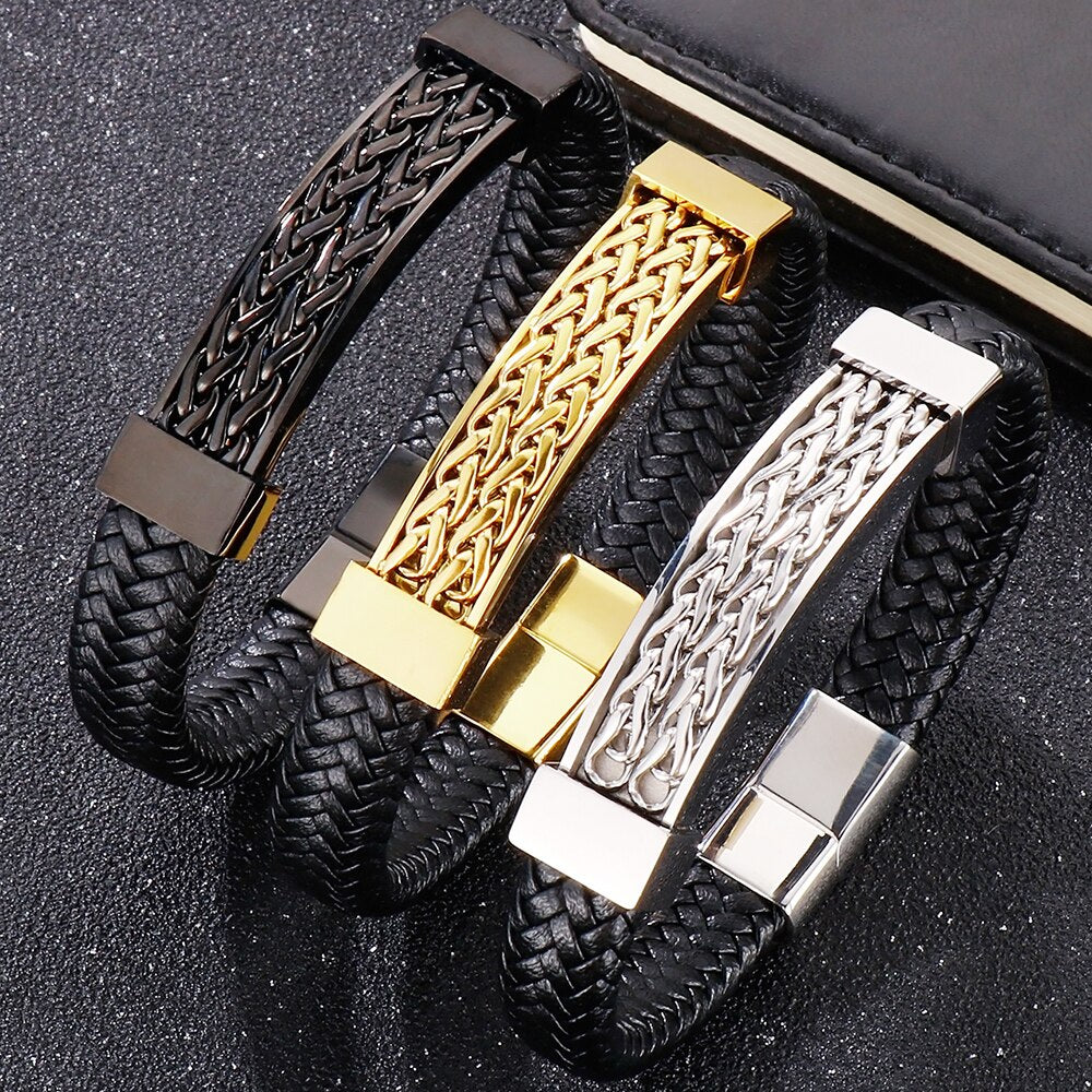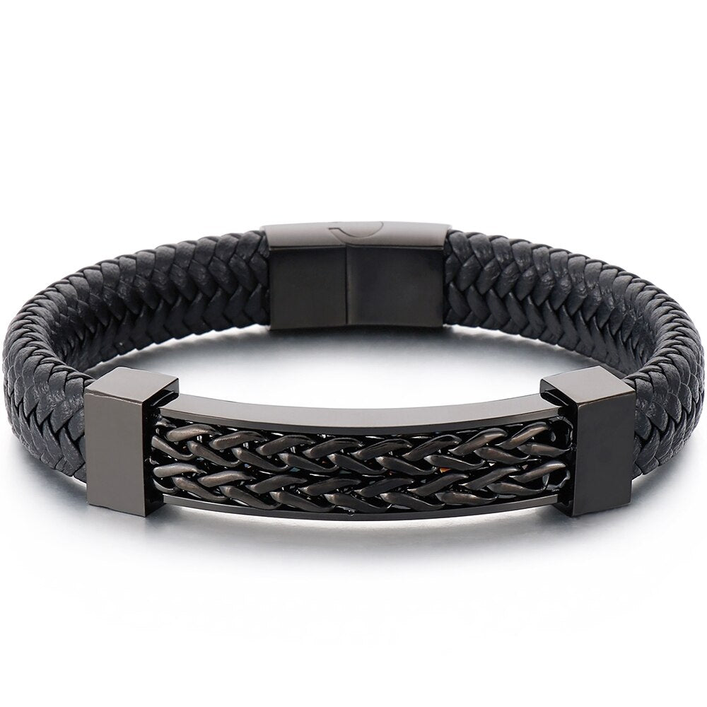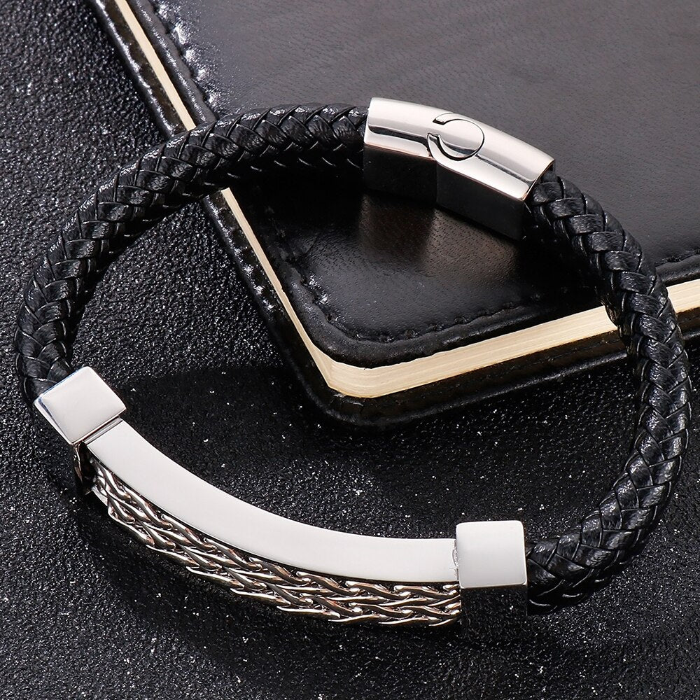 Pulsera de cuero genuino para hombre, pulsera de cuerda trenzada de acero inoxidable negro para hombre, joyería masculina, artículos al por mayor grabables