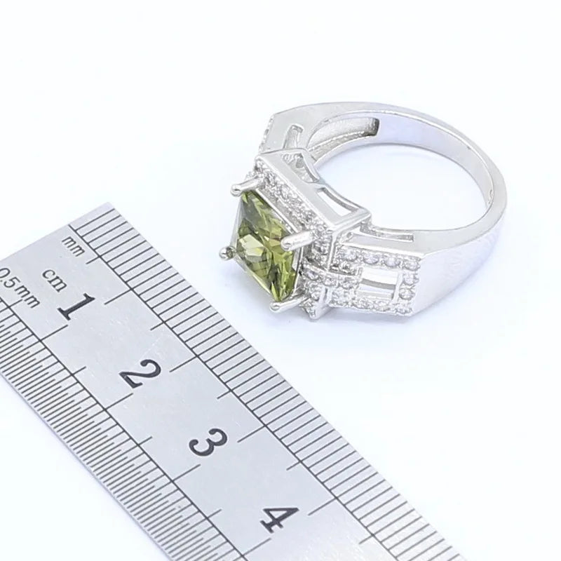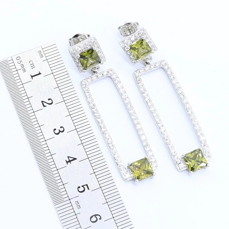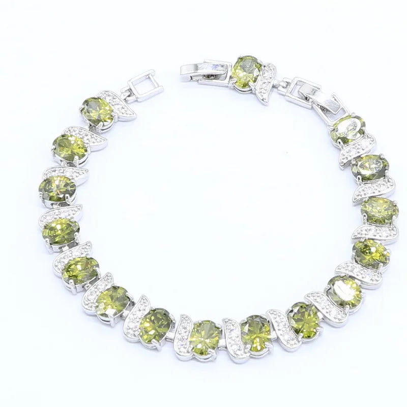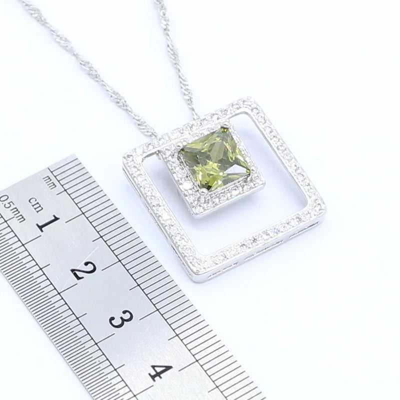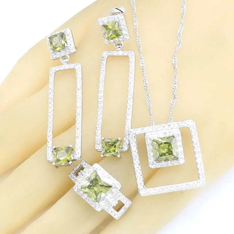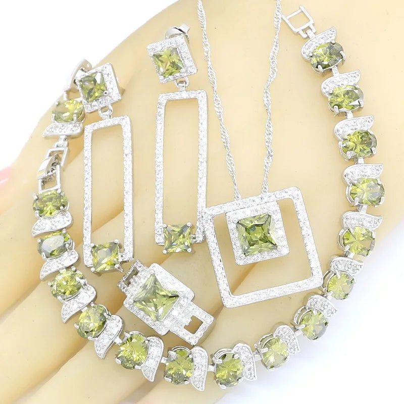 Conjunto de joyas geométricas de circonita verde oliva en color plata para mujer, pulsera, collar, colgante, pendientes, anillo, caja de regalo