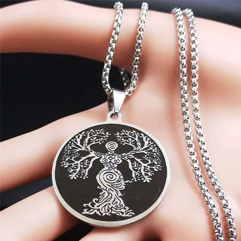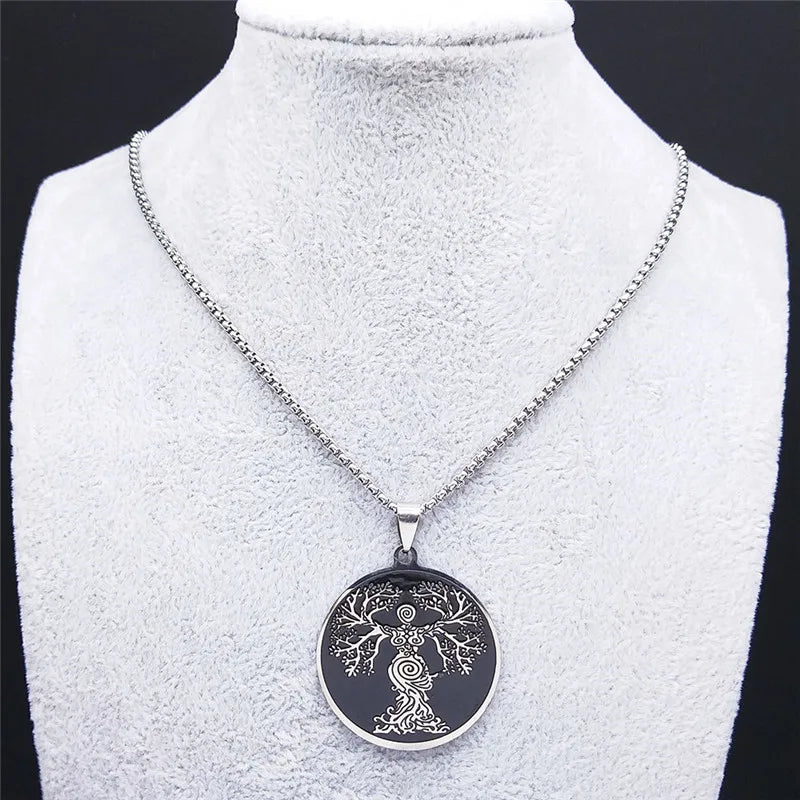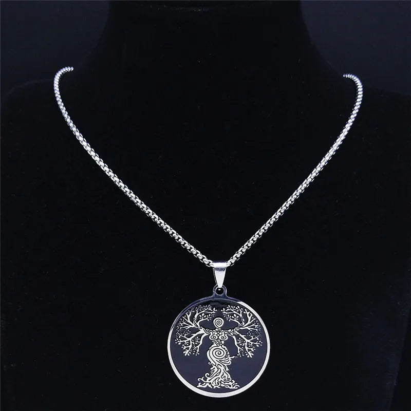 Collar de cadena de acero inoxidable con el Árbol de la Vida de la Diosa para mujer, color negro y plateado.