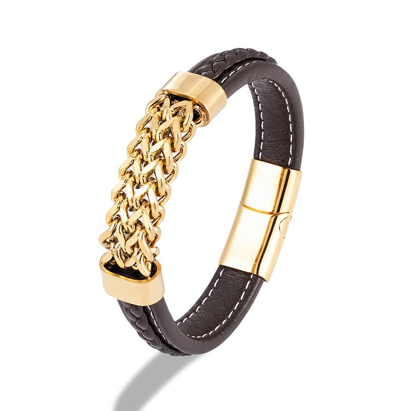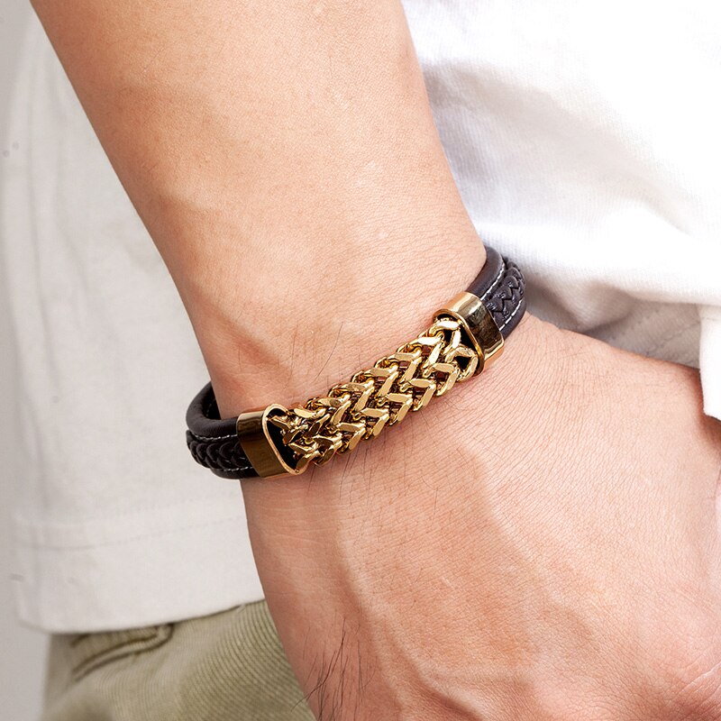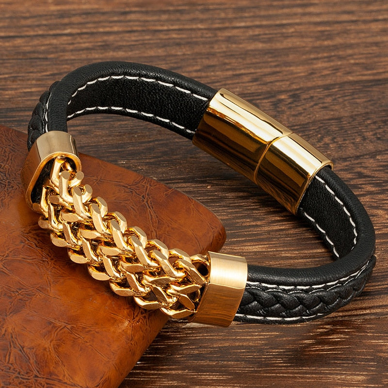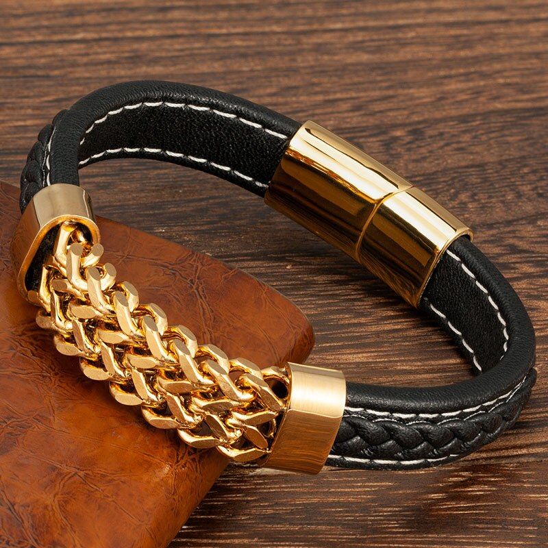 Pulsera de cuero de acero inoxidable con cadena dorada para hombre, accesorios punk de lujo a la moda.