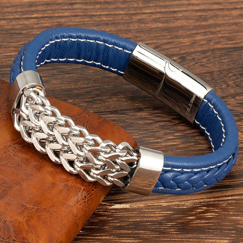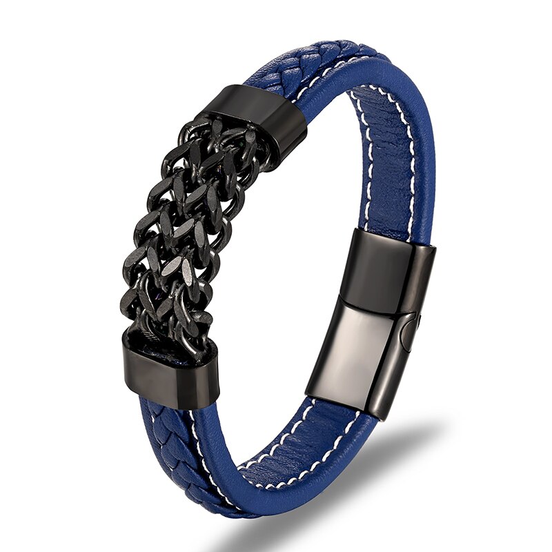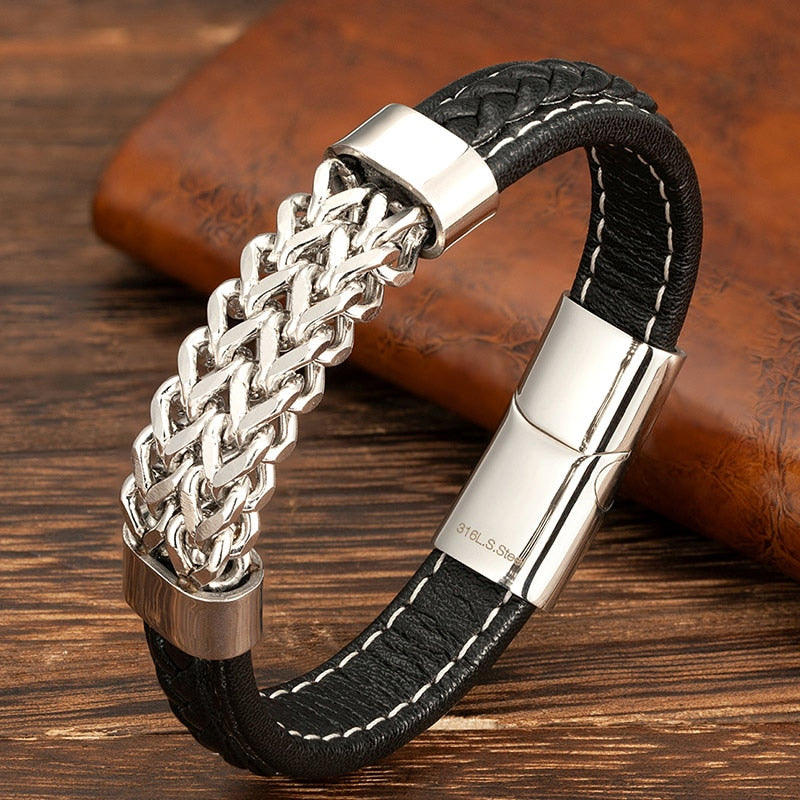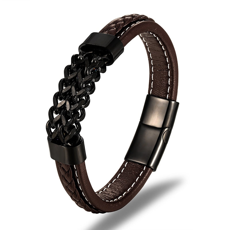 Nombre: Pulsera de cuero y cadena para hombre Tamaño: 19 cm/21 cm/23 cm Material: acero inoxidable 316L Consejos: Envío directo y servicios personalizados están disponibles