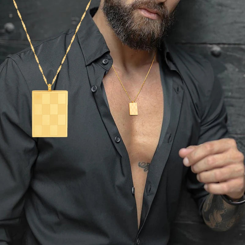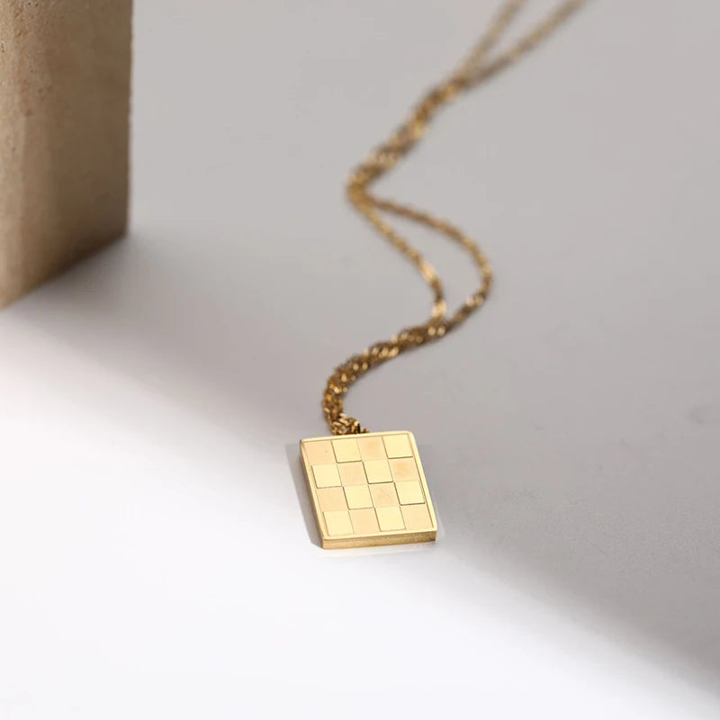 Collar de cuadros dorados para hombre y mujer, colgante de ajedrez de acero inoxidable, collar de capas