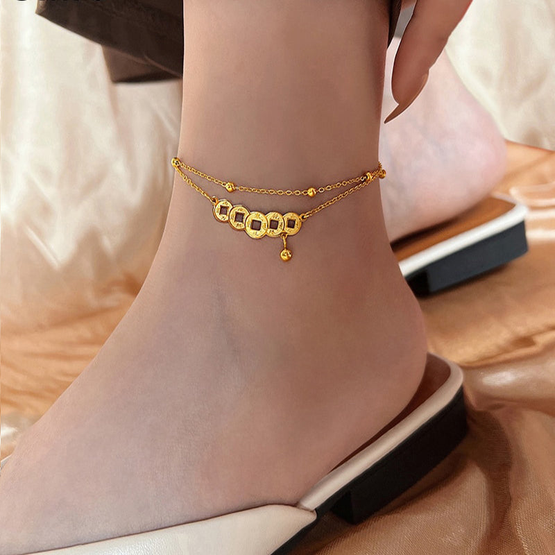 Joyería de oro 585 - Tobillera de acero inoxidable 316L de doble capa en forma de moneda para mujeres y niñas, accesorio para el pie, ideal para fiestas.