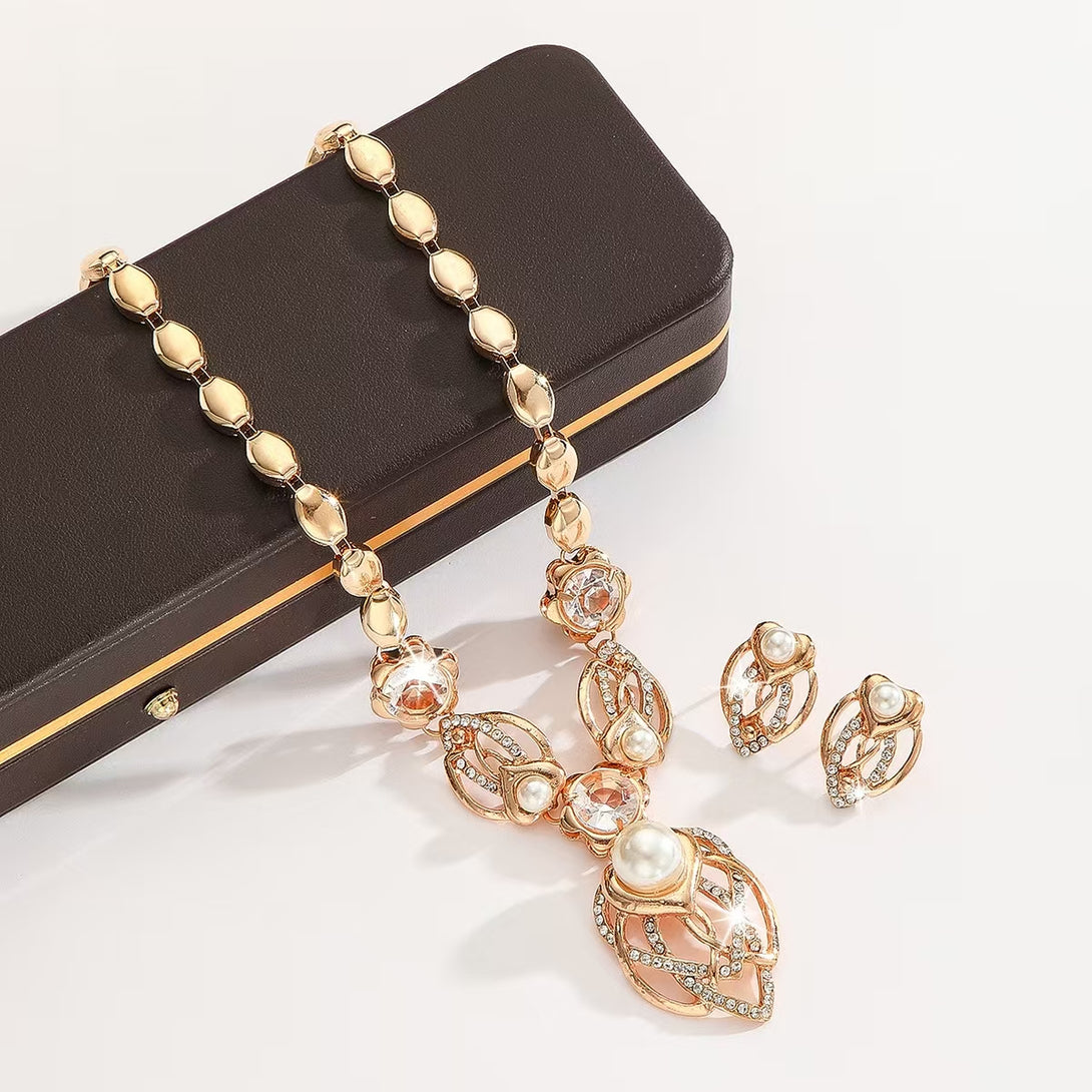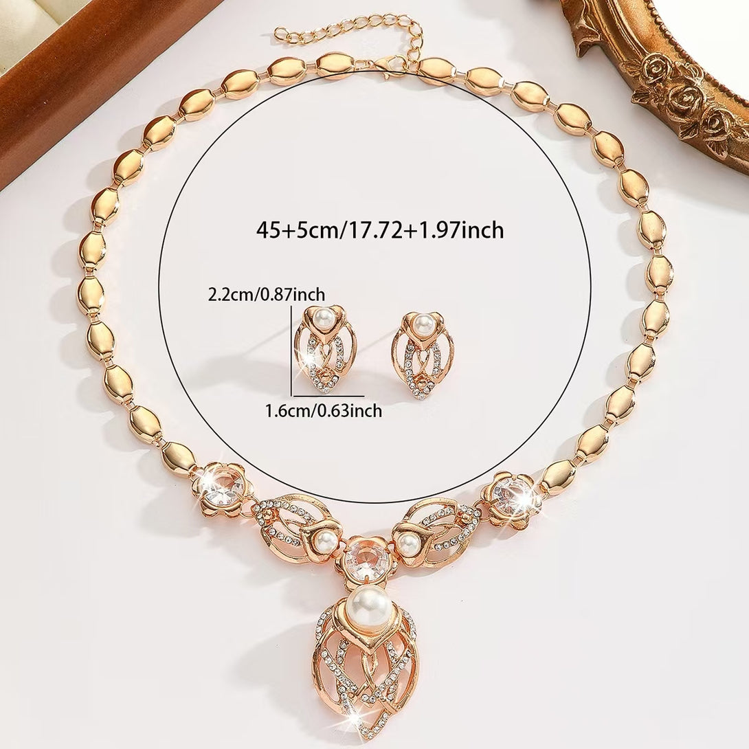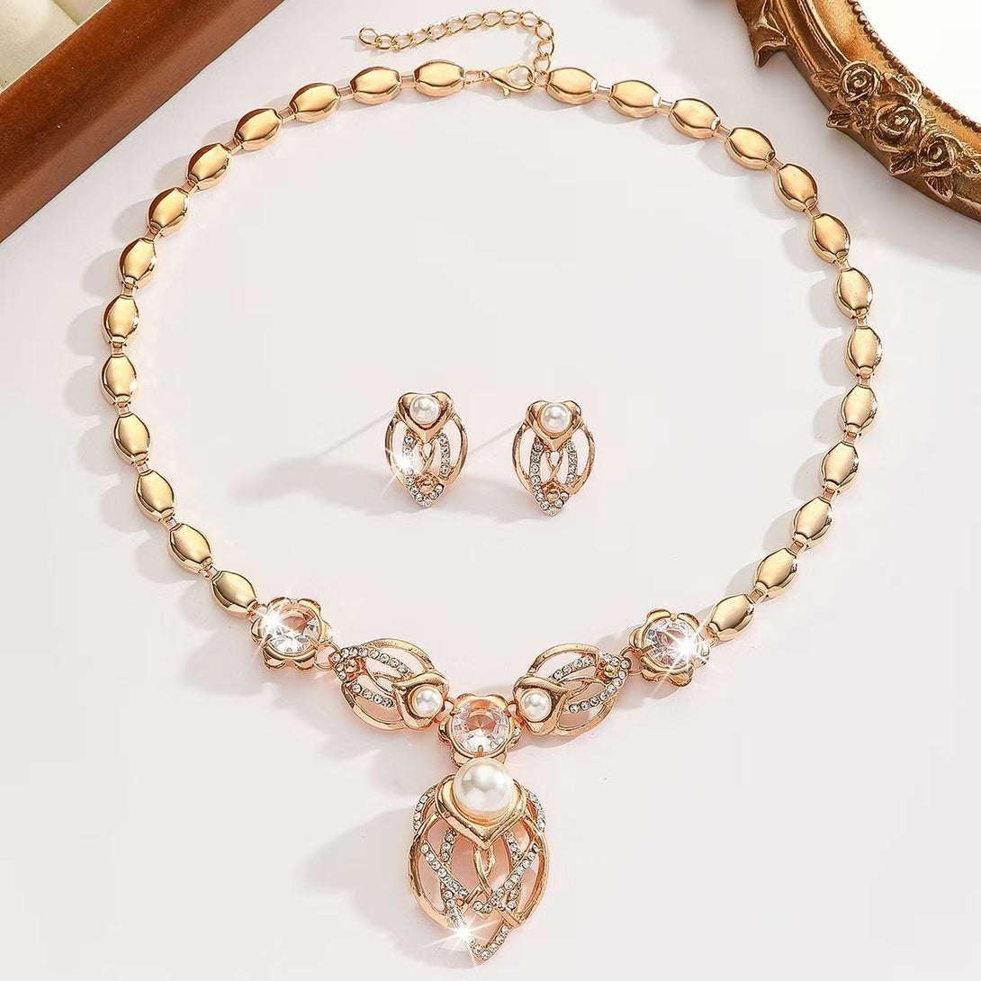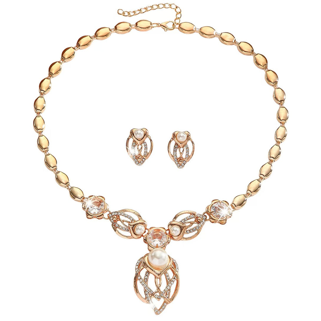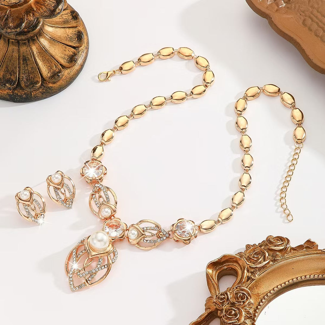 Conjuntos de joyas: collar y pendientes con perlas de imitación de color dorado para boda, conjuntos de joyería románticos de cristal transparente para mujer, regalo de fiesta.