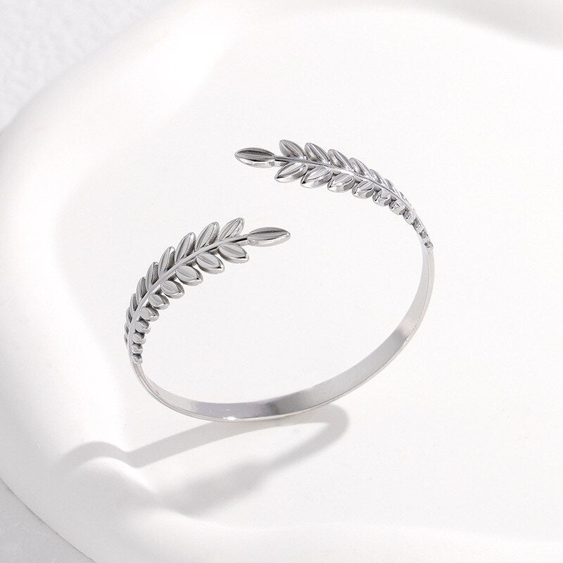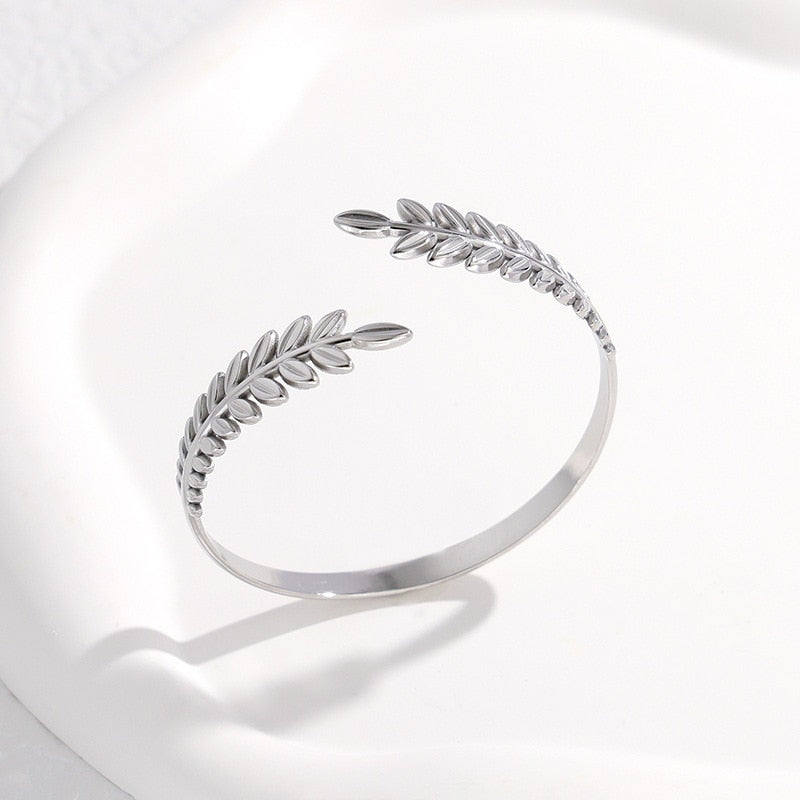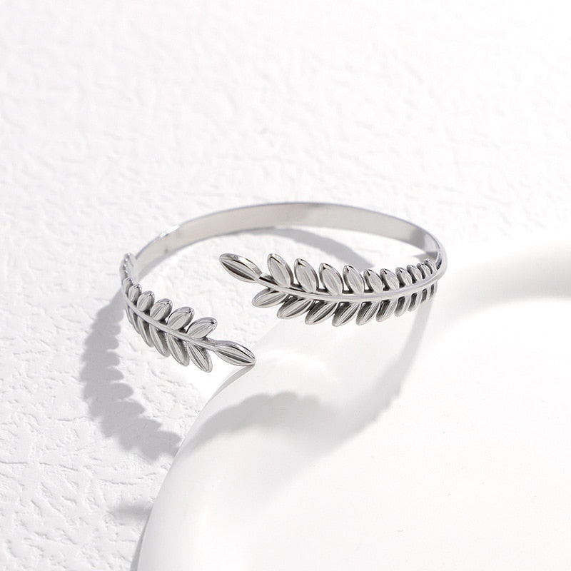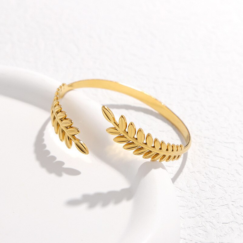 Pulsera de acero inoxidable 316L chapada en oro 585, con personalidad moderna, con forma de hoja, ajustable y abierta, para mujer, joyería que no se decolora.