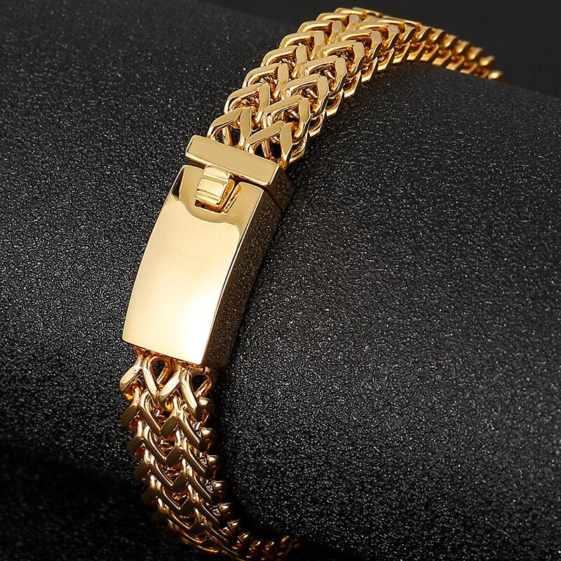 Pulsera de hombre chapada en oro de 11 mm con cadena de eslabones de doble capa de acero inoxidable y eslabones francos.