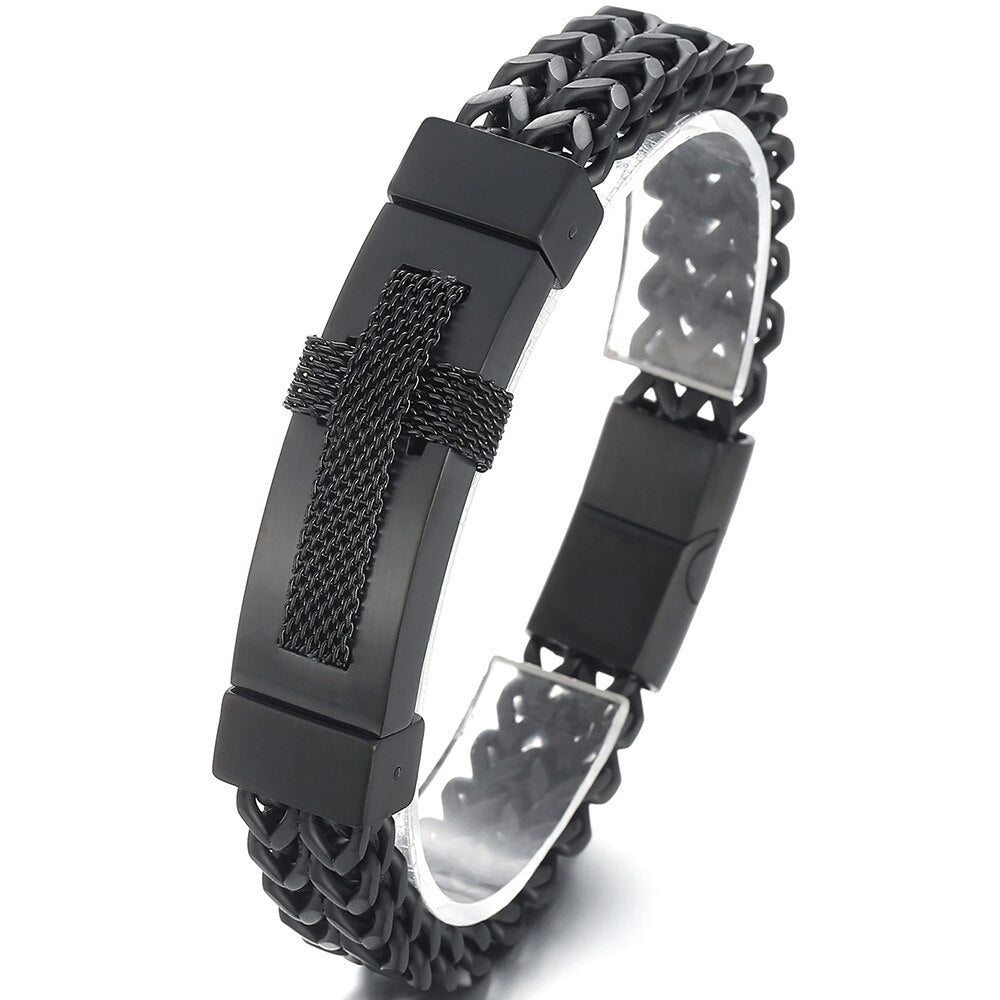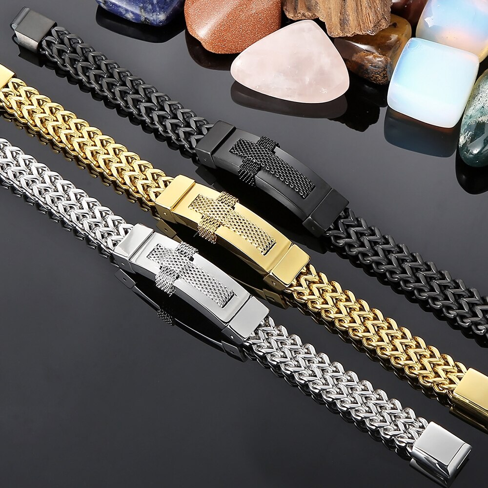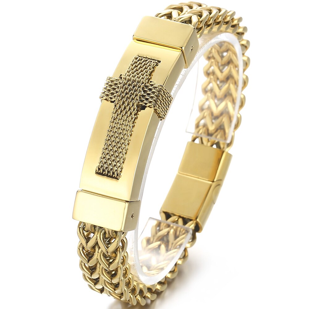 Pulseras de acero inoxidable con cruz chapada en oro para hombre. Pulsera moderna para hombre.