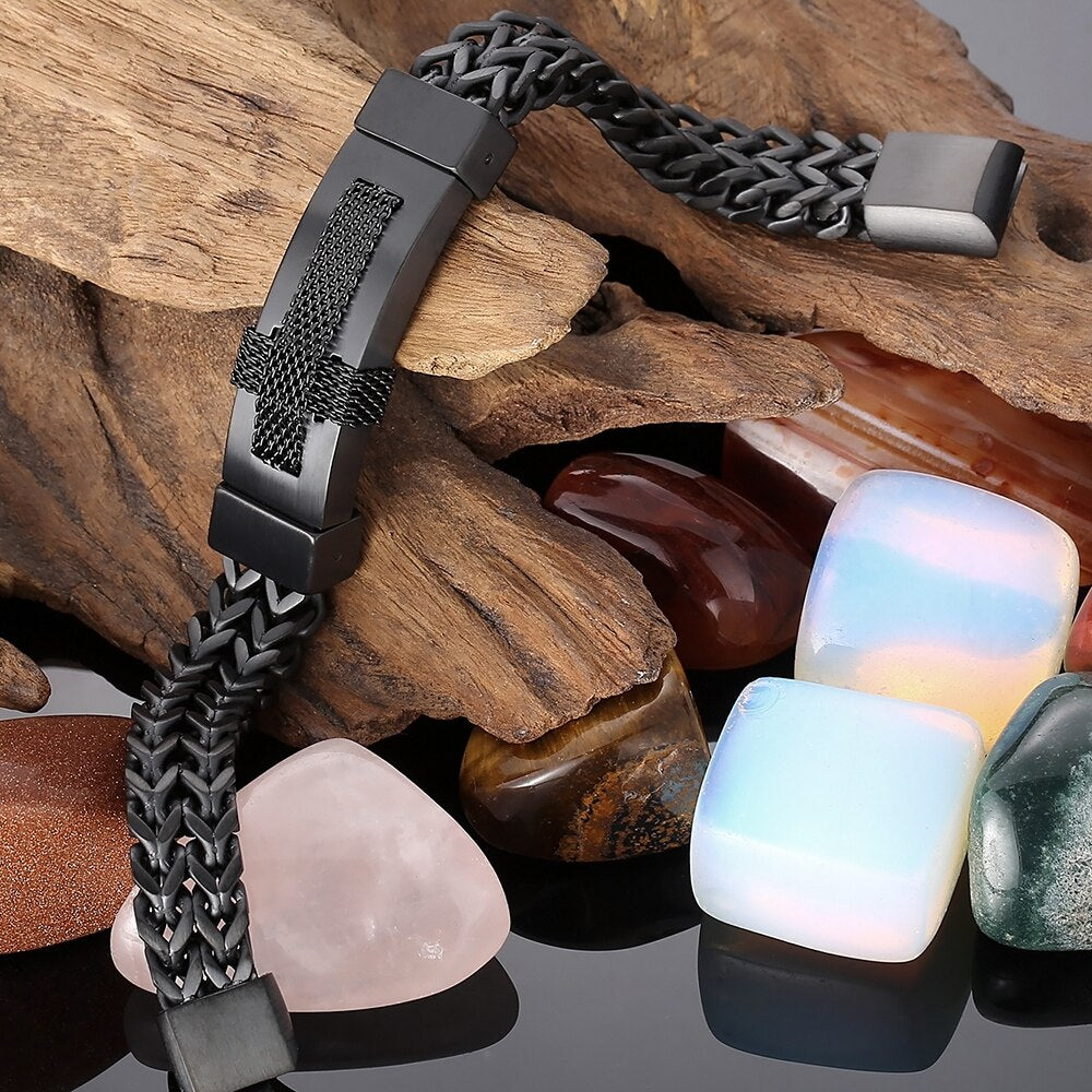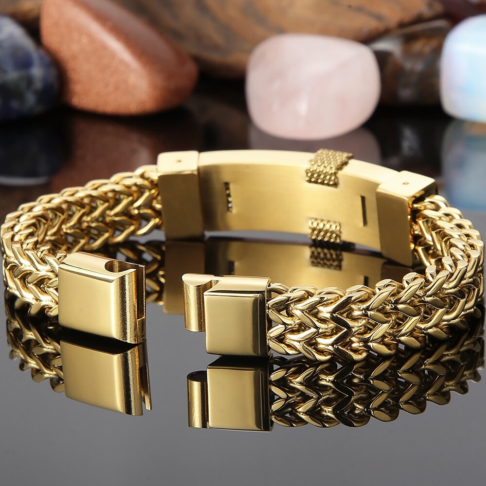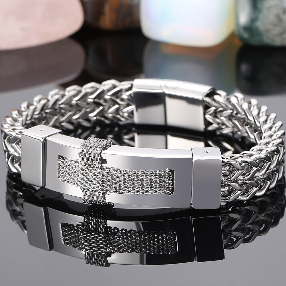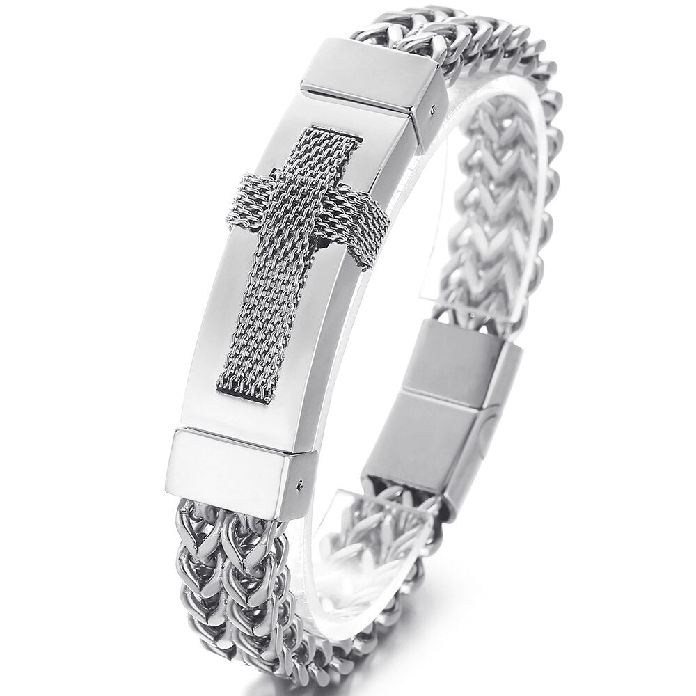 Pulseras de acero inoxidable con cruz chapada en oro para hombre. Pulsera moderna para hombre.