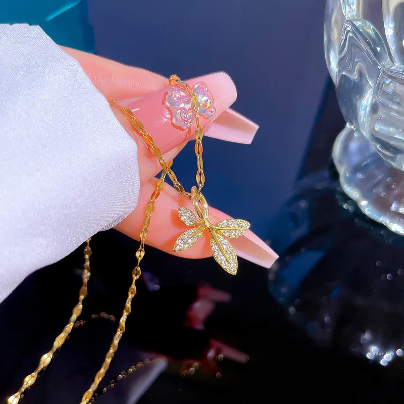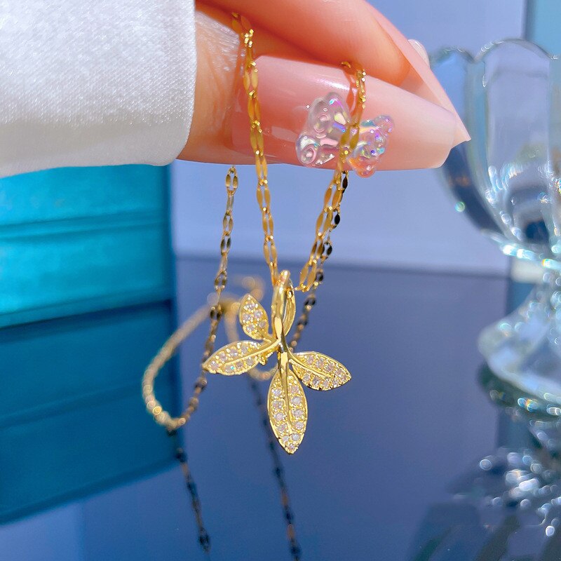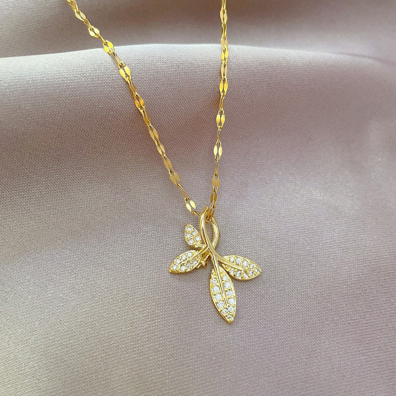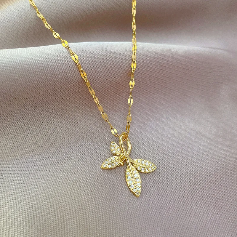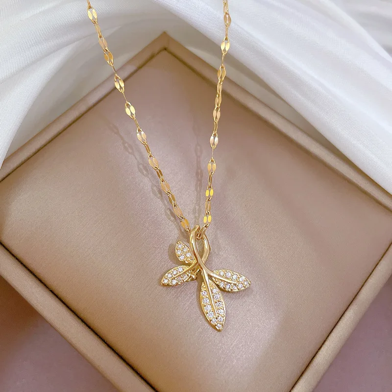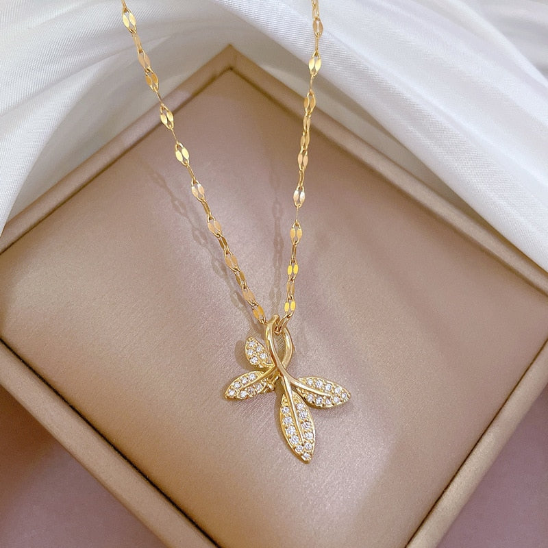 Collar con colgante de hoja de circonita cúbica de acero inoxidable 316L chapado en oro 585 para mujer, cadena de clavícula, joyería de fiesta.