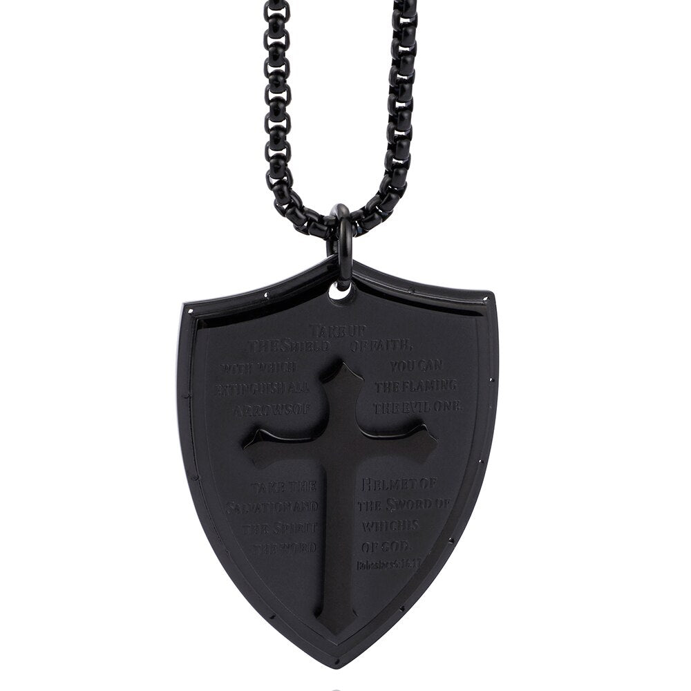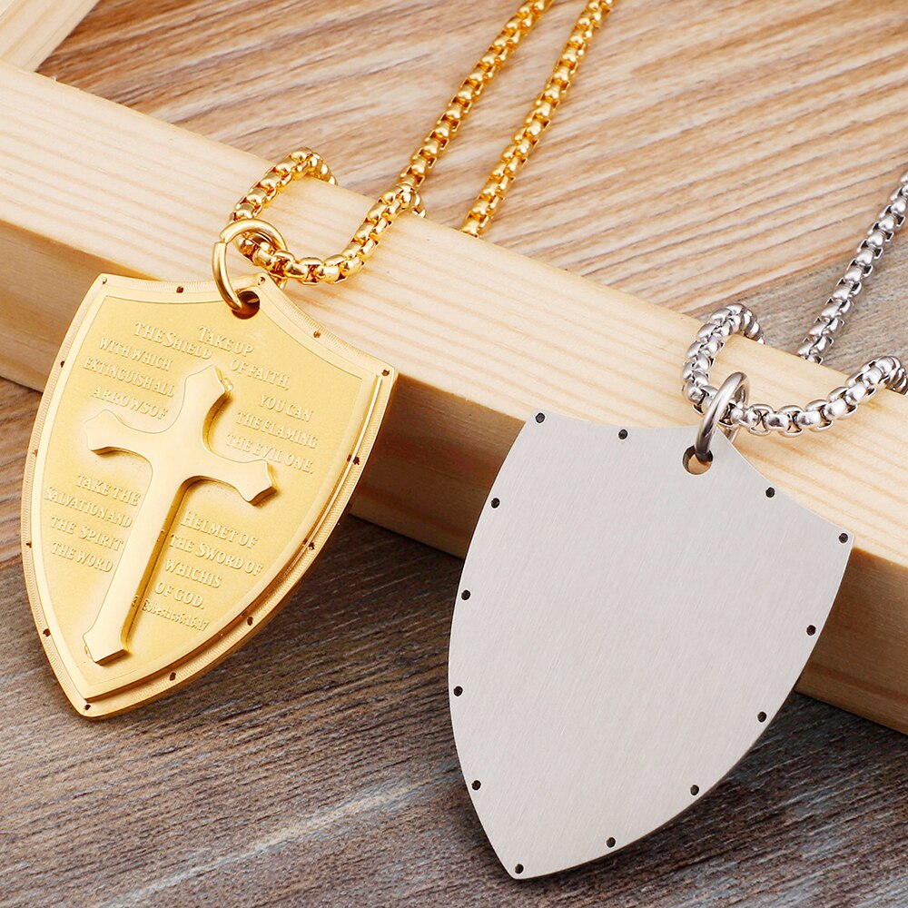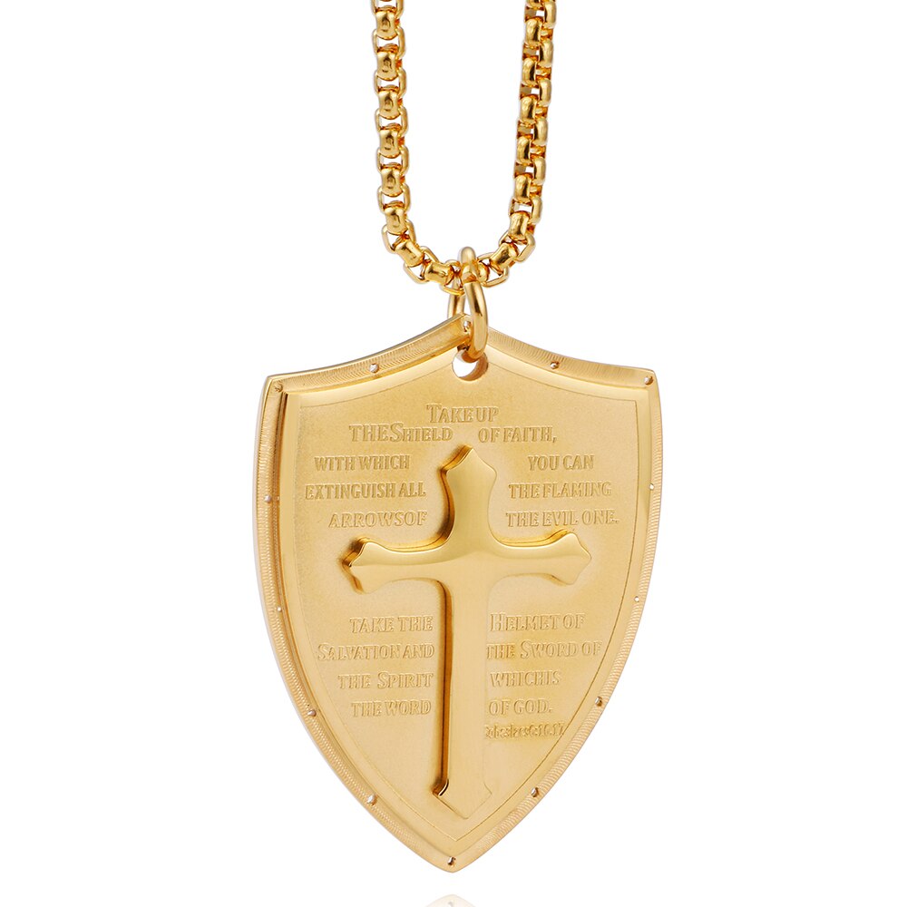 Collar con colgante de cruz y escudo de acero inoxidable chapado en oro para hombres y mujeres