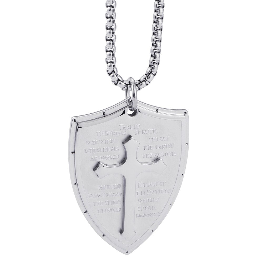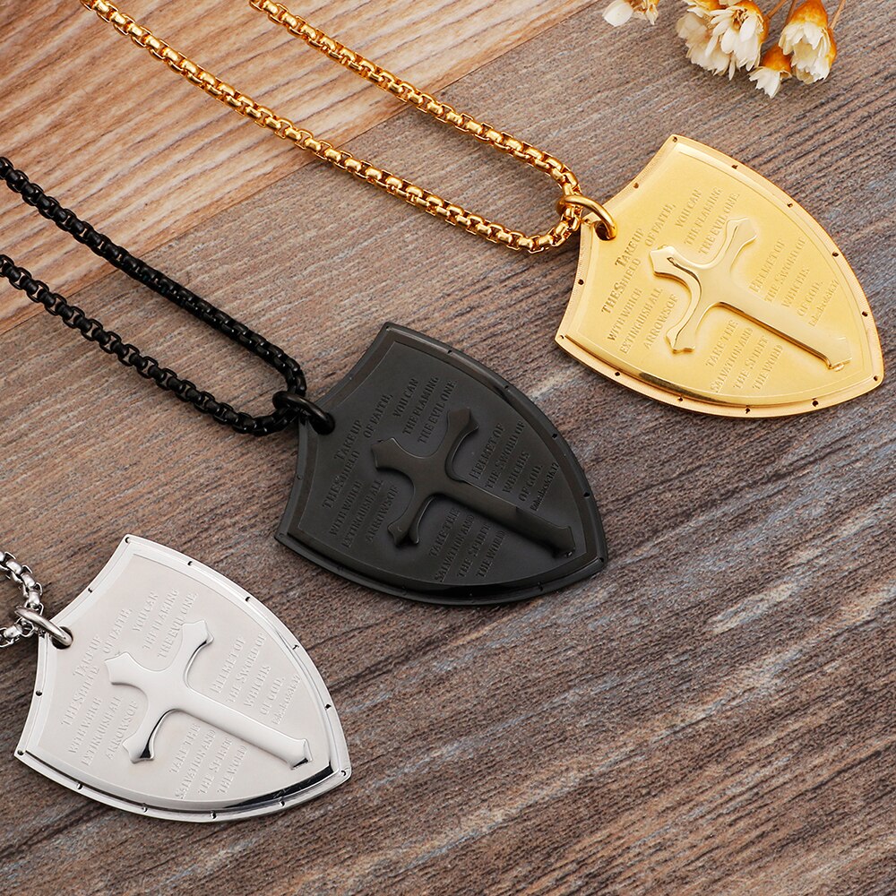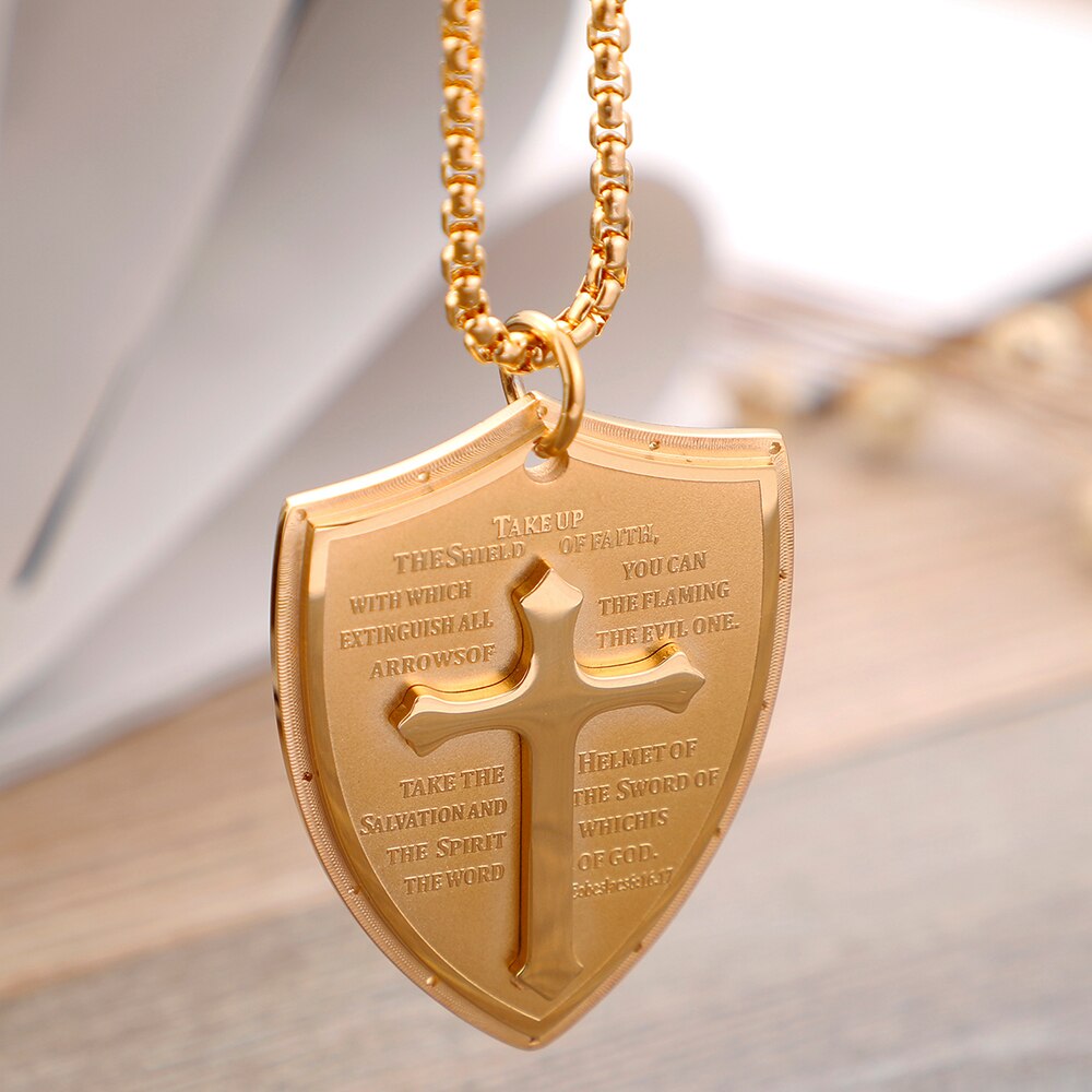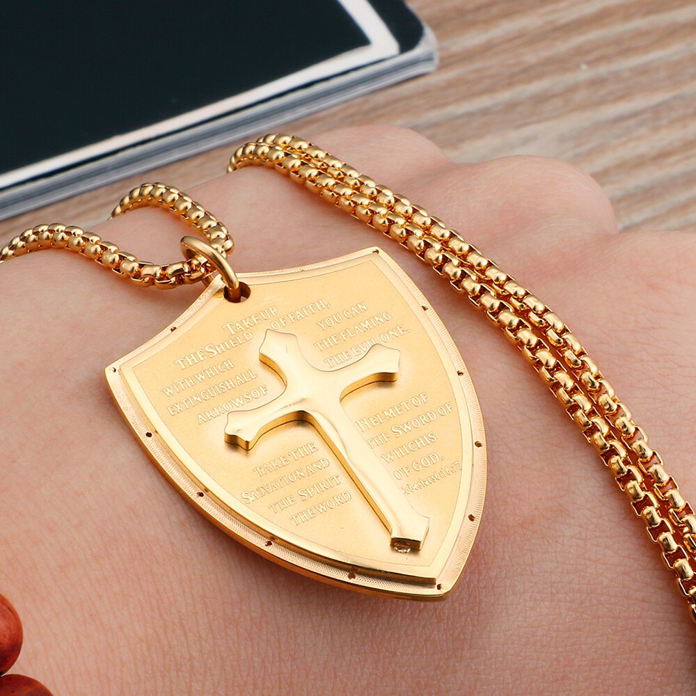 Collar con colgante de cruz y escudo de acero inoxidable chapado en oro para hombres y mujeres, con escritura grabada, oración religiosa, joyería cristiana.