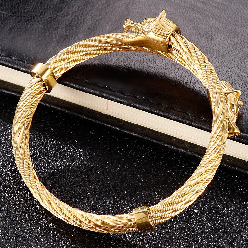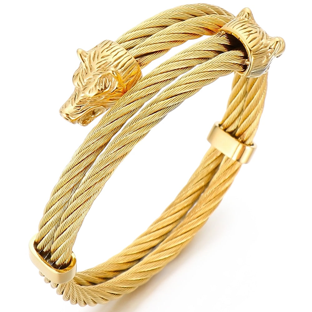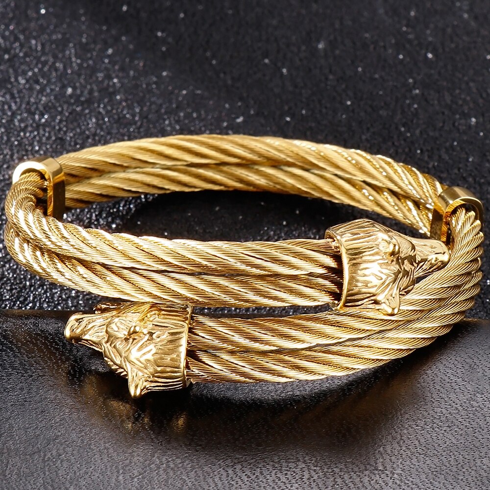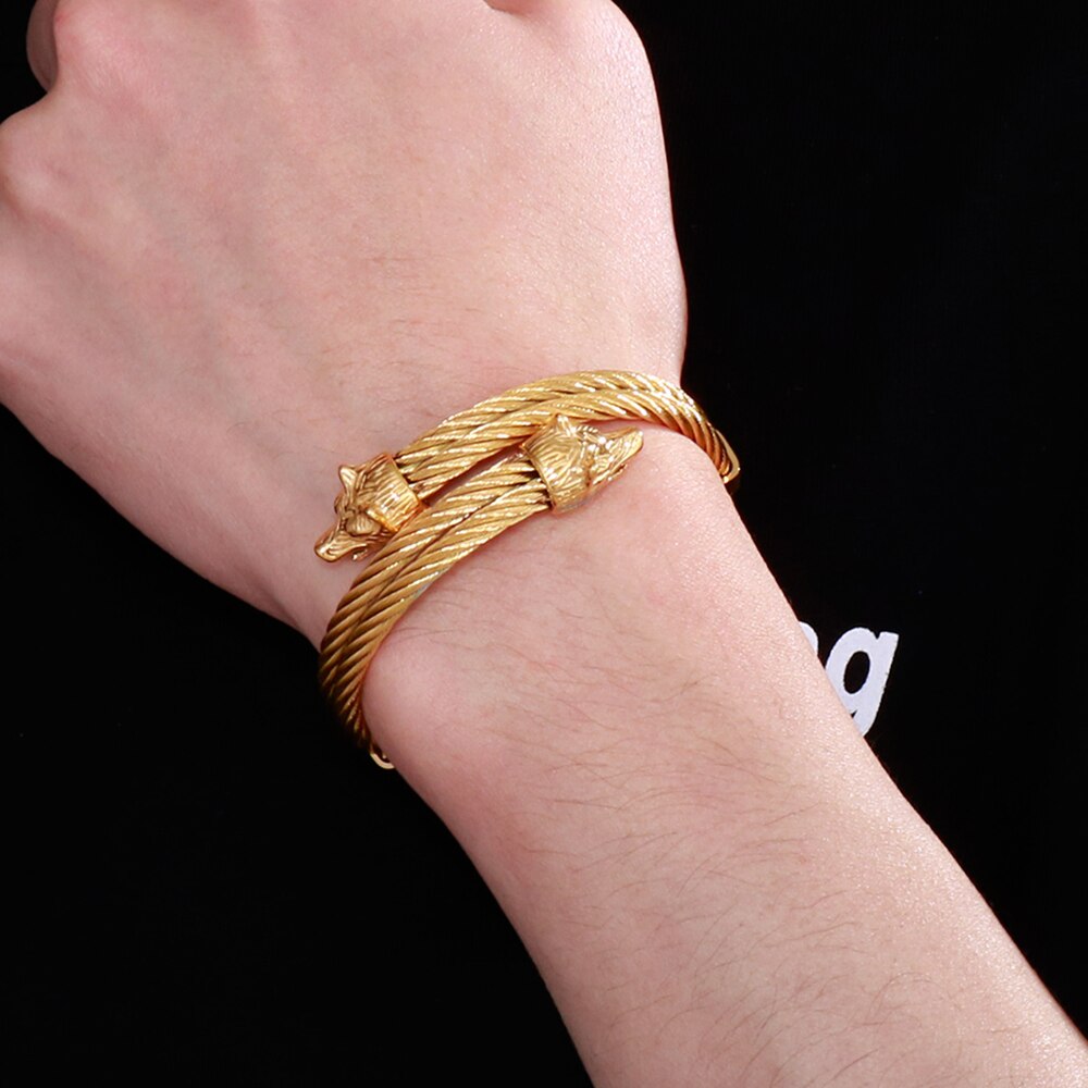 Brazalete de cadena trenzada de acero inoxidable de doble capa con forma de cabeza de lobo chapado en oro para hombre, joyería para motociclistas.