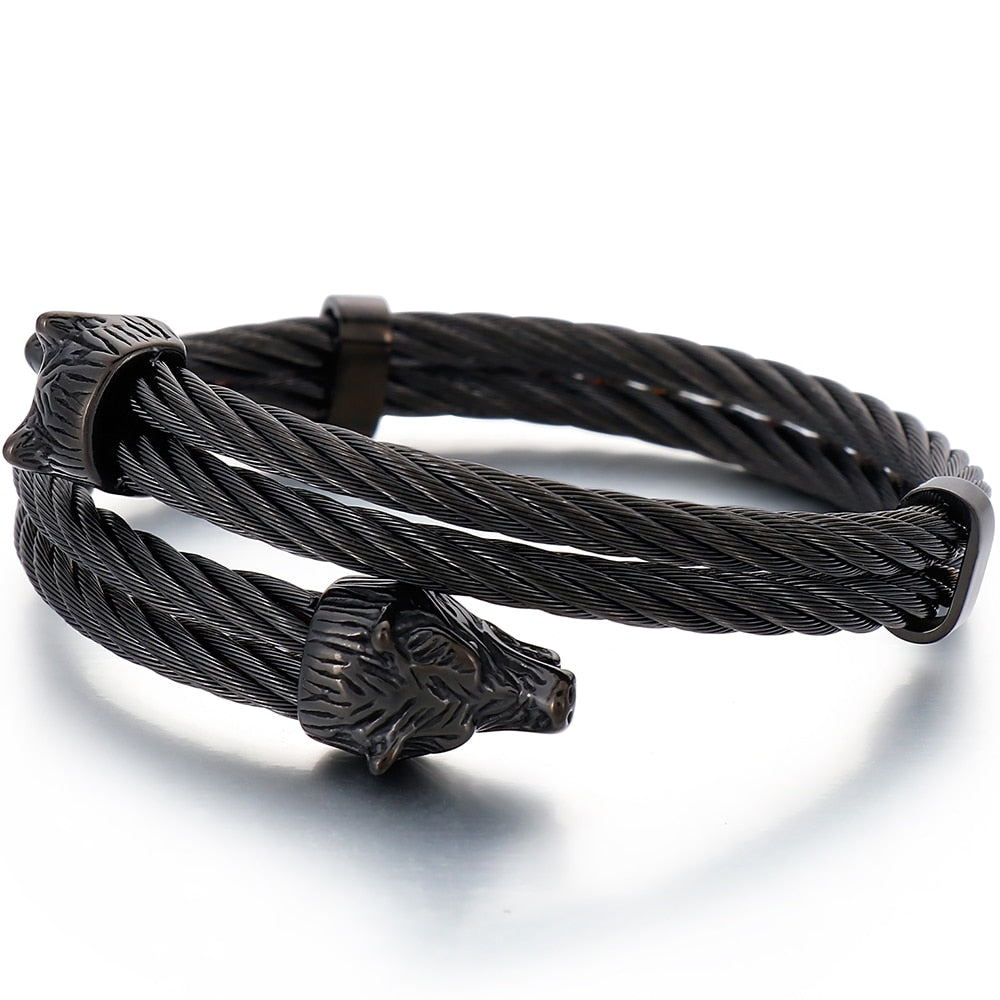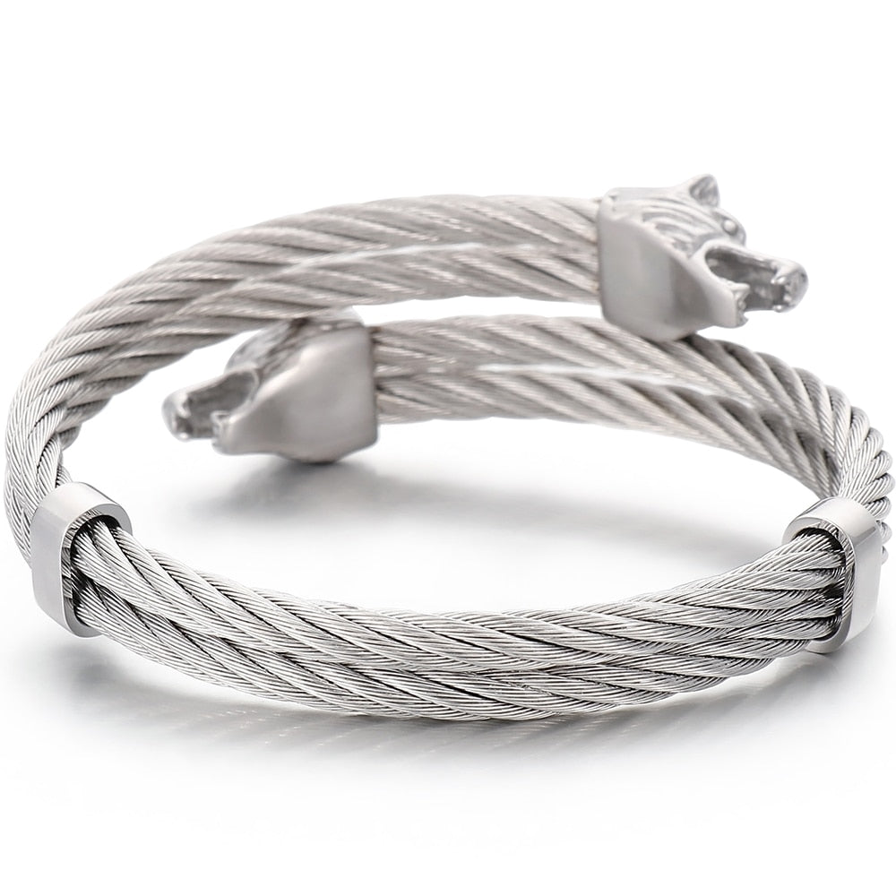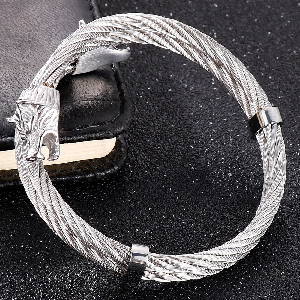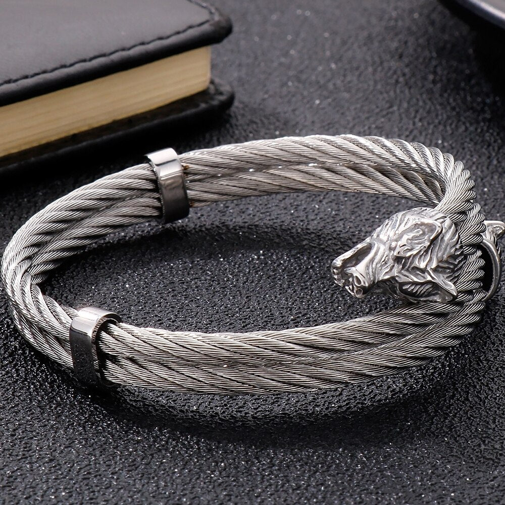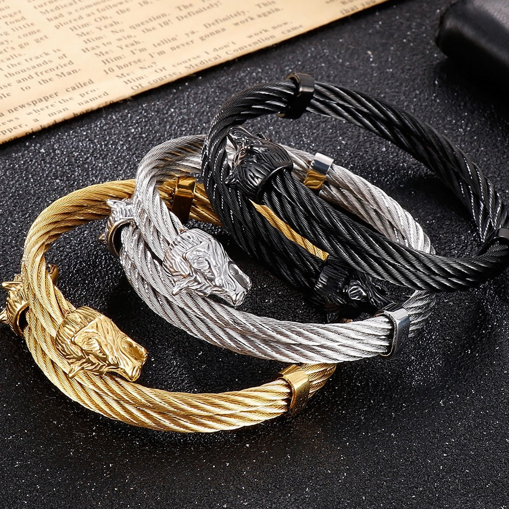 Brazalete de cadena trenzada de acero inoxidable de doble capa con forma de cabeza de lobo chapado en oro para hombre, joyería para motociclistas.