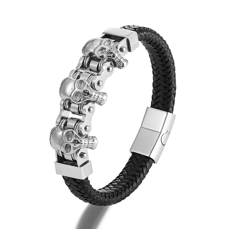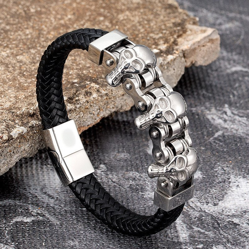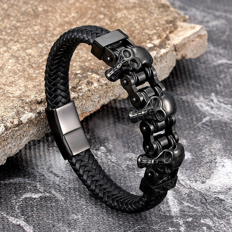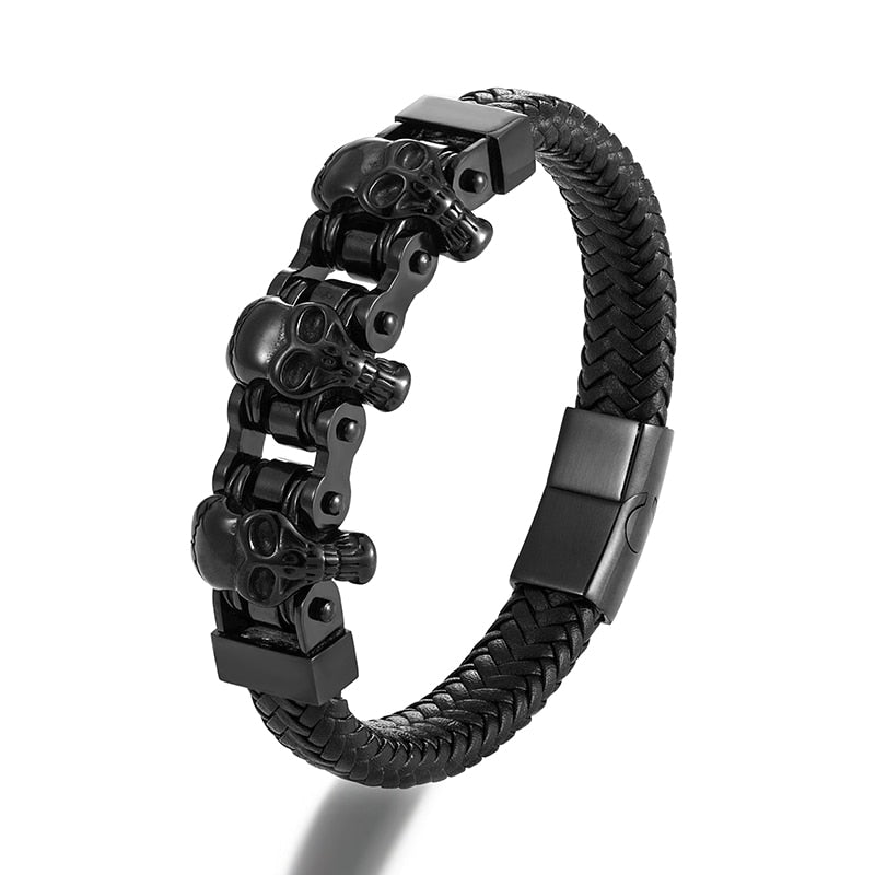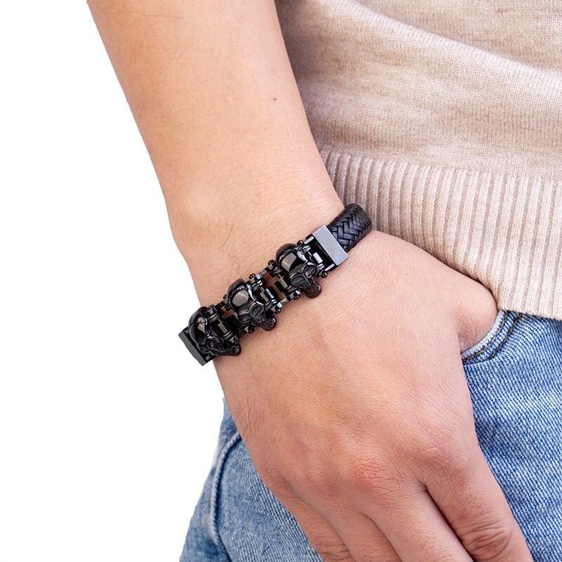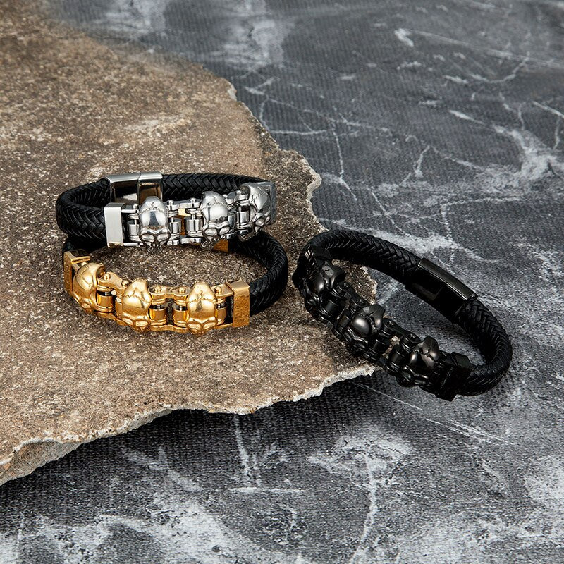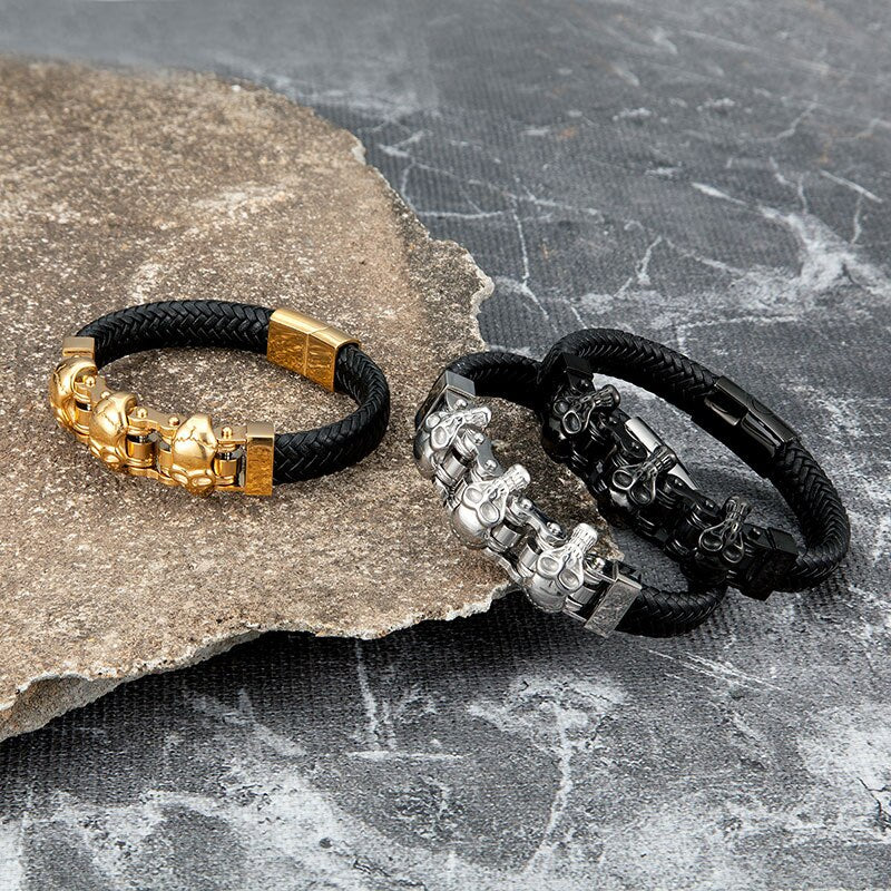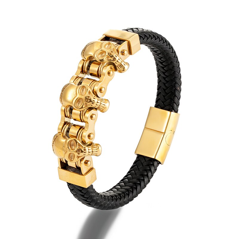 Pulsera de cuero de acero inoxidable con calavera dorada para hombre, accesorios punk, pulsera magnética de moda, joyería al por mayor, regalos para amigos.