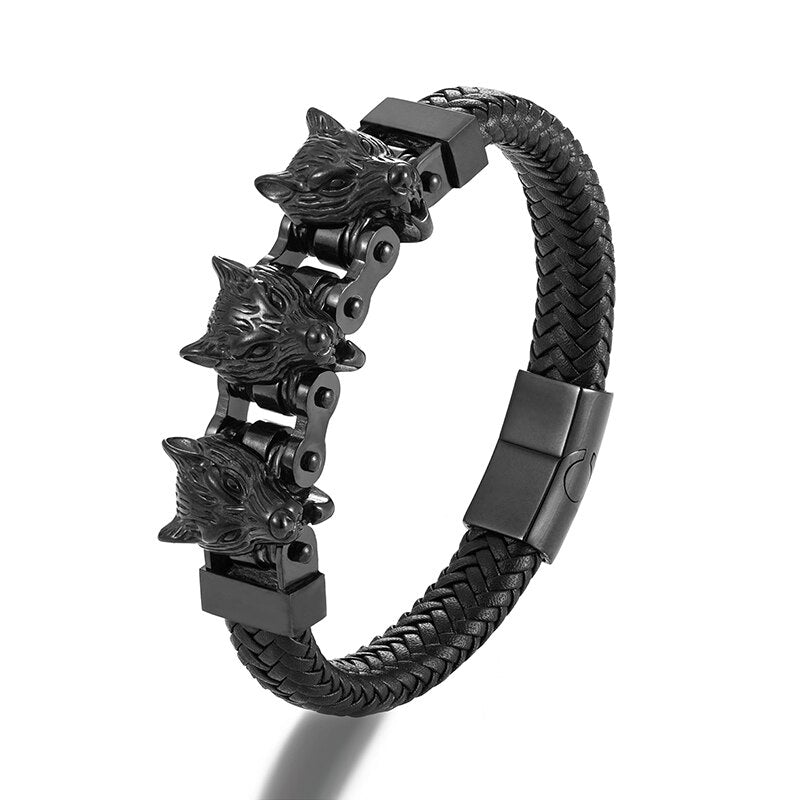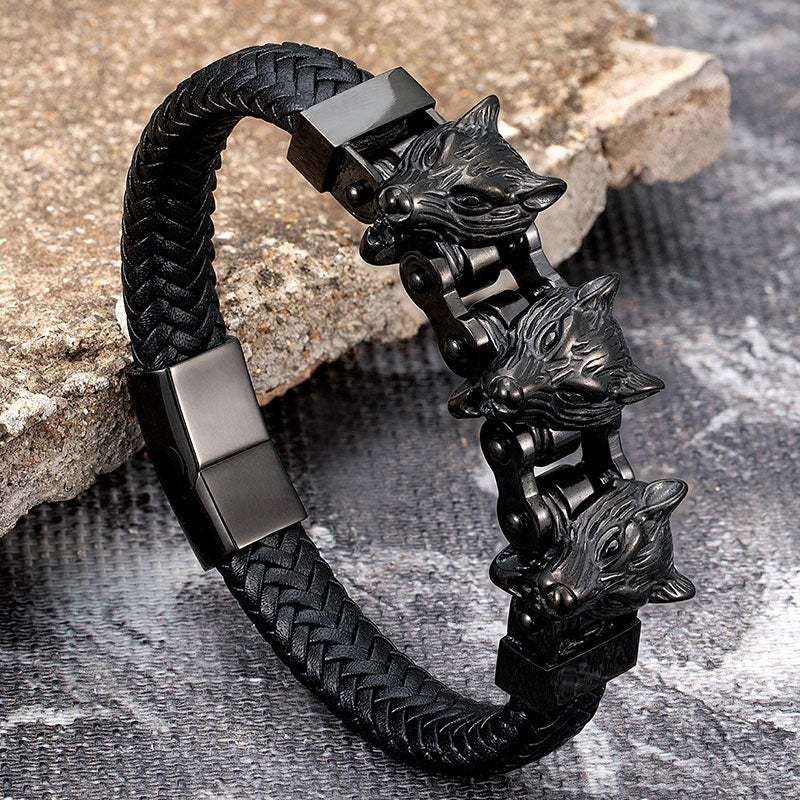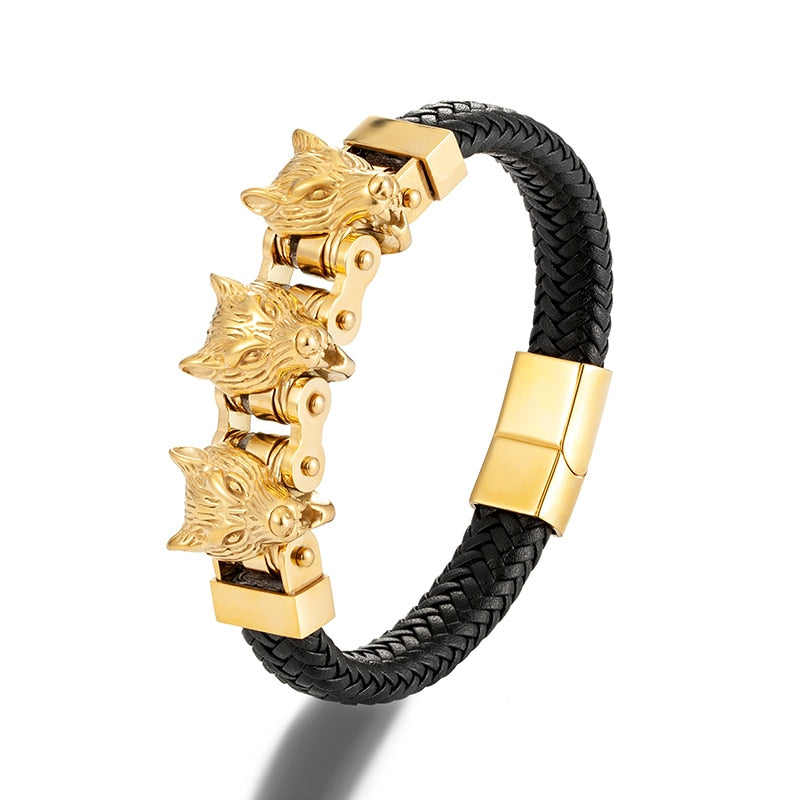 Pulsera de cuero para hombre de acero inoxidable con cabeza de lobo dorada