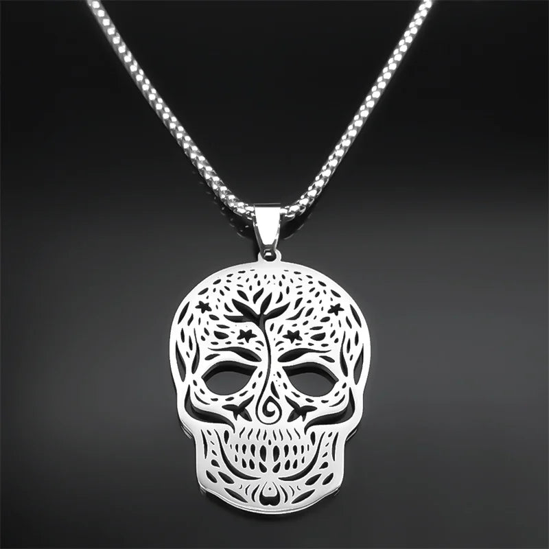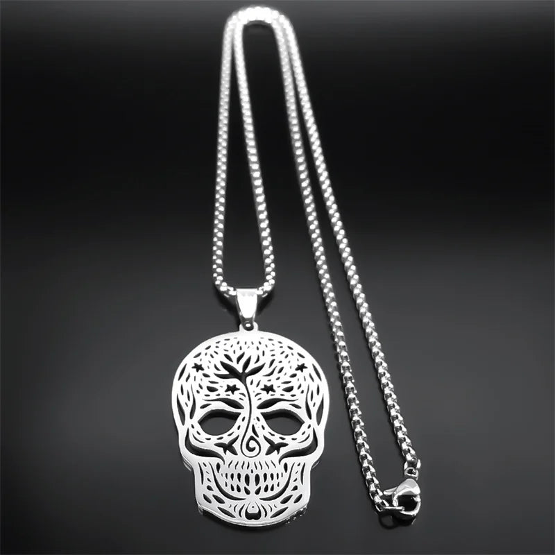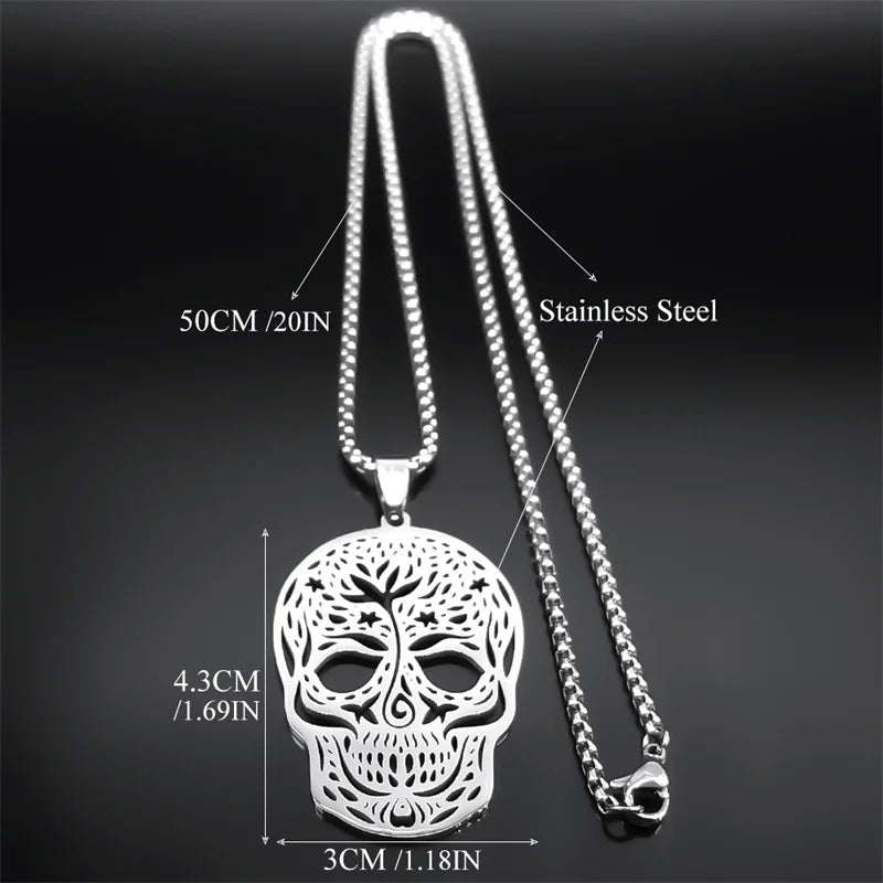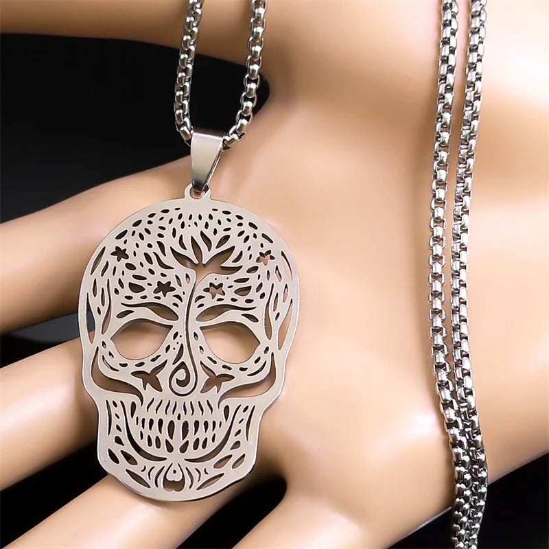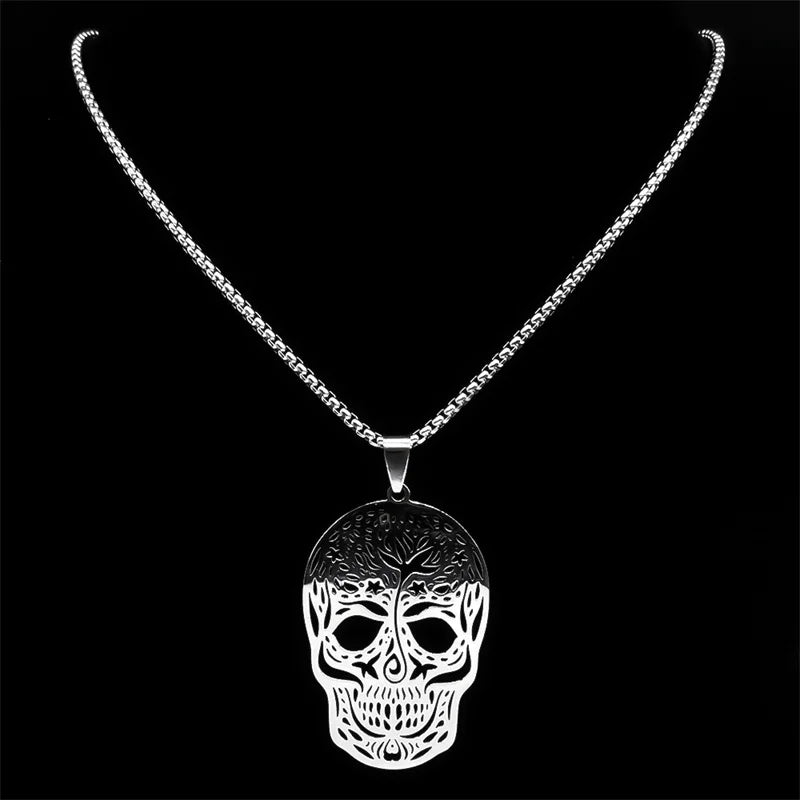 Collar gótico mexicano con calavera de azúcar y flor hueca para mujeres y hombres, de acero inoxidable, estilo arte popular mexicano, cadena de esqueleto, joyería