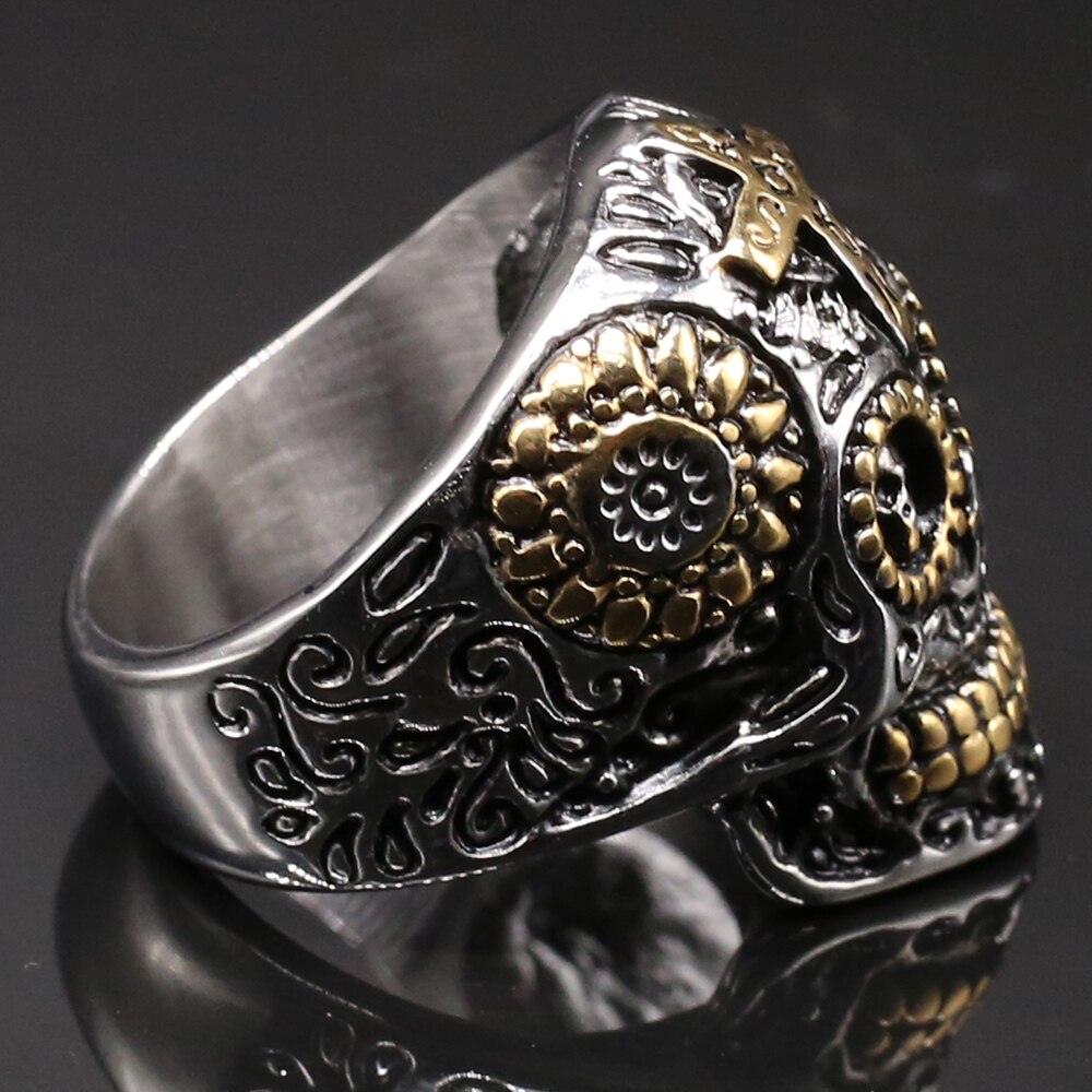 Anillo de motociclista con diseño de catacumbas de calavera de acero inoxidable color dorado gótico para hombre