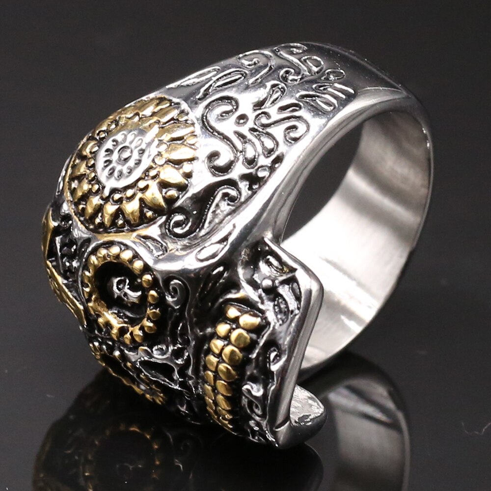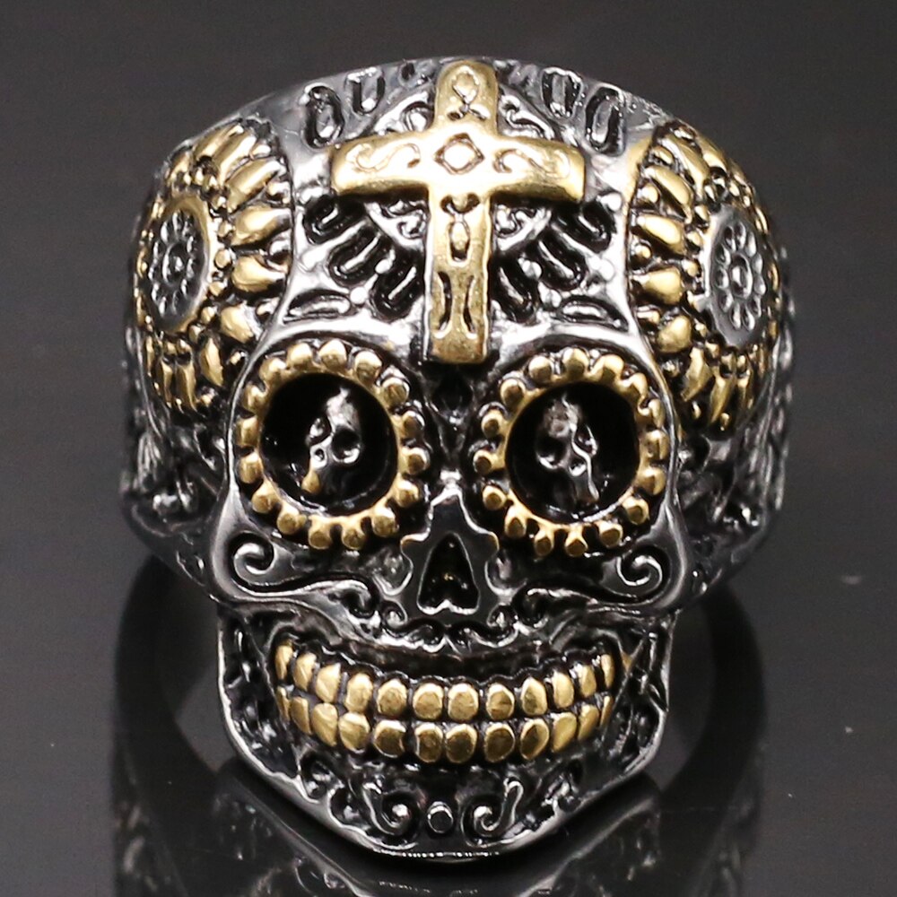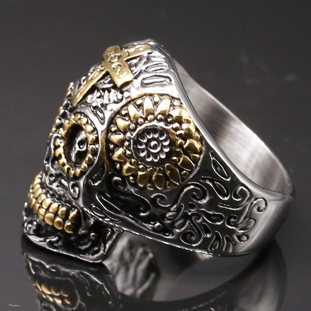 Anillo gótico de acero inoxidable color dorado con diseño de calavera y catacumbas para motociclista, para hombre, con diseño clásico de cruz, joyería única y accesorios punk rock.
