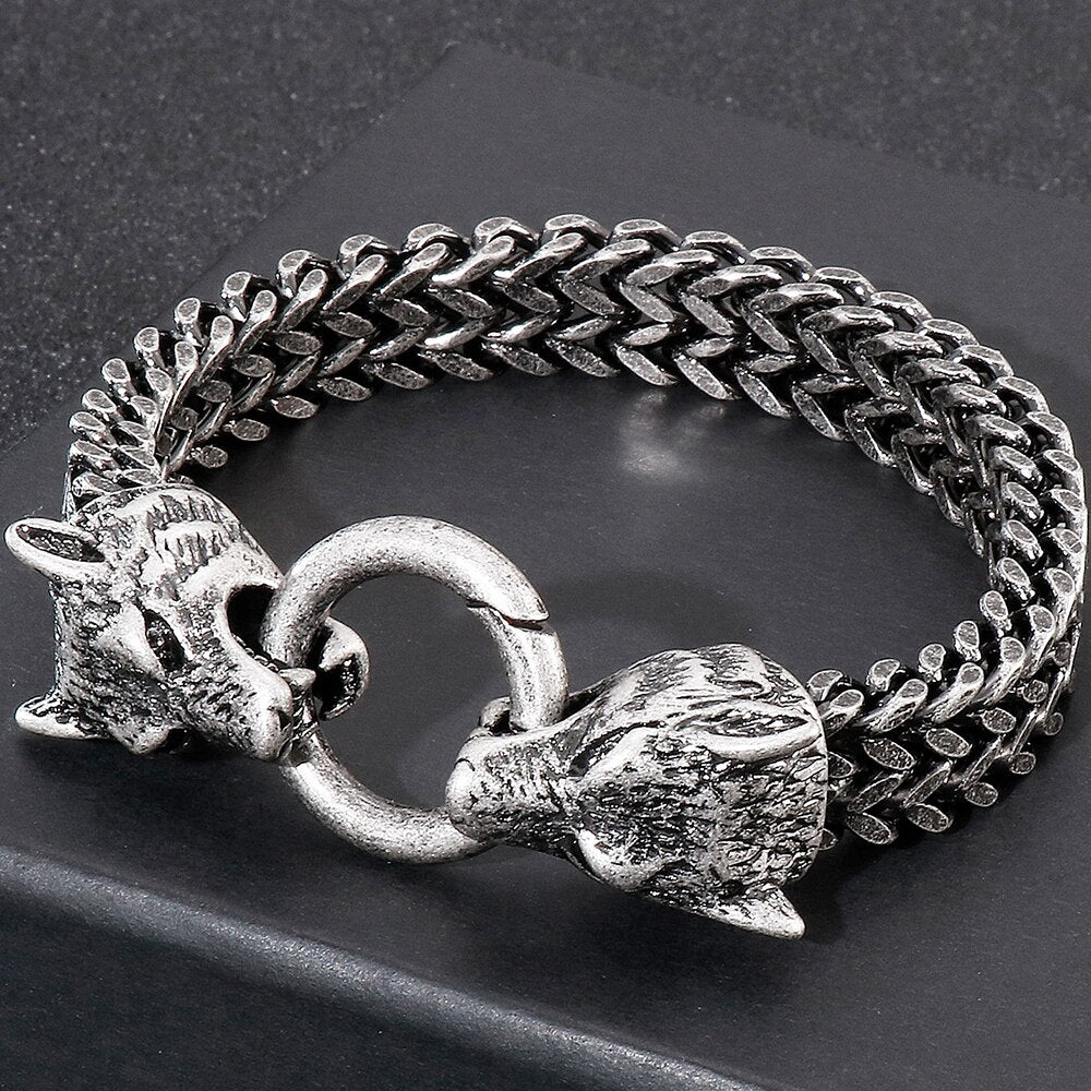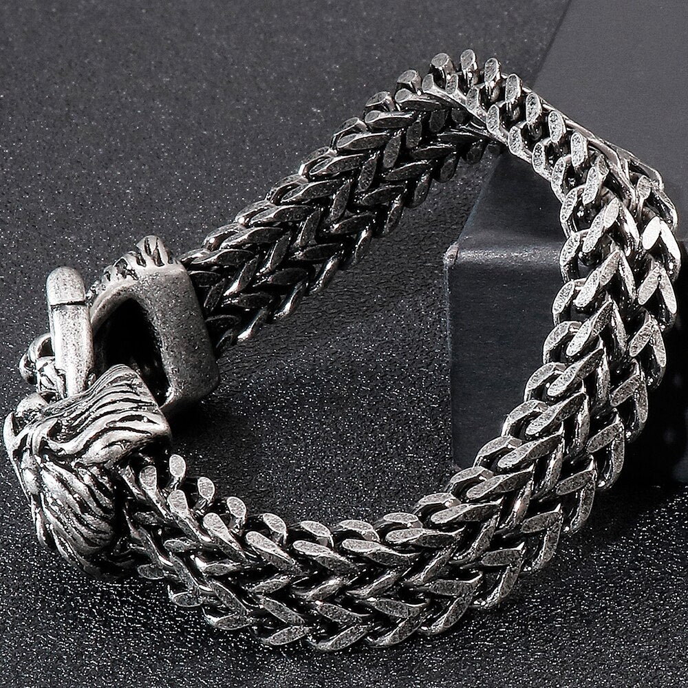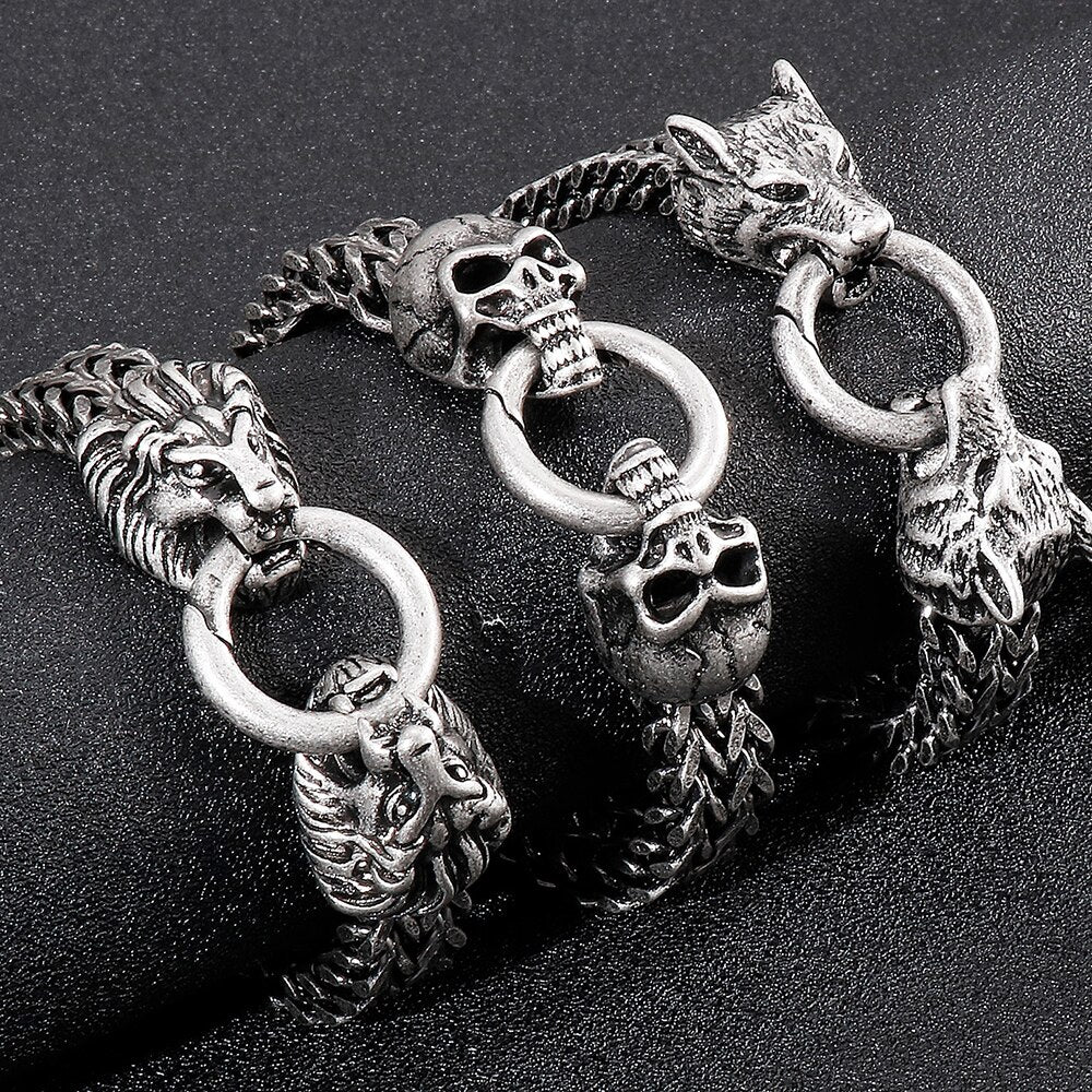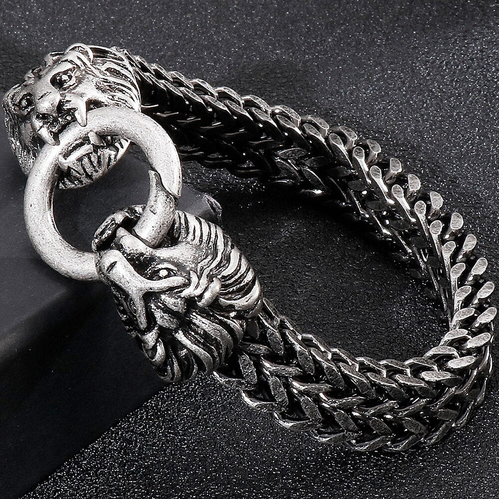 Pulsera gótica para hombre con doble cabeza de calavera de león y lobo, brazalete de 12 mm con eslabones francos, cadena de acero inoxidable.