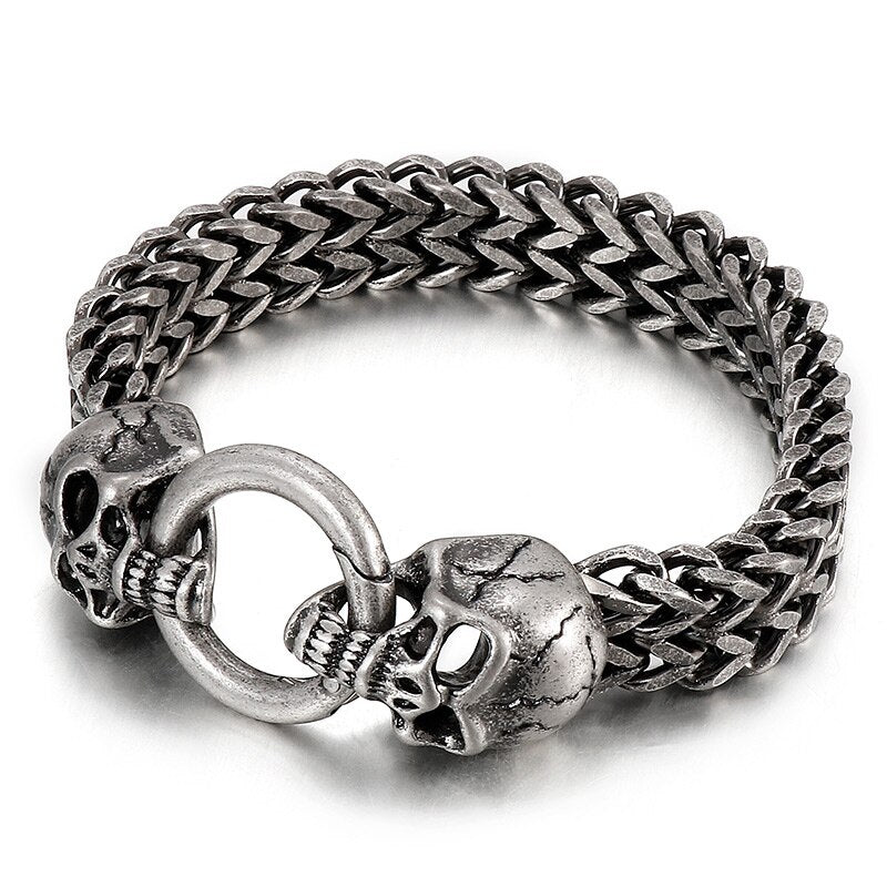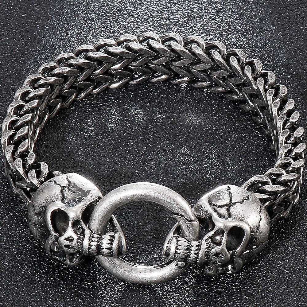 Pulsera gótica para hombre con doble cabeza de calavera de león y lobo, brazalete de 12 mm con eslabones francos.