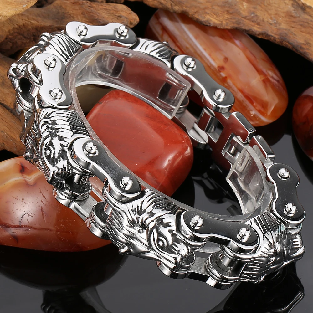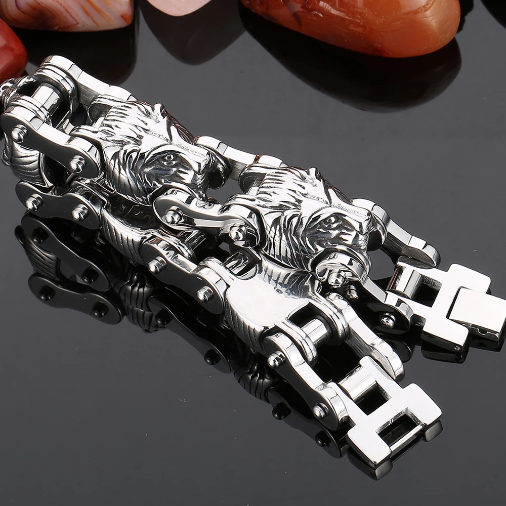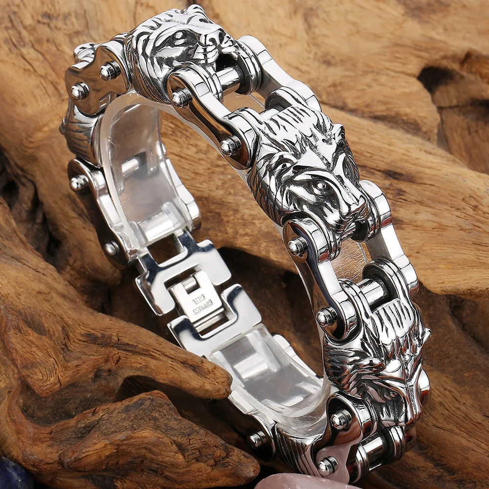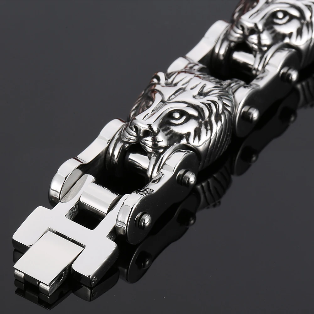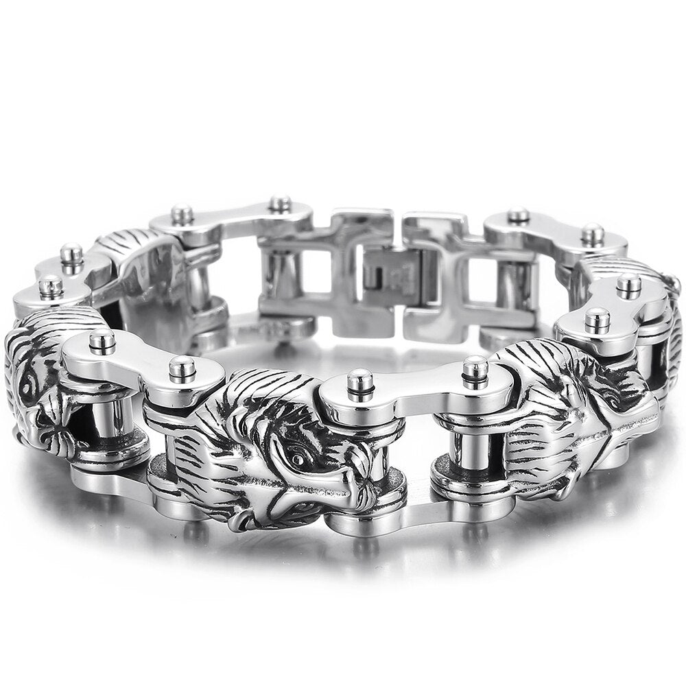 Pulsera con dije de calavera gótica con cabeza de león para hombre, de acero inoxidable, cadena de mano enorme de 13/18 mm, para motocicleta o bicicleta, joyería