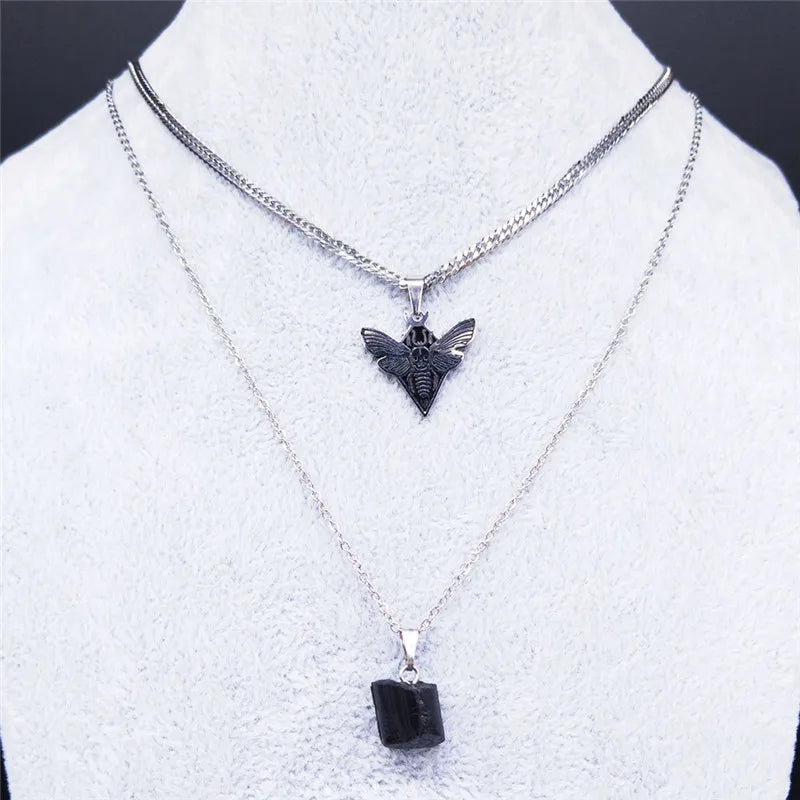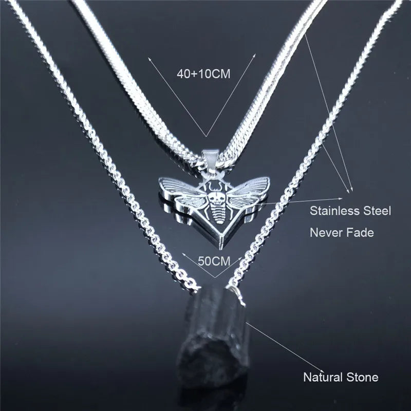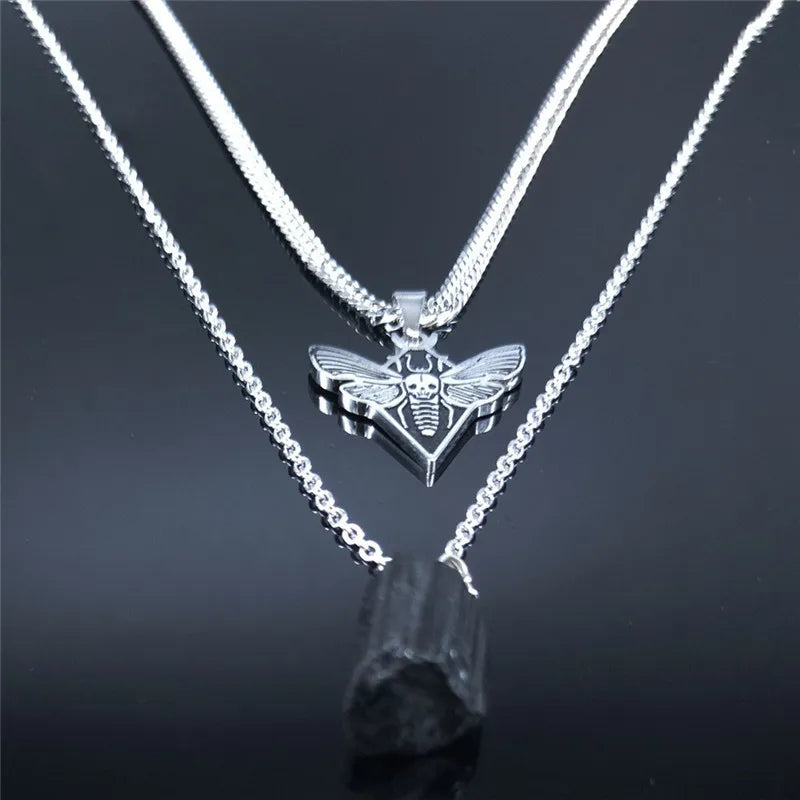 Collar de acero inoxidable en capas con calavera gótica y polilla para mujer