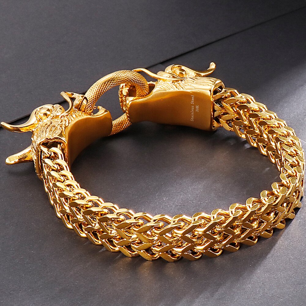 Pulsera gótica de acero inoxidable con doble cabeza de dragón de 11 mm y cadena de eslabones estilo franco.