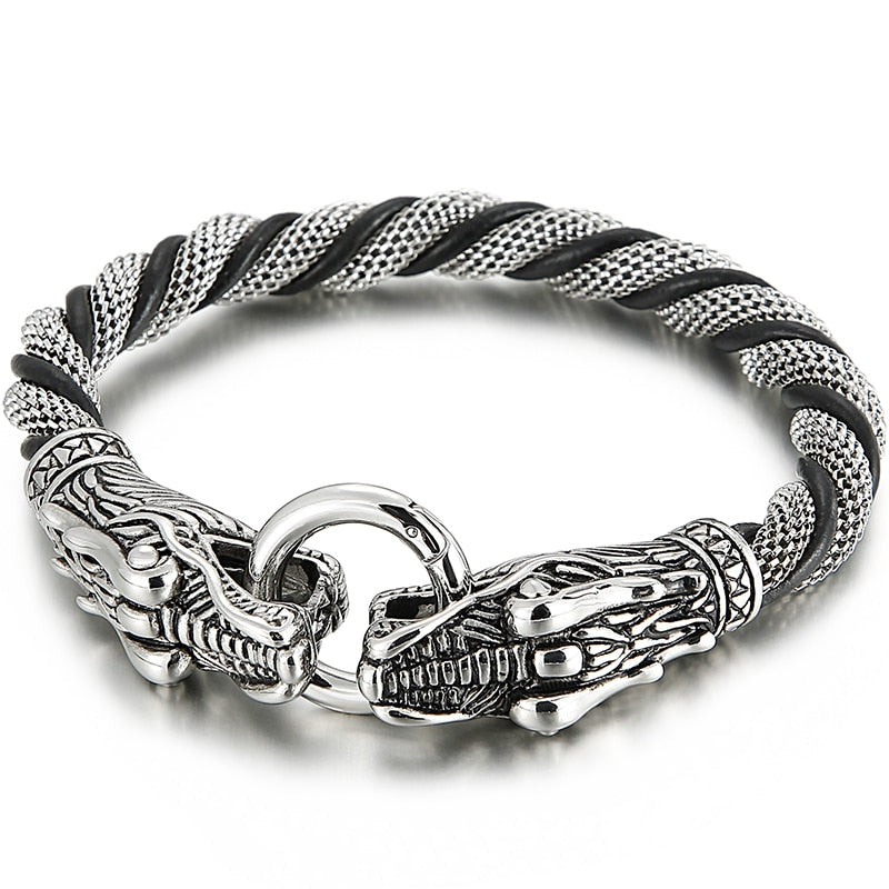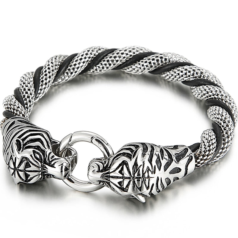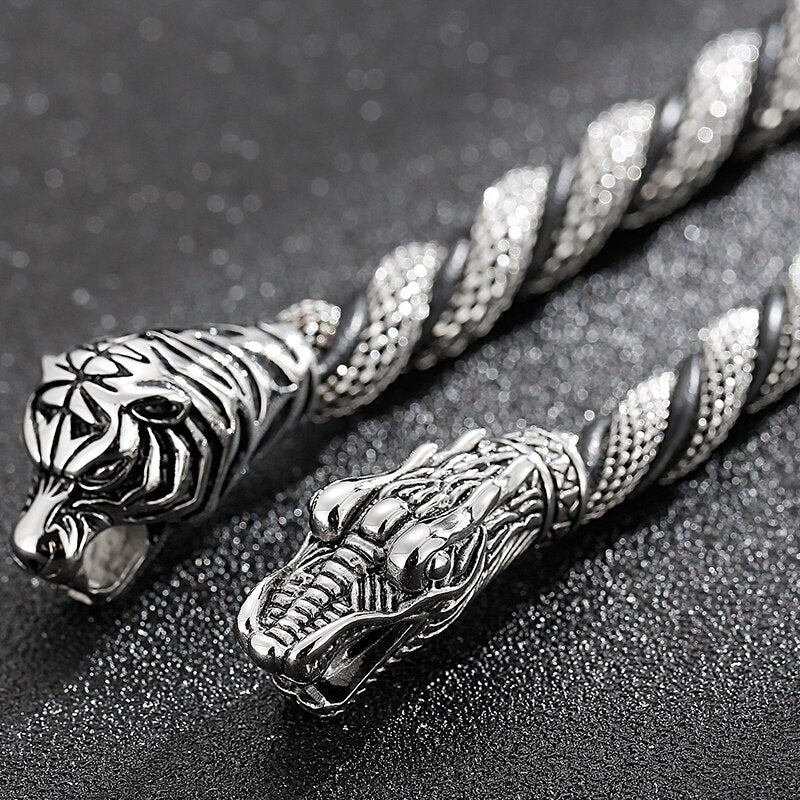 Pulsera gótica con cabeza de tigre o dragón para hombre, hecha a mano, de cuero trenzado y acero inoxidable, pulseras enormes para hombre.