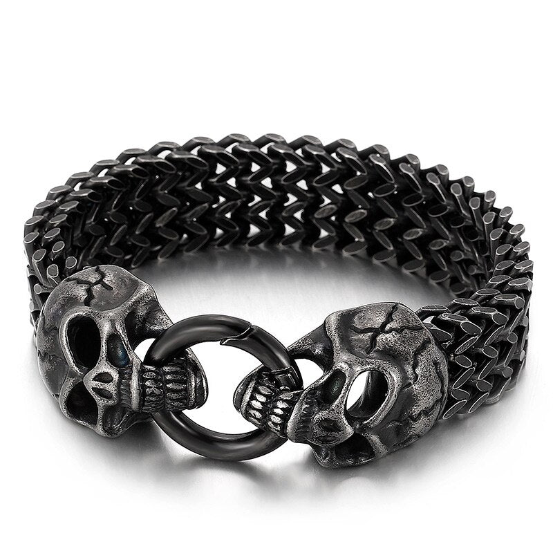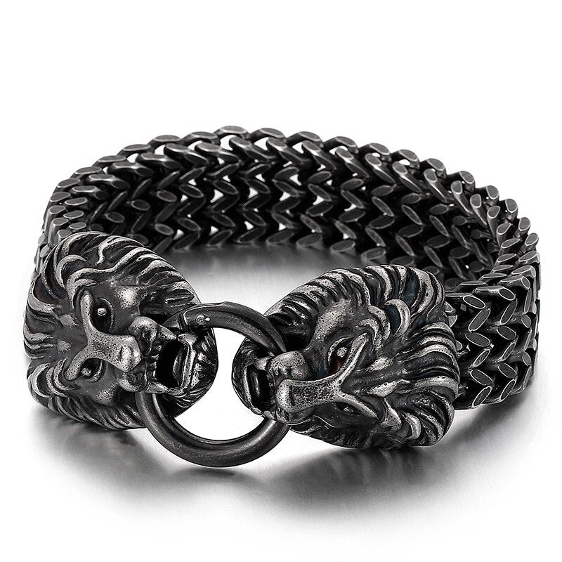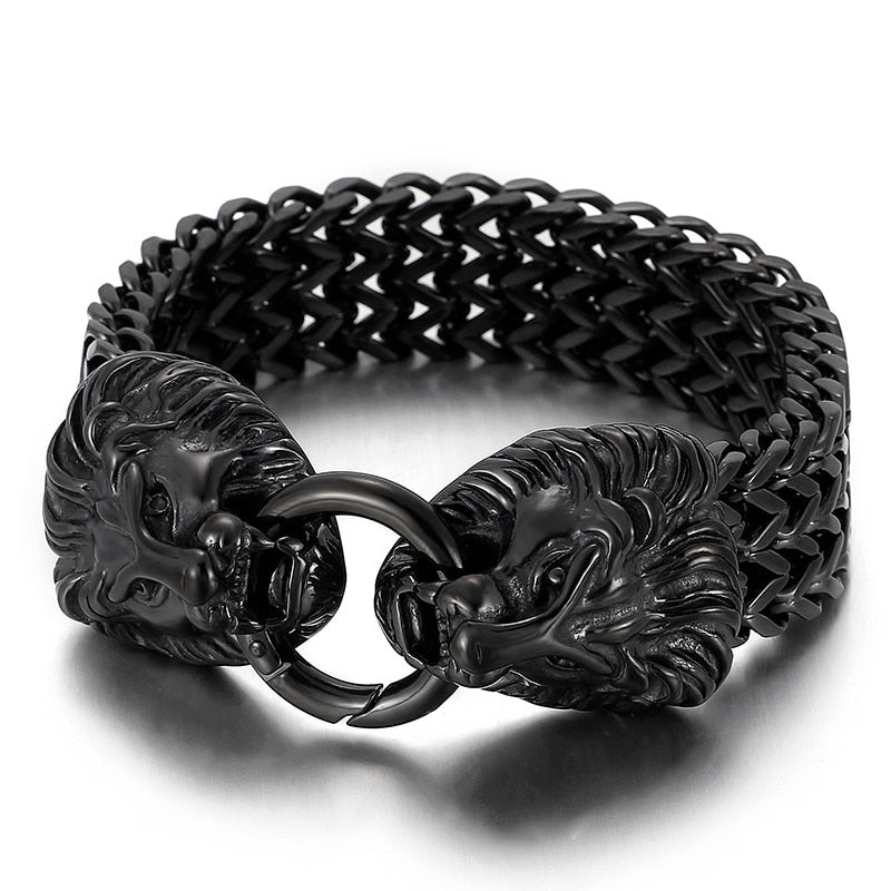 Pulsera gótica con cabeza de león y calavera de lobo para hombre, de acero inoxidable macizo de 18 mm, con eslabones francos y cadena de mano.