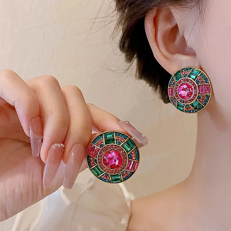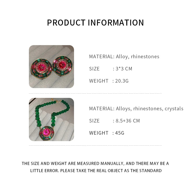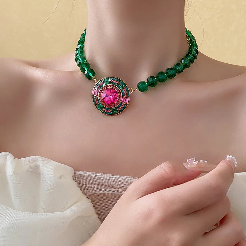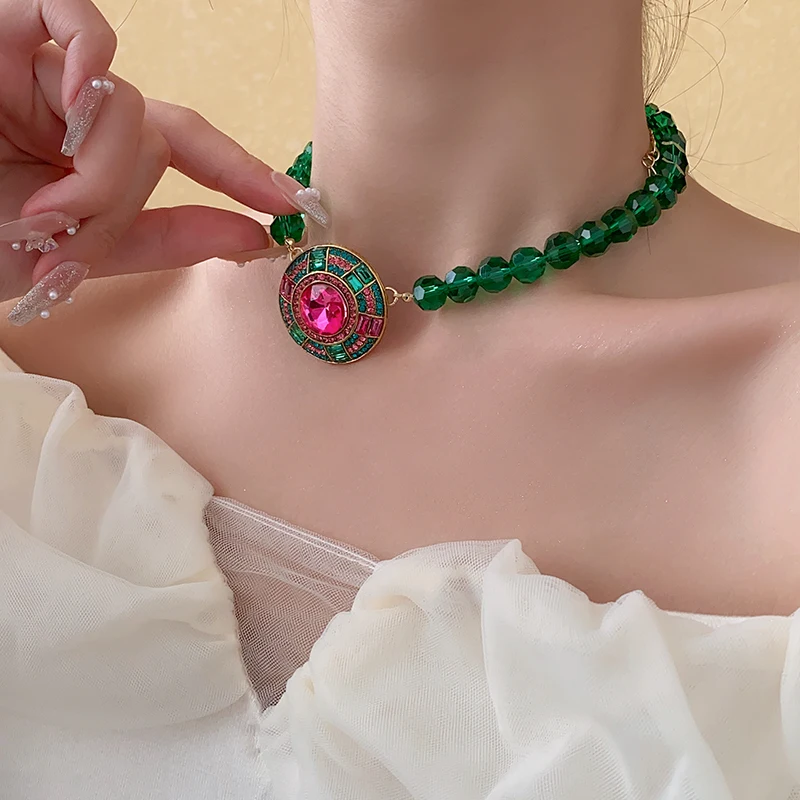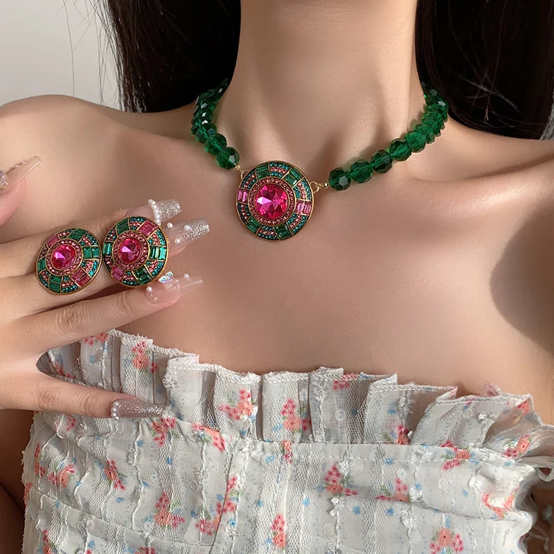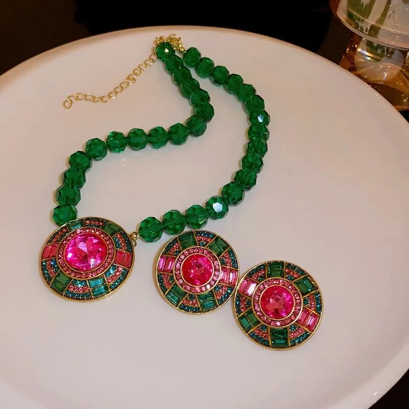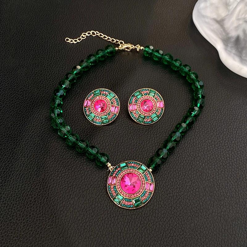 Collar de cadena de cristal facetado verde, colgante geométrico redondo, pendientes de botón, conjunto de joyas, collares de diamantes de imitación para fiesta