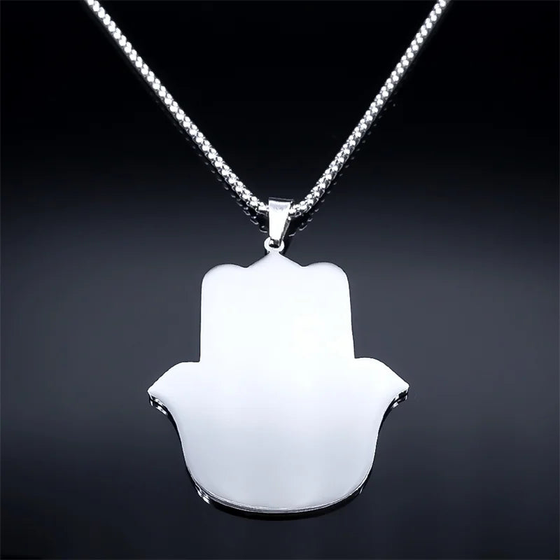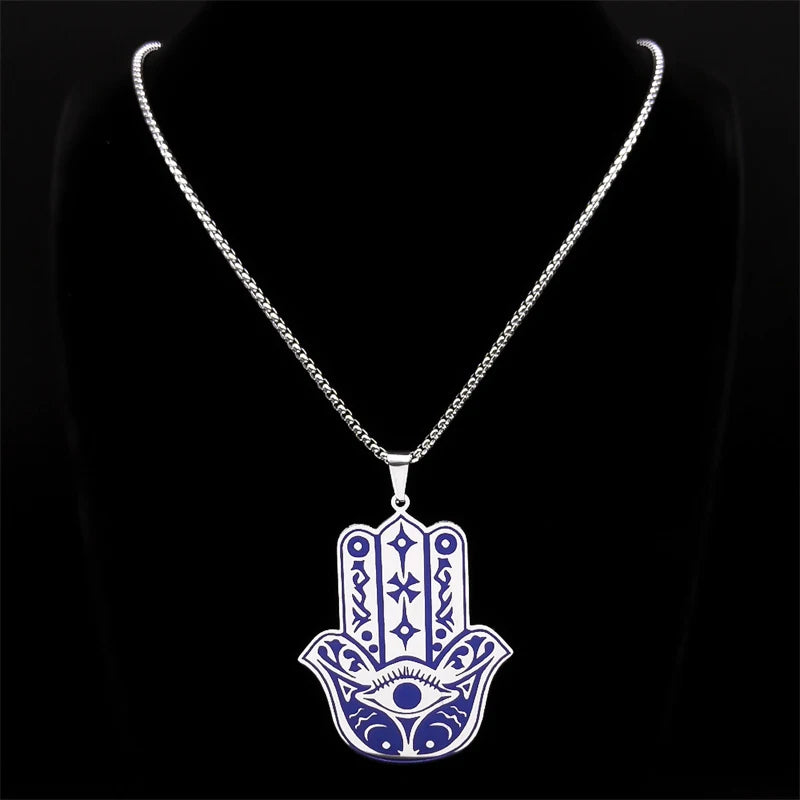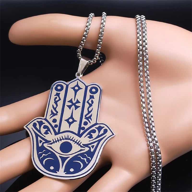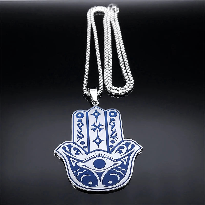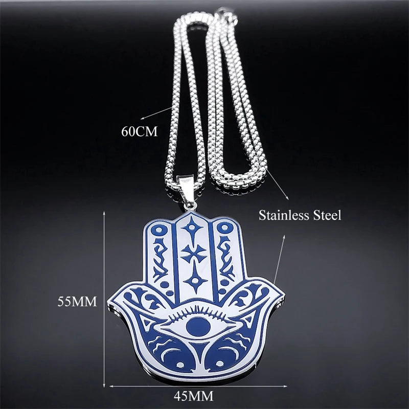 Collar de mano de Fátima Hamsa para mujer y hombre, de acero inoxidable, color azul, con ojo de pavo y pez, cadena larga, joyería
