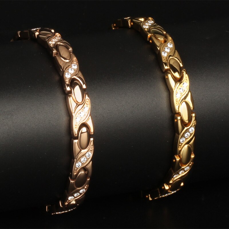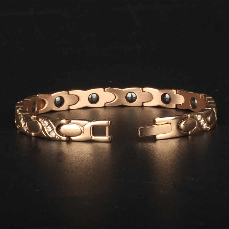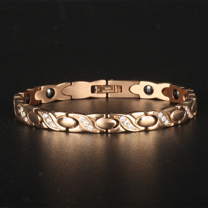 Pulseras de piedras magnéticas para terapia de salud para mujer, color oro rosa, acero inoxidable 316L y circonitas brillantes.